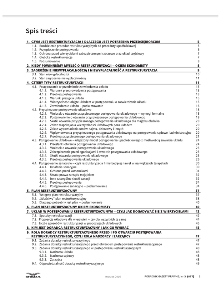 Spis treści 1. CZYM JEST RESTRUKTURYZACJA I DLACZEGO JEST POTRZEBNA PRZEDSIĘBIORCOM 1.1. Rozdzielenie procedur restrukturyzacyjnych od procedury upadłościowej 1.2. Przyspieszenie postępowania 1.3. Ochrona przed wierzycielami zabezpieczonymi rzeczowo oraz układ częściowy 1.4. Głęboka restrukturyzacja 1.5. Podsumowanie 2. KIEDY POWINNIŚMY MYŚLEĆ O RESTRUKTURYZACJI – OKIEM EKONOMISTY 3. ZAGROŻENIE NIEWYPŁACALNOŚCIĄ I NIEWYPŁACALNOŚĆ A RESTRUKTURYZACJA 3.1. Stan niewypłacalności 3.2. Stan zagrożenia niewypłacalnością 4. CZTERY TYPY RESTRUKTURYZACJI 4.1. Postępowanie w przedmiocie zatwierdzenia układu 4.1.1. Warunek przeprowadzenia postępowania 4.1.2. Przebieg postępowania 4.1.3. Warunki przyjęcia układu 4.1.4. Wierzytelności objęte układem w postępowaniu o zatwierdzenie układu 4.1.5. Zatwierdzenie układu – podsumowanie 4.2. Przyspieszone postępowanie układowe 4.2.1. Wniosek o otwarcie przyspieszonego postępowania układowego – wymogi formalne 4.2.2. Postanowienie o otwarciu przyspieszonego postępowania układowego 4.2.3. Skutki otwarcia przyspieszonego postępowania układowego dla majątku dłużnika 4.2.4. Zakaz zaspokajania wierzytelności układowych poza układem 4.2.5. Zakaz wypowiadania umów najmu, dzierżawy i innych 4.2.6. Wpływ otwarcia przyspieszonego postępowania układowego na postępowania sądowe i administracyjne 4.2.7. Przebieg przyspieszonego postępowania układowego 4.3. Postępowanie układowe – ulepszony model postępowania upadłościowego z możliwością zawarcia układu 4.3.1. Przesłanki otwarcia postępowania układowego 4.3.2. Wniosek o otwarcie postępowania układowego 4.3.3. Zabezpieczenie przed egzekucjami i otwarcie postępowania układowego 4.3.4. Skutki otwarcia postępowania układowego 4.3.5. Przebieg postępowania układowego 4.4. Postępowanie sanacyjne – czyli restrukturyzacja firmy będącej nawet w największych tarapatach 4.4.1. Działania sanacyjne 4.4.2. Ochrona przed komornikami 4.4.3. Utrata prawa zarządu majątkiem 4.4.4. Inne szczególne skutki sanacji 4.4.5. Przebieg postępowania 4.4.6. Postępowanie sanacyjne – podsumowanie 5. PLAN RESTRUKTURYZACYJNY 5.1. Wstępny plan restrukturyzacyjny 5.2. „Właściwy” plan restrukturyzacyjny 5.3. Dlaczego potrzebny jest plan – podsumowanie 6. PLAN RESTRUKTURYZACYJNY OKIEM EKONOMISTY 7. UKŁAD W POSTĘPOWANIU RESTRUKTURYZACYJNYM – CZYLI JAK DOGADYWAĆ SIĘ Z WIERZYCIELAMI 7.1. Sposoby restrukturyzacji 7.2. Propozycje układowe dla wierzycieli – czy dla wszystkich te same 7.3. Liczba sposobów restrukturyzacji w propozycjach układowych 8. KIM JEST DORADCA RESTRUKTURYZACYJNY I JAK GO WYBRAĆ 9. ROLA DORADCY RESTRUKTURYZACYJNEGO PRZED I PO OTWARCIU POSTĘPOWANIA RESTRUKTURYZACYJNEGO, CZYLI ROLA NADZORCY I ZARZĄDCY 9.1. Zadania doradcy restrukturyzacyjnego 9.2. Zadania doradcy restrukturyzacyjnego przed otwarciem postępowania restrukturyzacyjnego 9.3. Zadania doradcy restrukturyzacyjnego w postępowaniu restrukturyzacyjnym 9.3.1. Nadzorca układu 9.3.2. Nadzorca sądowy 9.3.3. Zarządca 9.4. Odpowiedzialność doradcy restrukturyzacyjnego marzec 2016 PORADNIK GAZETY PRAWNEJ nr 3 (877) 5 5 6 7 7 8 8 9 10 11 11 13 13 13 15 15 16 18 18 19 20 20 20 20 21 24 24 25 25 25 26 30 30 31 32 32 34 34 37 37 38 40 40 42 42 44 45 45 47 47 47 48 48 48 48 49 3 Spis treści 10. ZARZĄDCA W POSTĘPOWANIU SANACYJNYM 10.1. Kto może być zarządcą 10.2. Powołanie zarządcy 10.3. Termin pełnienia funkcji przez zarządcę 10.4. Obowiązki i uprawnienia zarządcy 11. NADZORCA UKŁADU I NADZORCA SĄDOWY 11.1. Nadzorca układu i nadzorca sądowy – zarys ogólny 11.2. Sposób powołania 11.3. Zakres kompetencji 12. WPŁYW POSTĘPOWANIA RESTRUKTURYZACYJNEGO NA PRZEDSIĘBIORSTWO 12.1. Skutki otwarcia postępowania restrukturyzacyjnego 12.2. Zarząd majątkiem dłużnika 12.3. Wpływ postępowania restrukturyzacyjnego na umowy 12.4. Restrukturyzacja zatrudnienia – czyli jaki los spotka pracowników dłużnika 13. OTWARCIE POSTĘPOWANIA RESTRUKTURYZACYJNEGO – SKUTKI DLA WIERZYCIELI 13.1. Wierzytelność a spis wierzytelności 13.1.1. Wierzytelności zamieszczane w spisie 13.1.2. Zgłoszenie wierzytelności przez wierzyciela 13.1.3. Brak wierzytelności w spisie – działania wierzyciela 13.2. Restrukturyzacja a postępowania zabezpieczające i egzekucyjne 13.3. Restrukturyzacja a postępowania sądowe 13.4. Zawarcie układu, czyli restrukturyzacja zobowiązań dłużnika 14. WPŁYW WIERZYCIELI NA POSTĘPOWANIE 14.1. Inicjatywa restrukturyzacyjna 14.2. Wyznaczenie nadzorcy lub zarządcy 14.3. Udział w radzie wierzycieli 14.4. Propozycje układowe 15. RADA WIERZYCIELI – CZYLI JAK KONTROLOWAĆ POSTĘPOWANIE RESTRUKTURYZACYJNE 15.1. Ustanowienie rady wierzycieli 15.2. Zmiana składu osobowego rady wierzycieli 15.3. Doradczo-kontrolne kompetencje rady wierzycieli 15.4. Uprawnienia rady wierzycieli o charakterze decyzyjnym 15.5. Zmiana nadzorcy sądowego albo zarządcy 16. KOMORNICY A RESTRUKTURYZACJA 16.1. Zabezpieczenie majątku dłużnika 16.2. Uchylenie zajęć rachunków bankowych 16.3. Zawieszenie i umorzenie egzekucji z mocy prawa 16.4. Uprzywilejowana pozycja wierzycieli zabezpieczonych rzeczowo 16.5. Zakres ochrony przeciwegzekucyjnej w poszczególnych postępowaniach 16.5.1. Postępowanie w przedmiocie zatwierdzenia układu 16.5.2. Przyspieszone postępowanie układowe 16.5.3. Postępowanie układowe 16.5.4. Postępowanie sanacyjne 17. ZBIEG WNIOSKU O UPADŁOŚĆ Z WNIOSKIEM RESTRUKTURYZACYJNYM – CZYLI CO PIERWSZE 17.1. Pierwszeństwo rozpoznania wniosku restrukturyzacyjnego 17.2. Wspólne rozpoznanie wniosku restrukturyzacyjnego i wniosku o upadłość 17.3. Ogłoszenie upadłości z pominięciem wniosku restrukturyzacyjnego 18. NIE TYLKO DORADCA RESTRUKTURYZACYJNY – DOBÓR KADRY DO PRZEPROWADZENIA RESTRUKTURYZACJI 19. POSTĘPOWANIE RESTRUKTURYZACYJNE OCZAMI KADRY ZARZĄDZAJĄCEJ – SKUTKI WSZCZĘCIA POSTĘPOWANIA DLA ZARZĄDU 19.1. Odpowiedzial
