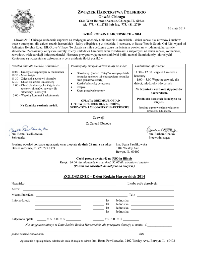 ZWIĄZEK HARCERSTWA POLSKIEGO Obwód Chicago 6434 West Belmont Avenue, Chicago, IL 60634 tel. 773. 481. 2718 lub fax. 773. 481. 2719 16 maja 2014 DZIEŃ RODZIN HARCERSKICH – 2014 Obwód ZHP Chicago serdecznie zaprasza na tradycyjne obchody Dnia Rodzin Harcerskich – dzień zabaw dla skrzatów i zuchów, wraz z atrakcjami dla całych rodzin harcerskich – który odbędzie się w niedzielę, 1 czerwca, w Busse Woods South, Gaj #26, wjazd od Arlington Heights Road, Elk Grove Village. To okazja na miłe spędzenie czasu na świeżym powietrzu w rodzinnej, harcerskiej atmosferze. Zapraszamy wszystkie skrzaty, zuchy i młodzież harcerską wraz z rodzicami i znajomymi na dzień zabaw, konkursów, zawodów, wiele atrakcji i niespodzianek! Harcerze przygotowują mecze siatkówki i piłki nożnej dla młodzieży i dorosłych! Konieczne są wcześniejsze zgłoszenia w celu ustalenia ilości posiłków. Rozkład dnia dla zuchów i skrzatów: Prosimy aby zuchy/młodzież miały ze sobą: Dodatkowe informacje: 10.00 – Uroczyste rozpoczęcie w mundurach 10.30 – Msza święta 11:30 – Zajęcia dla zuchów i skrzatów 12:30 – Obiad dla dzieci i młodzieży 1:00 – Obiad dla dorosłych / Zajęcia dla zuchów i skrzatów, zawody dla młodzieży i dorosłych 3:00 – Wspólny kominek i zakończenie 11:30 – 12.30 Zajęcia harcerek i harcerzy 1:00 – 3.00 Wspólne zawody dla dzieci, młodzieży i dorosłych Obozówkę: (hufiec „Tatry” obowiązuje biała koszulka zuchowa lub chorągwiana koszulka oraz granatowe szorty) Kurtkę/pelerynkę deszczową Czapkę Krem przeciwsłoneczny Na Kominku rozdanie stypendiów harcerskich. OPŁATA OBEJMUJE OBIAD I PODWIECZOREK DLA ZUCHÓW, SKRZATÓW I MŁODZIEŻY HARCERSKIEJ. Na Kominku rozdanie medali. Posiłki dla dorosłych do nabycia na miejscu. Prosimy o przywiezienie własnych krzesełek lub koców Czuwaj! Za Zarząd Obwodu hm. Barbara Chałko Przewodnicząca hm. Beata Pawlikowska Sekretarka Prosimy odesłać poniższe zgłoszenie wraz z opłatą do dnia 28 maja na adres: Dalsze informacje: 773.727.8174 hm. Beata Pawlikowska 3102 Wesley Ave. Bewyn, IL 60402 Czeki proszę wystawić na PSO in Illinois Koszt: $8.00 dla młodzieży harcerskiej, $5.00 dla skrzatów i zuchów (Posiłki dla dorosłych do nabycia na miejscu.) ZGŁOSZENIE – Dzień Rodzin Harcerskich 2014 Liczba osób dorosłych: Nazwisko: Adres: Miasto/Stan/Kod: Tel.: Imiona dzieci: Załączona opłata: lat lat lat lat x $ 5.00 = $ Jednostka: Jednostka: Jednostka: Jednostka: x $ 8.00 = $ Nie mogę uczestniczyć w Dniu Rodzin Rodzin Harcerskich, ale przesyłam donację w sumie: $ _______________ podpis rodziców/opiekunów data Zgłoszenie z opłatą należy odesłać do dnia 28 maja na adres: hm. Beata Pawlikowska, 3102 Wesley Ave., Berwyn, IL 60402