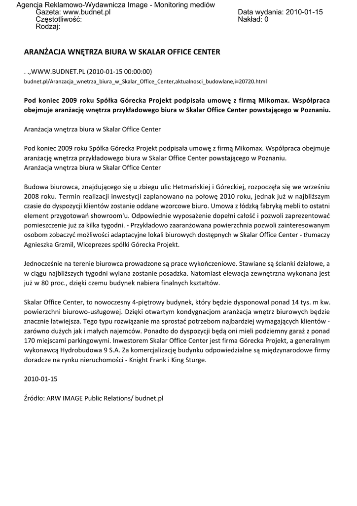 Agencja Reklamowo-Wydawnicza Image - Monitoring mediów Gazeta: www.budnet.pl Czêstotliwo¶æ: Rodzaj: Data wydania: 2010-01-15 Nak³ad: 0 ARANŻACJA WNĘTRZA BIURA W SKALAR OFFICE CENTER . .,WWW.BUDNET.PL (2010-01-15 00:00:00) budnet.pl/Aranzacja_wnetrza_biura_w_Skalar_Office_Center,aktualnosci_budowlane,i=20720.html Pod koniec 2009 roku Spółka Górecka Projekt podpisała umowę z firmą Mikomax. Współpraca obejmuje aranżację wnętrza przykładowego biura w Skalar Office Center powstającego w Poznaniu. Aranżacja wnętrza biura w Skalar Office Center Pod koniec 2009 roku Spółka Górecka Projekt podpisała umowę z firmą Mikomax. Współpraca obejmuje aranżację wnętrza przykładowego biura w Skalar Office Center powstającego w Poznaniu. Aranżacja wnętrza biura w Skalar Office Center Budowa biurowca, znajdującego się u zbiegu ulic Hetmańskiej i Góreckiej, rozpoczęła się we wrześniu 2008 roku. Termin realizacji inwestycji zaplanowano na połowę 2010 roku, jednak już w najbliższym czasie do dyspozycji klientów zostanie oddane wzorcowe biuro. Umowa z łódzką fabryką mebli to ostatni element przygotowań showroom'u. Odpowiednie wyposażenie dopełni całość i pozwoli zaprezentować pomieszczenie już za kilka tygodni. - Przykładowo zaaranżowana powierzchnia pozwoli zainteresowanym osobom zobaczyć możliwości adaptacyjne lokali biurowych dostępnych w Skalar Office Center - tłumaczy Agnieszka Grzmil, Wiceprezes spółki Górecka Projekt. Jednocześnie na terenie biurowca prowadzone są prace wykończeniowe. Stawiane są ścianki działowe, a w ciągu najbliższych tygodni wylana zostanie posadzka. Natomiast elewacja zewnętrzna wykonana jest już w 80 proc., dzięki czemu budynek nabiera finalnych kształtów. Skalar Office Center, to nowoczesny 4-piętrowy budynek, który będzie dysponował ponad 14 tys. m kw. powierzchni biurowo-usługowej. Dzięki otwartym kondygnacjom aranżacja wnętrz biurowych będzie znacznie łatwiejsza. Tego typu rozwiązanie ma sprostać potrzebom najbardziej wymagających klientów zarówno dużych jak i małych najemców. Ponadto do dyspozycji będą oni mieli podziemny garaż z ponad 170 miejscami parkingowymi. Inwestorem Skalar Office Center jest firma Górecka Projekt, a generalnym wykonawcą Hydrobudowa 9 S.A. Za komercjalizację budynku odpowiedzialne są międzynarodowe firmy doradcze na rynku nieruchomości - Knight Frank i King Sturge. 2010-01-15 Źródło: ARW IMAGE Public Relations/ budnet.pl