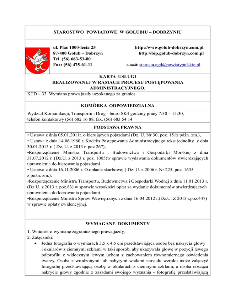 STAROSTWO POWIATOWE W GOLUBIU – DOBRZYNIU ul. Plac 1000-lecia 25 87-400 Golub – Dobrzyń Tel. (56) 683-53-80 Fax: (56) 475-61-11 http://www.golub-dobrzyn.com.pl http://bip.golub-dobrzyn.com.pl e-mail: [email protected] KARTA USŁUGI REALIZOWANEJ W RAMACH PROCESU POSTĘPOWANIA ADMINISTRACYJNEGO. KTD – 33 Wymiana prawa jazdy uzyskanego za granicą. KOMÓRKA ODPOWIEDZIALNA Wydział Komunikacji, Transportu i Dróg - biuro SK4 godziny pracy 7:30 – 15:30, telefon kontaktowy (56) 682 16 88, fax. (56) 683 54 14 PODSTAWA PRAWNA • Ustawa z dnia 05.01.2011r. o kierujących pojazdami (Dz. U. Nr 30, poz. 151z późn. zm.), • Ustawa z dnia 14.06.1960 r. Kodeks Postępowania Administracyjnego tekst jednolity z dnia 30.01.2013 r. ( Dz. U. z 2013 r. poz 267), •Rozporządzenie Ministra Transportu , Budownictwa i Gospodarki Morskiej z dnia 31.07.2012 r. (Dz.U. z 2013 r. poz. 1005)w sprawie wydawania dokumentów stwierdzających uprawnienia do kierowania pojazdami • Ustawa z dnia 16.11.2006 r. O opłacie skarbowej ( Dz. U. z 2006 r. Nr 225, poz. 1635 z późn. zm.). •Rozporządzenie Ministra Transportu, Budownictwa i Gospodarki Wodnej z dnia 11.01.2013 r. (Dz.U. z 2013 r. poz.83) w sprawie wysokości opłat za wydanie dokumentów stwierdzających uprawnienia do kierowania pojazdami. •Rozporządzenie Ministra Spraw Wewnętrznych z dnia 16.04.2012 r.(Dz.U. Z 2013 r.poz.447) w sprawie opłaty ewidencyjnej. WYMAGANE DOKUMENTY 1. Wniosek o wymianę zagranicznego prawa jazdy, 2. Załączniki: Jedna fotografia o wymiarach 3,5 x 4,5 cm przedstawiająca osobę bez nakrycia głowy i okularów z ciemnymi szkłami w taki sposób, aby ukazywała głowę w pozycji lewego półprofilu z widocznym lewym uchem z zachowaniem równomiernego oświetlenia twarzy. Osoba z wrodzonymi lub nabytymi wadami narządu wzroku może załączyć fotografię przedstawiającą osobę w okularach z ciemnymi szkłami, a osoba nosząca nakrycie głowy zgodnie z zasadami swojego wyznania - fotografię przedstawiającą osobę z nakryciem głowy, pod warunkiem, że fotografia taka zamieszczona jest w dokumencie potwierdzającym tożsamość tej osoby, Kserokopia prawa jazdy wraz z tłumaczeniem na język polski, sporządzonym lub poświadczonym przez tłumacza przysięgłego lub właściwego konsula Rzeczypospolitej Polskiej , 3. Do wglądu: Dowód osobisty, w przypadku obywatela polskiego, Karta pobytu, wiza pobytowa lub inny dokument potwierdzający posiadanie prawa pobytu na terytorium Rzeczypospolitej Polskiej albo zaświadczenie, że studiuje co najmniej od sześciu miesięcy, w przypadku cudzoziemca. SPOSÓB ZAŁATWIENIA SPRAWY 1. Wniosek o wymianę prawa jazdy wraz z załącznikami otrzymywany jest za pośrednictwem wojewódzkiego ośrodka ruchu drogowego po zdanym egzaminie w zakresie części teoretycznej. 2. Zdanie części teoretycznej egzaminu państwowego nie jest konieczne w przypadku gdy zagraniczny dokument prawa jazdy wydany jest przez: Państwo będące członkiem UE Konfederację Szwajcarską Państwo członkowskie Europejskiego Porozumienia o Wolnym Handlu (EFTA) stroną umowy o Europejskim Obszarze Gospodarczym Państwo stroną Konwencji o Ruchu Drogowym lub dokument prawa jazdy odpowiadający wzorowi określonemu w tych konwencjach. 3. W przypadku prawa jazdy wydanego przez państwo niebędące państwem członkowskim Unii Europejskiej urząd obowiązany jest o potwierdzenie danych zawartych w dokumencie. 4. Przy odbiorze nowego dokumentu należy zwrócić poprzednie prawo jazdy. OPŁATY Za prawo jazdy - 100,00 zł + 0,50 zł opłata ewidencyjna. Opłatę należy wpłacić w Oddziale Banku Spółdzielczego przy ul. Plac Tysiąclecia 25 (parter, przy wejściu głównym od strony bankomatu) czynne: pon.- pt. od 8.00 do 14.30, na konto bankowe: - 100,00 zł na nr konta: 57 9551 0002 0105 2126 2000 0001 - 0,50 zł na nr konta: 78 9551 0002 0105 2126 2000 0011 bądź za pomocą kart płatniczych w Wydziale Komunikacji, Transportu i Dróg. Pełnomocnictwo – 17,00 zł Powyższe pełnomocnictwo wymagane jest w przypadku gdy strona nie może osobiście stawić się w urzędzie. Pełnomocnictwo nie podlega opłacie jeżeli udzielone jest małżonkowi, rodzeństwu, wstępnemu lub zstępnemu. Opłatę uiszcza się w kasie Urzędu Miasta czynna codziennie w godz. od 8.00 do 14.00 lub na nr konta: 35 9551 0002 0100 2219 2000 0001. SPOSÓB DOSTARCZENIA DOKUMENTÓW Wniosek wraz ze wszystkimi załącznikami składa się osobiście wraz z dowodem osobistym lub przez pełnomocnika. Za pomocą elektronicznej skrzynki podawczej na platformie ePuap, dołączając zamieszczone formularze do załatwienia danej sprawy, do formularza ogólnego (osoby posiadające podpis elektroniczny lub profil zaufany na platformie E-Puap). MIEJSCE ZŁOŻENIA DOKUMENTÓW Wniosek składa się w Wydziale Komunikacji, Transportu i Dróg w Starostwie Powiatowym w Golubiu-Dobrzyniu - biuro uprawnień. Drogą elektroniczną, na adres internetowy www.bip.gov.pl (osoby posiadające podpis elektroniczny). TERMIN ZAŁATWIENIA SPRAWY Od momentu złożenia dokumentów w terminie do 30 dni. TRYB ODWOŁAWCZY Od decyzji służy stronie odwołanie do Samorządowego Kolegium Odwoławczego w Toruniu, w terminie 14 dni od daty doręczenia decyzji stronie, za pośrednictwem Starosty GolubskoDobrzyńskiego. FORMULARZ DO POBRANIA Wniosek o wydanie prawa jazdy. REJESTR ZMIAN Zmianie uległ : 1. numer konta bankowego Starostwa Powiatowego z 25102050240000160200101220 na 57955100020105212620000001 2. numer konta bankowego Urzędu Miasta z: 10 1020 5024 0000 1002 0010 1105 na: 35 9551 0002 0100 2219 2000 0001. numer telefonu z (56) 683 54 14 na (56) 682 16 88. Opłata za wydanie prawa jazdy z 84 zł na 100zł.