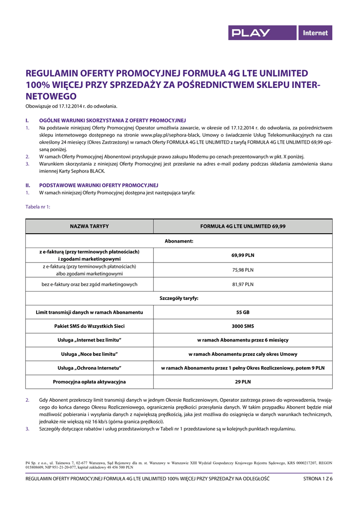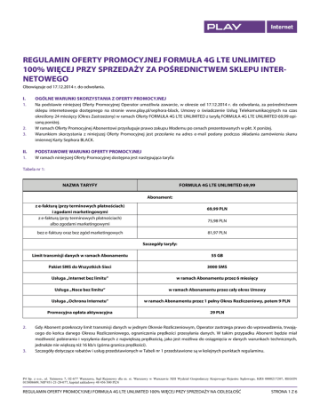 REGULAMIN OFERTY PROMOCYJNEJ FORMUŁA 4G LTE UNLIMITED 100% WIĘCEJ PRZY SPRZEDAŻY ZA POŚREDNICTWEM SKLEPU INTERNETOWEGO Obowiązuje od 17.12.2014 r. do odwołania. I. OGÓLNE WARUNKI SKORZYSTANIA Z OFERTY PROMOCYJNEJ 1. Na podstawie niniejszej Oferty Promocyjnej Operator umożliwia zawarcie, w okresie od 17.12.2014 r. do odwołania, za pośrednictwem sklepu internetowego dostępnego na stronie www.play.pl/sephora-black, Umowy o świadczenie Usług Telekomunikacyjnych na czas określony 24 miesięcy (Okres Zastrzeżony) w ramach Oferty FORMUŁA 4G LTE UNLIMITED z taryfą FORMUŁA 4G LTE UNLIMITED 69,99 opisaną poniżej. W ramach Oferty Promocyjnej Abonentowi przysługuje prawo zakupu Modemu po cenach prezentowanych w pkt. X poniżej. Warunkiem skorzystania z niniejszej Oferty Promocyjnej jest przesłanie na adres e-mail podany podczas składania zamówienia skanu imiennej Karty Sephora BLACK. 2. 3. II. PODSTAWOWE WARUNKI OFERTY PROMOCYJNEJ 1. W ramach niniejszej Oferty Promocyjnej dostępna jest następująca taryfa: Tabela nr 1: NAZWA TARYFY FORMUŁA 4G LTE UNLIMITED 69,99 Abonament: z e-fakturą (przy terminowych płatnościach) i zgodami marketingowymi z e-fakturą (przy terminowych płatnościach) albo zgodami marketingowymi 69,99 PLN 75,98 PLN bez e-faktury oraz bez zgód marketingowych 81,97 PLN Szczegóły taryfy: 2. 3. Limit transmisji danych w ramach Abonamentu 55 GB Pakiet SMS do Wszystkich Sieci 3000 SMS Usługa „Internet bez limitu” w ramach Abonamentu przez 6 miesięcy Usługa „Noce bez limitu” w ramach Abonamentu przez cały okres Umowy Usługa „Ochrona Internetu” w ramach Abonamentu przez 1 pełny Okres Rozliczeniowy, potem 9 PLN Promocyjna opłata aktywacyjna 29 PLN Gdy Abonent przekroczy limit transmisji danych w jednym Okresie Rozliczeniowym, Operator zastrzega prawo do wprowadzenia, trwającego do końca danego Okresu Rozliczeniowego, ograniczenia prędkości przesyłania danych. W takim przypadku Abonent będzie miał możliwość pobierania i wysyłania danych z największą prędkością, jaka jest możliwa do osiągnięcia w danych warunkach technicznych, jednakże nie większą niż 16 kb/s (górna granica prędkości). Szczegóły dotyczące rabatów i usług przedstawionych w Tabeli nr 1 przedstawione są w kolejnych punktach regulaminu. P4 Sp. z o.o., ul. Taśmowa 7, 02-677 Warszawa, Sąd Rejonowy dla m. st. Warszawy w Warszawie XIII Wydział Gospodarczy Krajowego Rejestru Sądowego, KRS 0000217207, REGON 015808609, NIP 951-21-20-077, kapitał zakładowy 48 456 500 PLN REGULAMIN OFERTY PROMOCYJNEJ FORMUŁA 4G LTE UNLIMITED 100% WIĘCEJ PRZY SPRZEDAŻY NA ODLEGŁOŚĆ STRONA 1 Z 6 SZCZEGÓŁOWE WARUNKI OFERTY III. RABAT Z TYTUŁU AKTYWACJI E-FAKTURY I TERMINOWYCH PŁATNOŚCI ORAZ WYRAŻENIA ZGÓD MARKETINGOWYCH 1. 7. Osoby, które wyrażą zgodę na wystawianie i otrzymywanie faktur w formie elektronicznej (e-faktura) oraz będą dokonywały terminowych płatności należności wynikających z każdorazowo wystawionego Rachunku Telekomunikacyjnego otrzymają rabat na Abonament za kolejny Okres Rozliczeniowy w wysokości 5,99 PLN. Osoby, które udzielą obu zgód marketingowych określonych w ust. 3 poniżej, otrzymają rabat na Abonament za każdy Okres Rozliczeniowy w wysokości 5,99 PLN. Zgody marketingowe, o których mowa w ust. 2 powyżej, brzmią następująco: 3.1. Wyrażam zgodę na otrzymywanie informacji, w tym w szczególności o nowych ofertach promocyjnych, produktach, usługach i konkursach oraz innych informacji handlowych za pomocą środków komunikacji elektronicznej, w szczególności przy użyciu automatycznych systemów wywołujących. Oświadczenie jest niezależne od czasu obowiązywania Umowy o świadczenie Usług Telekomunikacyjnych. 3.2. Wyrażam zgodę na przetwarzanie danych transmisyjnych dla celów marketingu usług telekomunikacyjnych. Dane te będą przetwarzane w okresie obowiązywania Umowy o świadczenie Usług Telekomunikacyjnych. Abonent może w każdej chwili odwołać zgody opisane w ustępach 1-3 powyżej. Odwołanie zgody na e-fakturę powoduje utratę rabatu zgodnie z ust. 5 poniżej. Rabat na Abonament z tytułu e-faktury i terminowych płatności przyznawany jest na następujących zasadach: 5.1. Z zastrzeżeniem pkt. 5.2. poniżej, rabat z tytułu aktywacji e-faktury jest przyznawany przez cały Okres Zastrzeżony oraz po przekształceniu Umowy w Umowę zawartą na czas nieokreślony. 5.2. Pierwszy rabat w wysokości 5,99 PLN przyznawany jest w odniesieniu do sumy kwot Abonamentów za dwa pierwsze Okresy Rozliczeniowe, uwidocznionej na pierwszym Rachunku Telekomunikacyjnym. Przyznanie rabatu za ten okres nie jest uzależnione od spełnienia warunku polegającego na terminowej płatności. 5.3. Rabat dotyczy tylko Abonamentu. Wszystkie pozostałe opłaty będą naliczane zgodnie z Cennikiem Oferty FORMUŁA 4G LTE UNLIMITED. 5.4. Rabat jest naliczany w sytuacji uiszczania przez Abonenta terminowych płatności wynikających z Rachunku Telekomunikacyjnego. W przypadku nieuiszczenia należności wynikającej z Rachunku Telekomunikacyjnego w terminie określonym w Rachunku Telekomunikacyjnym, Abonent może utracić dodatkowy rabat w kolejnym Okresie Rozliczeniowym, przypadającym po terminie płatności. Dodatkowy rabat zostanie ponownie przyznany, jeżeli płatność należności za kolejny Okres Rozliczeniowy zostanie uiszczona w terminie – w takim przypadku przyznanie dodatkowego rabatu następuje w odniesieniu do kolejnego Okresu Rozliczeniowego, przypadającego po terminie płatności należności wynikającej z kolejnego Rachunku Telekomunikacyjnego. 5.5. W przypadku aktywacji elektronicznej faktury (e-faktura) podczas trwania Umowy, rabat nie zostanie naliczony przy kolejnym Okresie Rozliczeniowym, jeżeli Abonent nie dokona aktywacji usługi na co najmniej pięć dni przed końcem poprzedniego Okresu Rozliczeniowego. 5.6. Jeśli aktywacja usługi nastąpi po piątym dniu przed końcem Okresu Rozlicz