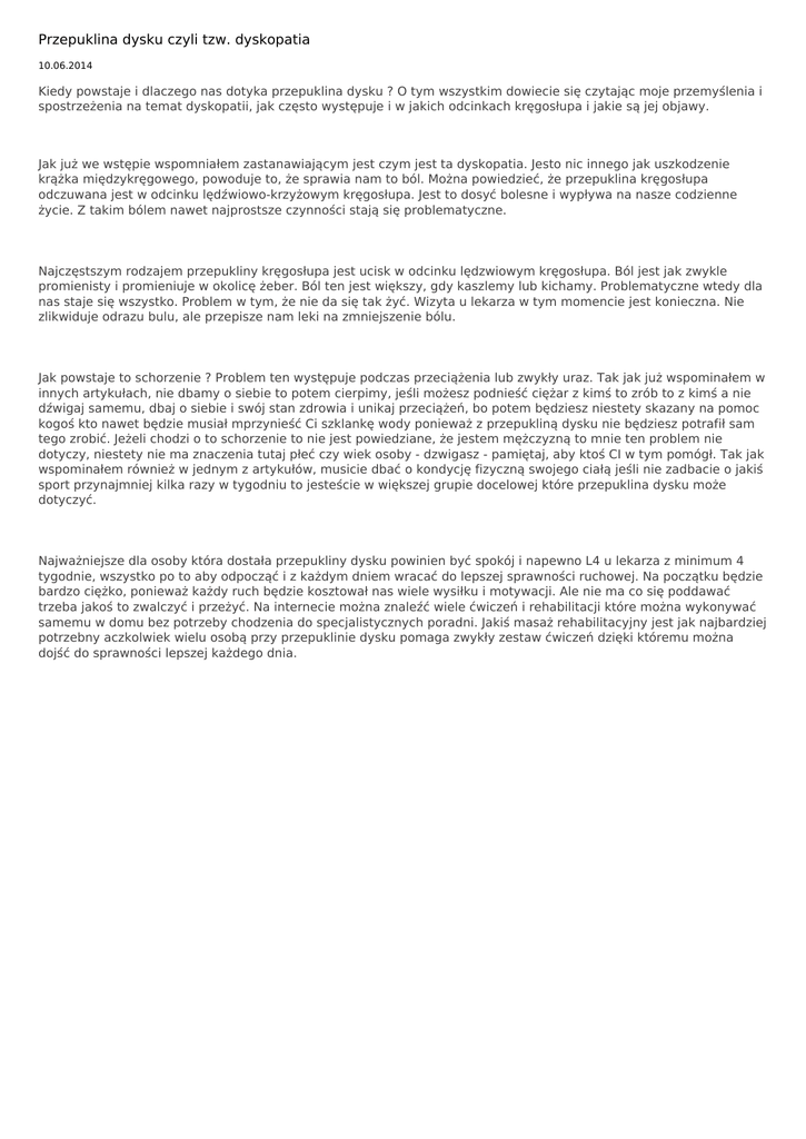 Przepuklina dysku czyli tzw. dyskopatia 10.06.2014 Kiedy powstaje i dlaczego nas dotyka przepuklina dysku ? O tym wszystkim dowiecie się czytając moje przemyślenia i spostrzeżenia na temat dyskopatii, jak często występuje i w jakich odcinkach kręgosłupa i jakie są jej objawy. Jak już we wstępie wspomniałem zastanawiającym jest czym jest ta dyskopatia. Jesto nic innego jak uszkodzenie krążka międzykręgowego, powoduje to, że sprawia nam to ból. Można powiedzieć, że przepuklina kręgosłupa odczuwana jest w odcinku lędźwiowo-krzyżowym kręgosłupa. Jest to dosyć bolesne i wypływa na nasze codzienne życie. Z takim bólem nawet najprostsze czynności stają się problematyczne. Najczęstszym rodzajem przepukliny kręgosłupa jest ucisk w odcinku lędzwiowym kręgosłupa. Ból jest jak zwykle promienisty i promieniuje w okolicę żeber. Ból ten jest większy, gdy kaszlemy lub kichamy. Problematyczne wtedy dla nas staje się wszystko. Problem w tym, że nie da się tak żyć. Wizyta u lekarza w tym momencie jest konieczna. Nie zlikwiduje odrazu bulu, ale przepisze nam leki na zmniejszenie bólu. Jak powstaje to schorzenie ? Problem ten występuje podczas przeciążenia lub zwykły uraz. Tak jak już wspominałem w innych artykułach, nie dbamy o siebie to potem cierpimy, jeśli możesz podnieść ciężar z kimś to zrób to z kimś a nie dźwigaj samemu, dbaj o siebie i swój stan zdrowia i unikaj przeciążeń, bo potem będziesz niestety skazany na pomoc kogoś kto nawet będzie musiał mprzynieść Ci szklankę wody ponieważ z przepukliną dysku nie będziesz potrafił sam tego zrobić. Jeżeli chodzi o to schorzenie to nie jest powiedziane, że jestem mężczyzną to mnie ten problem nie dotyczy, niestety nie ma znaczenia tutaj płeć czy wiek osoby - dzwigasz - pamiętaj, aby ktoś CI w tym pomógł. Tak jak wspominałem również w jednym z artykułów, musicie dbać o kondycję fizyczną swojego ciałą jeśli nie zadbacie o jakiś sport przynajmniej kilka razy w tygodniu to jesteście w większej grupie docelowej które przepuklina dysku może dotyczyć. Najważniejsze dla osoby która dostała przepukliny dysku powinien być spokój i napewno L4 u lekarza z minimum 4 tygodnie, wszystko po to aby odpocząć i z każdym dniem wracać do lepszej sprawności ruchowej. Na początku będzie bardzo ciężko, ponieważ każdy ruch będzie kosztował nas wiele wysiłku i motywacji. Ale nie ma co się poddawać trzeba jakoś to zwalczyć i przeżyć. Na internecie można znaleźć wiele ćwiczeń i rehabilitacji które można wykonywać samemu w domu bez potrzeby chodzenia do specjalistycznych poradni. Jakiś masaż rehabilitacyjny jest jak najbardziej potrzebny aczkolwiek wielu osobą przy przepuklinie dysku pomaga zwykły zestaw ćwiczeń dzięki któremu można dojść do sprawności lepszej każdego dnia. Powered by TCPDF (www.tcpdf.org)