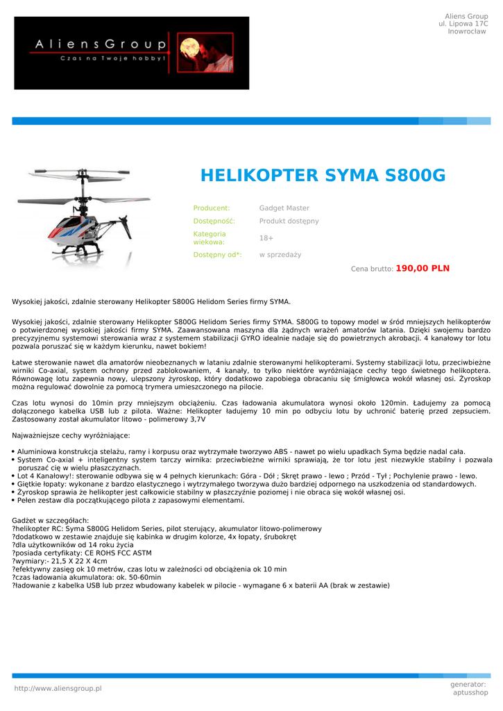 Aliens Group ul. Lipowa 17C Inowrocław HELIKOPTER SYMA S800G Producent: Gadget Master Dostępność: Produkt dostępny Kategoria wiekowa: 18+ Dostępny od*: w sprzedaży Cena brutto: 190,00 PLN Wysokiej jakości, zdalnie sterowany Helikopter S800G Helidom Series firmy SYMA. Wysokiej jakości, zdalnie sterowany Helikopter S800G Helidom Series firmy SYMA. S800G to topowy model w śród mniejszych helikopterów o potwierdzonej wysokiej jakości firmy SYMA. Zaawansowana maszyna dla żądnych wrażeń amatorów latania. Dzięki swojemu bardzo precyzyjnemu systemowi sterowania wraz z systemem stabilizacji GYRO idealnie nadaje się do powietrznych akrobacji. 4 kanałowy tor lotu pozwala poruszać się w każdym kierunku, nawet bokiem! Łatwe sterowanie nawet dla amatorów nieobeznanych w lataniu zdalnie sterowanymi helikopterami. Systemy stabilizacji lotu, przeciwbieżne wirniki Co-axial, system ochrony przed zablokowaniem, 4 kanały, to tylko niektóre wyróżniające cechy tego świetnego helikoptera. Równowagę lotu zapewnia nowy, ulepszony żyroskop, który dodatkowo zapobiega obracaniu się śmigłowca wokół własnej osi. Żyroskop można regulować dowolnie za pomocą trymera umieszczonego na pilocie. Czas lotu wynosi do 10min przy mniejszym obciążeniu. Czas ładowania akumulatora wynosi około 120min. Ładujemy za pomocą dołączonego kabelka USB lub z pilota. Ważne: Helikopter ładujemy 10 min po odbyciu lotu by uchronić baterię przed zepsuciem. Zastosowany został akumulator litowo - polimerowy 3,7V Najważniejsze cechy wyróżniające: Aluminiowa konstrukcja stelażu, ramy i korpusu oraz wytrzymałe tworzywo ABS - nawet po wielu upadkach Syma będzie nadal cała. System Co-axial + inteligentny system tarczy wirnika: przeciwbieżne wirniki sprawiają, że tor lotu jest niezwykle stabilny i pozwala poruszać cię w wielu płaszczyznach. Lot 4 Kanałowy!: sterowanie odbywa się w 4 pełnych kierunkach: Góra - Dół ; Skręt prawo - lewo ; Przód - Tył ; Pochylenie prawo - lewo. Giętkie łopaty: wykonane z bardzo elastycznego i wytrzymałego tworzywa dużo bardziej odpornego na uszkodzenia od standardowych. Żyroskop sprawia że helikopter jest całkowicie stabilny w płaszczyźnie poziomej i nie obraca się wokół własnej osi. Pełen zestaw dla początkującego pilota z zapasowymi elementami. Gadżet w szczegółach: ?helikopter RC: Syma S800G Helidom Series, pilot sterujący, akumulator litowo-polimerowy ?dodatkowo w zestawie znajduje się kabinka w drugim kolorze, 4x łopaty, śrubokręt ?dla użytkowników od 14 roku życia ?posiada certyfikaty: CE ROHS FCC ASTM ?wymiary:- 21,5 X 22 X 4cm ?efektywny zasięg ok 10 metrów, czas lotu w zależności od obciążenia ok 10 min ?czas ładowania akumulatora: ok. 50-60min ?ładowanie z kabelka USB lub przez wbudowany kabelek w pilocie - wymagane 6 x baterii AA (brak w zestawie) http://www.aliensgroup.pl generator: aptusshop