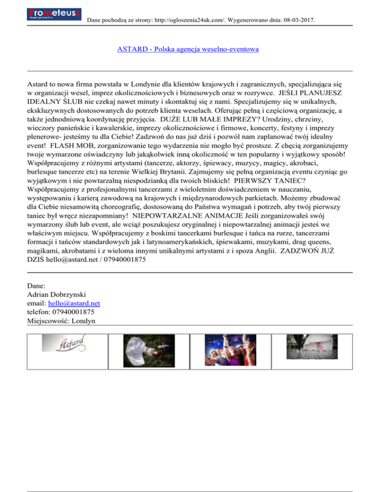 Dane pochodzą ze strony: http://ogloszenia24uk.com/. Wygenerowano dnia: 08-03-2017. ASTARD - Polska agencja weselno-eventowa Astard to nowa firma powstała w Londynie dla klientów krajowych i zagranicznych, specjalizująca się w organizacji wesel, imprez okolicznościowych i biznesowych oraz w rozrywce. JEŚLI PLANUJESZ IDEALNY ŚLUB nie czekaj nawet minuty i skontaktuj się z nami. Specjalizujemy się w unikalnych, ekskluzywnych dostosowanych do potrzeb klienta weselach. Oferując pełną i częściową organizację, a także jednodniową koordynację przyjęcia. DUŻE LUB MAŁE IMPREZY? Urodziny, chrzciny, wieczory panieńskie i kawalerskie, imprezy okolicznościowe i firmowe, koncerty, festyny i imprezy plenerowe- jesteśmy tu dla Ciebie! Zadzwoń do nas już dziś i pozwól nam zaplanować twój idealny event! FLASH MOB, zorganizowanie tego wydarzenia nie mogło być prostsze. Z chęcią zorganizujemy twoje wymarzone oświadczyny lub jakąkolwiek inną okoliczność w ten popularny i wyjątkowy sposób! Współpracujemy z różnymi artystami (tancerze, aktorzy, śpiewacy, muzycy, magicy, akrobaci, burlesque tancerze etc) na terenie Wielkiej Brytanii. Zajmujemy się pełną organizacją eventu czyniąc go wyjątkowym i nie powtarzalną niespodzianką dla twoich bliskich! PIERWSZY TANIEC? Współpracujemy z profesjonalnymi tancerzami z wieloletnim doświadczeniem w nauczaniu, występowaniu i karierą zawodową na krajowych i międzynarodowych parkietach. Możemy zbudować dla Ciebie niesamowitą choreografię, dostosowaną do Państwa wymagań i potrzeb, aby twój pierwszy taniec był wręcz niezapomniany! NIEPOWTARZALNE ANIMACJE Jeśli zorganizowałeś swój wymarzony ślub lub event, ale wciąż poszukujesz oryginalnej i niepowtarzalnej animacji jesteś we właściwym miejscu. Współpracujemy z boskimi tancerkami burlesque i tańca na rurze, tancerzami formacji i tańców standardowych jak i latynoamerykańskich, śpiewakami, muzykami, drag queens, magikami, akrobatami i z wieloma innymi unikalnymi artystami z i spoza Anglii. ZADZWOŃ JUŻ DZIŚ [email protected] / 07940001875 Dane: Adrian Dobrzynski email: [email protected] telefon: 07940001875 Miejscowość: Londyn