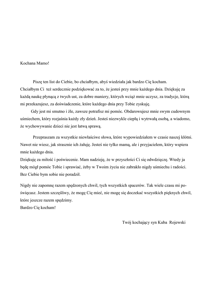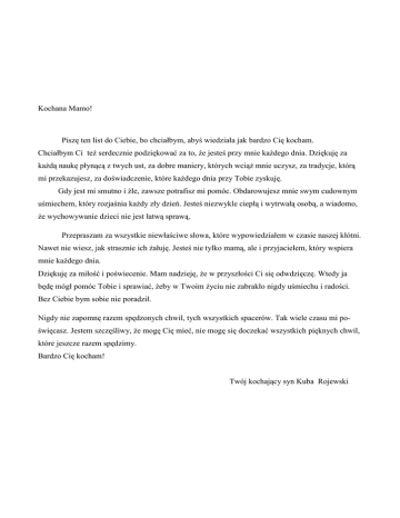 Kochana Mamo! Piszę ten list do Ciebie, bo chciałbym, abyś wiedziała jak bardzo Cię kocham. Chciałbym Ci teŜ serdecznie podziękować za to, Ŝe jesteś przy mnie kaŜdego dnia. Dziękuję za kaŜdą naukę płynącą z twych ust, za dobre maniery, których wciąŜ mnie uczysz, za tradycje, którą mi przekazujesz, za doświadczenie, które kaŜdego dnia przy Tobie zyskuję. Gdy jest mi smutno i źle, zawsze potrafisz mi pomóc. Obdarowujesz mnie swym cudownym uśmiechem, który rozjaśnia kaŜdy zły dzień. Jesteś niezwykle ciepłą i wytrwałą osobą, a wiadomo, Ŝe wychowywanie dzieci nie jest łatwą sprawą. Przepraszam za wszystkie niewłaściwe słowa, które wypowiedziałem w czasie naszej kłótni. Nawet nie wiesz, jak strasznie ich Ŝałuję. Jesteś nie tylko mamą, ale i przyjacielem, który wspiera mnie kaŜdego dnia. Dziękuję za miłość i poświecenie. Mam nadzieję, Ŝe w przyszłości Ci się odwdzięczę. Wtedy ja będę mógł pomóc Tobie i sprawiać, Ŝeby w Twoim Ŝyciu nie zabrakło nigdy uśmiechu i radości. Bez Ciebie bym sobie nie poradził. Nigdy nie zapomnę razem spędzonych chwil, tych wszystkich spacerów. Tak wiele czasu mi poświęcasz. Jestem szczęśliwy, Ŝe mogę Cię mieć, nie mogę się doczekać wszystkich pięknych chwil, które jeszcze razem spędzimy. Bardzo Cię kocham! Twój kochający syn Kuba Rojewski