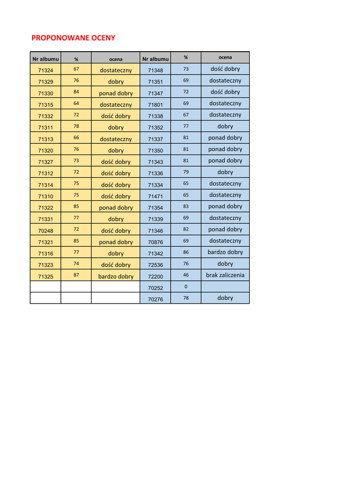 PROPONOWANE OCENY Nr albumu % ocena Nr albumu % ocena 71324 67 dostateczny 71348 73 dość dobry 71329 76 dobry 71351 69 dostateczny 71330 84 ponad dobry 71347 72 dość dobry 71315 64 dostateczny 71801 69 dostateczny 71332 72 dość dobry 71338 67 dostateczny 71311 78 dobry 71352 77 dobry 71313 66 dostateczny 71337 81 ponad dobry 71320 76 dobry 71350 81 ponad dobry 71327 73 dość dobry 71343 81 ponad dobry 71312 72 dość dobry 71336 79 dobry 71314 75 dość dobry 71334 65 dostateczny 71310 75 dość dobry 71471 65 dostateczny 71322 85 ponad dobry 71354 83 ponad dobry 71331 77 dobry 71339 69 dostateczny 70248 72 dość dobry 71346 82 ponad dobry 71321 85 ponad dobry 70876 69 dostateczny 71316 77 dobry 71342 86 bardzo dobry 71323 74 dość dobry 72536 76 dobry 71325 87 bardzo dobry 72200 46 brak zaliczenia 70252 0 70276 78 dobry