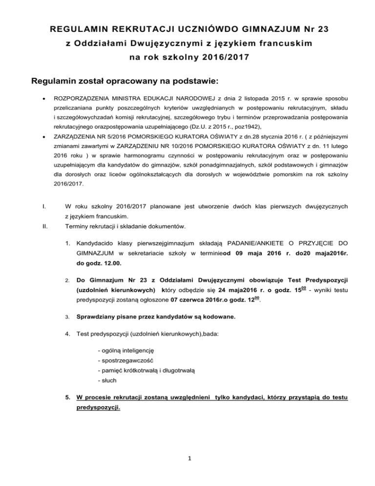 REGULAMIN REKRUTACJI UCZNIÓWDO GIMNAZJUM Nr 23 z Oddziałami Dwujęzycznymi z językiem francuskim na rok szkolny 2016/2017 Regulamin został opracowany na podstawie: ROZPORZĄDZENIA MINISTRA EDUKACJI NARODOWEJ z dnia 2 listopada 2015 r. w sprawie sposobu przeliczaniana punkty poszczególnych kryteriów uwzględnianych w postępowaniu rekrutacyjnym, składu i szczegółowychzadań komisji rekrutacyjnej, szczegółowego trybu i terminów przeprowadzania postępowania rekrutacyjnego orazpostępowania uzupełniającego (Dz.U. z 2015 r., poz1942), ZARZĄDZENIA NR 5/2016 POMORSKIEGO KURATORA OŚWIATY z dn.28 stycznia 2016 r. ( z późniejszymi zmianami zawartymi w ZARZĄDZENIU NR 10/2016 POMORSKIEGO KURATORA OŚWIATY z dn. 11 lutego 2016 roku ) w sprawie harmonogramu czynności w postępowaniu rekrutacyjnym oraz w postępowaniu uzupełniającym dla kandydatów do gimnazjów, szkół ponadgimnazjalnych, szkół podstawowych i gimnazjów dla dorosłych oraz liceów ogólnokształcących dla dorosłych w województwie pomorskim na rok szkolny 2016/2017. I. W roku szkolny 2016/2017 planowane jest utworzenie dwóch klas pierwszych dwujęzycznych z językiem francuskim. II. Terminy rekrutacji i składanie dokumentów. 1. Kandydacido klasy pierwszejgimnazjum składają PADANIE/ANKIETE O PRZYJĘCIE DO GIMNAZJUM w sekretariacie szkoły w terminieod 09 maja 2016 r. do20 maja2016r. do godz. 12.00. 2. Do Gimnazjum Nr 23 z Oddziałami Dwujęzycznymi obowiązuje Test Predyspozycji (uzdolnień kierunkowych) który odbędzie się 24 maja2016 r. o godz. 15 00 - wyniki testu 00 predyspozycji zostaną ogłoszone 07 czerwca 2016r.o godz. 12 . 3. Sprawdziany pisane przez kandydatów są kodowane. 4. Test predyspozycji (uzdolnień kierunkowych),bada: - ogólną inteligencję - spostrzegawczość - pamięć krótkotrwałą i długotrwałą - słuch 5. W procesie rekrutacji zostaną uwzględnieni tylko kandydaci, którzy przystąpią do testu predyspozycji. 1 00 6. Od 24 czerwca 2016r. do 28 czerwca 2016r. do godziny 12 , absolwenci szkół podstawowych dostarczają: - świadectwa ukończenia szkoły, - zaświadczenia przystąpienia do sprawdzianu zewnętrznego, - odpis skróconego aktu urodzenia, - 3 zdjęcia. 00 7. 1 lipca 2016 r. o godzinie 12 ogłoszenie listy kandydatówzakwalifikowanych i kandydatów niezakwalifikowanych do klasy pierwszej gimnazjum dwujęzycznego z językiem francuskim. 00 8. Od 01 lipca 2016 r. od godz.12 00 do 05 lipca 2016 r. do godz.15 potwierdzenie przez rodzica kandydata woli przyjęcia w postaci przedłożenia oryginału świadectwa ukończenia szkoły podstawowej i oryginału zaświadczenia o wynikach sprawdzianu, o ile nie zostały złożone w uzupełnieniu wniosku o przyjęcie do gimnazjum. 00 9. 06 lipca 2016 r. o godz. 12 ogłoszenie listy kandydatów przyjętych i kandydatów nieprzyjętych do gimnazjum. III. Sposób przeliczenia na punkty poszczególnych kryteriów uwzględnianych w procesie rekrutacji. 1. O przyjęciu kandydata do pierwszej klasy Gimnazjum Nr 23 z Oddziałami Dwujęzycznymi decyduje suma punktów, której składnikami są: a) punkty uzyskane z testu predyspozycji (uzdolnień kierunkowych)- maksymalna liczba punktów możliwych do uzyskania 200 b) wynik sprawdzianu przedstawiony w procentach z części pierwszej i wynik przedstawiony w procentach z części drugiej sprawdzianu mnoży się przez 0,2. c) za świadectwo ukończenia szkoły podstawowej z wyróżnieniem przyznaje się 5 punktów. d) uzyskanie w zawodach wiedzy będących konkursem o zasięgu ponadwojewódzkim organizowanym przez kuratorów oświaty na podstawie zawartych porozumień: - tytułu finalisty konkursu przedmiotowego – przyznaje się 10 punktów, - tytułu laureata konkursu tematycznego lub interdyscyplinarnego – przyznaje się7 punktów, - tytułu finalisty konkursu tematycznego lub interdyscyplinarnego – przyznaje się5 punktów; e) uzyskanie w zawodach wiedzy będących konkursem o zasięgu międzynarodowym lub ogólnopolskim albo turniejem o zasięgu ogólnopolskim, przeprowadzanymi zgodniez przepisami wydanymi na podstawie art. 32a ust. 4 i art. 22 ust. 2 pkt 8 ustawy: - tytułu finalisty konkursu z przedmiotu lub przedmiotów artystycznych objętych ramowym planem nauczania szkoły artystycznej – przyznaje się 10 punktów, - tytułu laureata turnieju z przedmiotu lub przedmiotów artystycznych nieobjętych ramowym planem nauczania szkoły artystycznej – przyznaje się 4 punkty, 2 - tytuł finalisty turnieju z przedmiotu lub przedmiotów artystycznych nieobjętych ramowym planem nauczania szkoły artystycznej –przyznaje się 3 punkty f) uzyskanie w zawodach wiedzy będących konkursem o zasięgu wojewódzkim organizowanym przez kuratora oświaty: - dwóch lub więcej tytułów finalisty konkursu przedmiotowego – przyznaje się 10 punktów, - dwóch lub więcej tytułów laureata konkursu tematycznego lub interdyscyplinarnego przyznaje się 7 punktów, - dwóch lub więcej tytułów finalisty konkursu tematycznego lub interdyscyplinarnego – przyznaje się 5 punktów, - tytuł finalisty konkursu przedmiotowego – przyznaje się 7 punktów, - tytuł laureata konkursu tematycznego lub interdyscyplinarnego – przyznaje się 5 punktów, - tytułu finalisty konkursu tematycznego lub interdyscyplinarnego – przyznaje się 3 punkty; g) uzyskanie w zawodach wiedzy będących konkursem albo turniejem, o zasięgu ponadwojewódzkim lub wojewódzkim, przeprowadzanymi zgodnie z przepisami wydanymi na podstawie art. 32a ust. 4 i art. 22 ust. 2 pkt 8 ustawy: - dwóch lub więcej tytułów finalisty konkursu z przedmiotu lub przedmiotówartystycznych objętych ramowym planem nauczania szkoły artystycznej –przyznaje się 10 punktów, - dwóch lub więcej tytułów laureata turnieju z przedmiotu lub przedmiotów artystycznych nieobjętych ramowym planem nauczania szkoły artystycznej – przyznaje się 7 punktów, - dwóch lub więcej tytułów finalisty turnieju z przedmiotu lub p