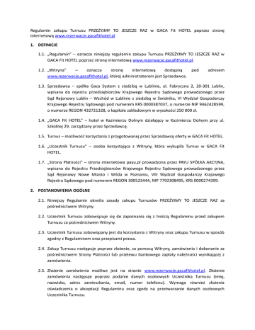 Regulamin zakupu Turnusu PRZEŻYJMY TO JESZCZE RAZ w GACA Fit HOTEL poprzez stronę internetową www.rezerwacje.gacafithotel.pl 1. DEFINICJE 1.1. „Regulamin” – oznacza niniejszy regulamin zakupu Turnusu PRZEŻYJMY TO JESZCZE RAZ w GACA Fit HOTEL poprzez stronę internetową www.rezerwacje.gacafithotel.pl. 1.2. „Witryna” – oznacza stronę internetową dostępną www.rezerwacje.gacafithotel.pl, której administratorem jest Sprzedawca. pod adresem 1.3. Sprzedawca – spółka Gaca System z siedzibą w Lublinie, ul. Fabryczna 2, 20-301 Lublin, wpisana do rejestru przedsiębiorców Krajowego Rejestru Sądowego prowadzonego przez Sąd Rejonowy Lublin – Wschód w Lublinie z siedzibą w Świdniku, VI Wydział Gospodarczy Krajowego Rejestru Sądowego pod numerem KRS 0000387037, o numerze NIP 9462428599, o numerze REGON 432721328, o kapitale zakładowym w wysokości 250 000 zł. 1.4. „GACA Fit HOTEL” – hotel w Kazimierzu Dolnym działający w Kazimierzu Dolnym przy ul. Szkolnej 29, zarządzany przez Sprzedawcę. 1.5. Turnus – możliwość korzystania z przygotowanej przez Sprzedawcę oferty w GACA Fit HOTEL. 1.6. „Uczestnik Turnusu” – osoba korzystająca z Witryny, która wykupiła Turnus w GACA Fit HOTEL. 1.7. „Strona Płatności” – strona internetowa payu.pl prowadzona przez PAYU SPÓŁKA AKCYJNA, wpisana do Rejestru Przedsiębiorców Krajowego Rejestru Sądowego prowadzonego przez Sąd Rejonowy Nowe Miasto i Wilda w Poznaniu, VIII Wydział Gospodarczy Krajowego Rejestru Sądowego pod numerem REGON 300523444, NIP 7792308495, KRS 0000274399. 2. POSTANOWIENIA OGÓLNE 2.1. Niniejszy Regulamin określa zasady zakupu Turnusów PRZEŻYJMY TO JESZCZE RAZ za pośrednictwem Witryny. 2.2. Uczestnik Turnusu zobowiązuje się do zapoznania się z treścią Regulaminu przed zakupem Turnusu za pośrednictwem Witryny. 2.3. Uczestnik Turnusu zobowiązany jest do korzystania z Witryny oraz zakupu Turnusu w sposób zgodny z Regulaminem oraz przepisami prawa. 2.4. Zakup Turnusu następuje poprzez złożenie, za pomocą Witryny, zamówienia i dokonanie za pośrednictwem Strony Płatności lub przelewu bankowego zapłaty należności wynikającej z zamówienia. 2.5. Złożenie zamówienia możliwe jest na stronie www.rezerwacje.gacafithotel.pl. Złożenie zamówienia następuje poprzez podanie danych osobowych Uczestnika Turnusu (imię, nazwisko, adres zamieszkania, email, numer telefonu). Wymaga również złożenia oświadczenia o akceptacji Regulaminu oraz zgody na przetwarzanie danych osobowych Uczestnika Turnusu. 2.6. Uczestnik Turnusu po złożeniu zamówienia i dokonaniu płatności otrzyma potwierdzenie emailem, które zostanie wysłane na adres podany podczas składania zamówienia. 2.7. Cena Turnusu jest podana na Witrynie podczas składania zamówienia oraz w potwierdzeniu przyjęcia zamówienia. 3. PŁATNOŚĆ 3.1. Zakup Turnusu odbywa się za pomocą Strony Płatności, na którą Uczestnik Turnusu będzie przeniesiony zaraz po złożeniu zamówienia. 3.2. Płatność należy dokonać nie wcześniej niż w momencie złożenia zamówienia i nie później niż w terminie 30 minut od złożenia zamówienia lub 48 godzin w przypadku opcji płatności tradycyjnym przelewem bankowym. Później zamówienie będzie anulowane. 3.3. Dokonywana przez Uczestnika Turnusu zapłata na rzecz Sprzedawcy z wykorzystaniem Usługi Płatności Kartami Płatniczymi odbywa się za pośrednictwem systemu płatności elektronicznych PayU. 4. ZASADY ZWROTU PŁATNOŚCI 4.1. Uczestnik Turnusu ma prawo zrezygnować z Turnusu w ciągu 14 dni od daty zakupu, zachowując całą kwotę płatności, jednak Sprzedawca zastrzega sobie, że zapis nie obowiązuje w sytuacji gdy do rozpoczęcia Turnusu zostało mniej niż 30 dni. W takiej sytuacji kwota nie ulega zwrotowi. 4.2. Informacje o rezygnacji należy kierować na adres e-mail: [email protected] 4.3. Rezygnacja powinna zawierać imię, nazwisko, adres e-mail, dokładny adres Uczestnika Turnusu. 4.4. Sprzedawca ma obowiązek zwrócić pieniądze w ciągu 30 dni od daty rezygnacji z udziału w Turnusie. 5. REKLAMACJE 5.1. Wszelkie pytania i reklamacje dotyczące funkcjonowania Witryny i sprzedaży Turnusu należy nadsyłać pocztą elektroniczną na adres [email protected]. 5.2. Reklamacje mogą być przesyłane nie później niż w termie 14 dni od daty powzięcia przez Uczestnika Turnusu informacji o zdarzeniu, które było przyczyną reklamacji. 5.3. Reklamacja powinna zawierać imię, nazwisko, dokładny adres Uczestnika Turnusu jak również dokładny opis i wskazanie przyczyny reklamacji. 5.4. Sprzedawca rozpatrzy reklamacje w ciągu 14 dni od daty ich złożenia. To rozstrzygnięcie jest ostateczne. 5.5. Sprzedawca ma prawo przechowywać kopie korespondencji z Uczestnikiem Turnusu. 6. DANE OSOBOWE 6.1. Administratorem danych osobowych udostępnianych przez Uczestników Turnusu jest GACA SYSTEM Spółka z ograniczoną odpowiedzialnością, Fabryczna 2, 20-301 Lublin. 6.2. Podanie danych osobowych przez Uczestnika Turnusu ma charakter dobrowolny. 6.3. Dokonując zakupu Uczestnik Turnusu wyraża zgodę na przetwarzania swoich danych osobowych zgodnie z przepisami ustawy z dn. 29 sierpnia 1997 r. o ochronie danych osobowych (Dz. U. z 2002 r. Nr 101, poz. 926 tj. z późniejszymi zmianami). 6.4. Celem przetwarzania danych osobowych jest sprzedaż Turnusu PRZEŻYJMY TO JESZCZE RAZ. 6.5. Administrator Danych Osobowych zobowiązuje się dochowania wszelkiej staranności przy zbieraniu, przetwarzaniu oraz przechowywaniu danych osobowych Uczestników Turnusu oraz przestrzeganie zaleceń Głównego Inspektoratu Ochrony Danych Osobowych. 7. WARUNKI FORMALNE KORZYSTANIA Z TURNUSU PRZEŻYJMY TO JESZCZE RAZ 7.1. Uczestnikiem turnusu może być wyłącznie osoba fizyczna, która uczestniczyła w Turnusie STARTER MOTYWACYJNY w GACA Fit HOTEL; 8. POSTANOWIENIA KOŃCOWE 8.1. Sprzedawca nie ponosi odpowiedzialności za funkcjonowanie Internetu, aplikacji i sprzętu