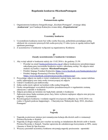 Regulamin konkursu #KochamPomagam §1 Postanowienia ogólne 1. Organizatorem konkursu fotograficznego „Kocham-Pomagam”, zwanego dalej „konkursem” jest Fundacja Kukuryku zwana dalej „Organizatorem” §2 Uczestnicy konkursu 1. Uczestnikiem konkursu może być tylko osoba fizyczna, pełnoletnia posiadająca pełną zdolność do czynności prawnych lub osoba powyżej 15 roku życia ze zgodą rodzica bądź opiekuna prawnego. 2. Z uczestnictwa w konkursie wyłączeni są organizatorzy Konkursu §3 Zasady uczestniczenia w konkursie i terminarz 1. Aby wziąć udział w konkursie należy do 13.02.2016 r. do godziny 23.59: ◦ Przesłać na email [email protected] zdjęcie konkursowe przedstawiające zakochaną parę (uczestnika konkursu razem z ukochaną osobą). Na zdjęciu musi znaleźć się kartka z napisem #KochamPomagam ◦ Polubić fanpage Fundacji Kukuryku (https://www.facebook.com/fundacjakukuryku) ◦ Polubić fanpage Restauracji Piwnica Rycerska (https://www.facebook.com/piwnicarycerska.wiklinowyraj) 2. Przysyłając zdjęcie na maila w treści wiadomości wpisać imię, nazwisko, numer telefonu osoby zgłaszającej oraz imię osoby towarzyszącej na zdjęciu 3. Udział w konkursie jest dobrowolny 4. Jedna osoba może zgłosić na konkurs tylko jedną fotografię 5. Osoby niespełniające wszystkich kryteriów przedstawionych w regulaminie zostaną odrzucone z udziału w konkursie 6. Zdjęcia przysłane po terminie nie będą brały udziału w konkursie 7. Zgłoszone prace będą oceniane przez Jury, które wybierze najlepsze zdjęcia oraz przyzna nagrody i wyróżnienia 8. Rozstrzygnięcie konkursu i rozdanie nagród zwycięzcom odbędzie się 14.02.2016 r na rynku w Kętach podczas happening'u – Charytatywne Walentynki Kęty 2016 „Kocham Pomagam” §4 Nagrody 1. Nagrodą za pierwsze miejsce jest romantyczna kolacja dla dwóch osób w restauracji Piwnica Rycerska w Kętach. 2. Nagrodą za drugie miejsce jest voucher na nocleg ze śniadaniem dla dwóch osób w hotelu Piwnica Rycerska w Kętach. Voucher uprawnia do całodniowego korzystania ze SPA, sauny i basenu w Hotel & Spa Kocierz. 3. Wszyscy pozostali uczestnicy konkursu otrzymają nagrody pocieszenia - upominki §5 Postanowienia końcowe 1. Regulamin konkursu dostępny jest na stronie http://kukuryku.org.pl/ 2. Uczestnik zgłaszając pracę do konkursu oświadcza, że: ◦ wyraża zgodę na przetwarzanie swoich danych osobowych na potrzeby konkursu zgodnie z ustawą o Ochronie Danych Osobowych dn.29.08.1997 r. Dz.U. Nr 133 poz.833 z póz. zm.; ◦ posiada wszelkie prawa do rozpowszechniania tego zdjęcia. Ponosi pełną odpowiedzialność za ewentualne roszczenia osób trzecich, które mogłyby zostać skierowane w stronę Organizatora po udostępnieniu konkursowego zdjęcia. ◦ udziela Organizatorowi nieodpłatnej licencji wyłącznej, uprawniającej Organizatora do korzystania przez czas nieoznaczony oraz bez ograniczeń terytorialnych z publikowanych konkursowych zdjęć (utrwalania; zwielokrotnienia wszelkimi technikami; publikacji na stronach internetowych Organizatora) ◦ akceptuje niniejszy regulamin 3. Wszelkie pytania można kierować na adres [email protected] 4. Organizator zastrzega sobie prawo do wprowadzania zmian w regulaminie. 5. Ostateczna interpretacja regulaminu oraz we wszystkich sprawach nie opisanych i uregulowanych w regulaminie decyduje Jury.