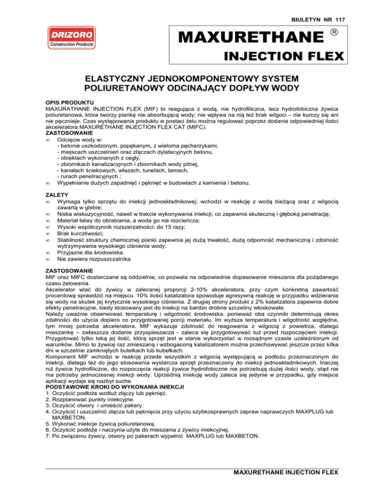 BIULETYN NR 117 MAXURETHANE INJECTION FLEX ELASTYCZNY JEDNOKOMPONENTOWY SYSTEM POLIURETANOWY ODCINAJĄCY DOPŁYW WODY OPIS PRODUKTU MAXURATHANE INJECTION FLEX (MIF) to reagująca z wodą, nie hydrofiliczna, lecz hydrofobiczna żywica poliuretanowa, która tworzy piankę nie absorbującą wody; nie wpływa na nią też brak wilgoci – nie kurczy się ani nie pęcznieje. Czas występowania produktu w postaci żelu można regulować poprzez dodanie odpowiedniej ilości akceleratora MAXURETHANE INJECTION FLEX CAT (MIFC). ZASTOSOWANIE • Odcięcie wody w: - betonie uszkodzonym, popękanym, z wieloma pęcherzykami, - miejscach uszczelnień oraz złączach dylatacyjnych betonu, - obiektach wykonanych z cegły, - zbiornikach kanalizacyjnych i zbiornikach wody pitnej, - kanałach ściekowych, włazach, tunelach, tamach, - rurach penetracyjnych ; • Wypełnianie dużych zapadnięć i pęknięć w budowlach z kamienia i betonu. ZALETY • Wymaga tylko sprzętu do iniekcji jednoskładnikowej; wchodzi w reakcję z wodą bieżącą oraz z wilgocią zawartą w glebie; • Niska wiskozycyjność, nawet w trakcie wykonywania iniekcji, co zapewnia skuteczną i głęboką penetrację; • Materiał łatwy do obrabiania, a woda go nie rozcieńcza; • Wysoki współczynnik rozszerzalności: do 15 razy; • Brak kurczliwości; • Stabilność struktury chemicznej pianki zapewnia jej dużą trwałość, dużą odporność mechaniczną i zdolność wytrzymywania wysokiego ciśnienia wody; • Przyjazne dla środowiska. • Nie zawiera rozpuszczalnika ZASTOSOWANIE MIF oraz MIFC dostarczane są oddzielnie, co pozwala na odpowiednie dopasowanie mieszania dla pożądanego czasu żelowania. Akcelerator wlać do żywicy w zalecanej proporcji 2-10% akceleratora, przy czym konkretną zawartość procentową sprawdzić na miejscu. 10% ilości katalizatora spowoduje agresywną reakcję w przypadku wdzierania się wody na skutek jej krytycznie wysokiego ciśnienia. Z drugiej strony produkt z 2% katalizatora zapewnia dobre efekty penetracyjne, kiedy stosowany jest do iniekcji na bardzo drobne szczeliny włoskowate. Należy uważnie obserwować temperaturę i wilgotność środowiska, ponieważ oba czynniki determinują okres zdatności do użycia dopiero co przygotowanej porcji materiału. Im wyższa temperatura i wilgotność względna, tym mniej potrzeba akceleratora. MIF wykazuje zdolność do reagowania z wilgocią z powietrza, dlatego mieszankę – zwłaszcza dodanie przyspieszacza - zaleca się przygotowywać tuż przed rozpoczęciem iniekcji. Przygotować tylko taką jej ilość, którą sprzęt jest w stanie wykorzystać w rozsądnym czasie uzależnionym od warunków. Mimo to żywicę raz zmieszaną i wzbogaconą katalizatorem można przechowywać jeszcze przez kilka dni w szczelnie zamkniętych butelkach lub kubełkach. Komponent MIF wchodzi w reakcję przede wszystkim z wilgocią występującą w podłożu przeznaczonym do iniekcji, dlatego też do jego stosowania wystarcza sprzęt przeznaczony do iniekcji jednoskładnikowych. Inaczej niż żywice hydrofiliczne, do rozpoczęcia reakcji żywice hydrofobiczne nie potrzebują dużej ilości wody, stąd nie ma potrzeby jednoczesnej iniekcji wody. Uprzednią iniekcję wody zaleca się jedynie w przypadku, gdy miejsce aplikacji wydaje się nazbyt suche. PODSTAWOWE KROKI DO WYKONANIA INIEKCJI 1. Oczyścić podłoże wzdłuż złączy lub pęknięć. 2. Rozplanować punkty iniekcyjne. 3. Oczyścić otwory i umieścić pakery. 4. Oczyścić i uszczelnić złącza lub pęknięcia przy użyciu szybkosprawnych zapraw naprawczych MAXPLUG lub MAXBETON. 5. Wykonać iniekcje żywicą poliuretanową. 6. Oczyścić podłoże i naczynia użyte do mieszania z żywicy iniekcyjnej. 7. Po związaniu żywicy, otwory po pakerach wypełnić MAXPLUG lub MAXBETON. MAXURETHANE INJECTION FLEX Sprzęt wykorzystywany do iniekcji należy bezwzględnie utrzymywać w stanie suchym. Mieszaninę należy zabezpieczyć przed przedostaniem się do niej i kontaktem choćby najmniejszej ilości wilgoci, ponieważ może to wywołać przedwczesną reakcję produktu. Jeśli tego typu reakcja nastąpi w trakcie pompowania, należy natychmiast wyłączyć maszynę i przemyć ją materiałem MAXURETHANE INJECTION CLEANER (MIC), w przeciwny razie dojdzie do jej zablokowania się i zatkania. CZYSZCZENIE NARZĘDZI Wszystkie stosowane narzędzia i sprzęt najlepiej czyścić zaraz po ich wykorzystaniu. DRIZORO oferuje odpowiedni materiał MAXURETHANE INJECTION CLEANER zapobiegający zatkaniu i zapchaniu się sprzętu. Wystarczy na kilkanaście minut przepuścić go przez pompę. SPRZĘT I NARZĘDZIA DRIZORO może dostarczyć odpowiedni sprzęt iniekcyjny, w skład którego wchodzą: pompy ręczne, pompy napędzane elektrycznie, pakery iniekcyjne, węże ciśnieniowe itp. OPAKOWANIE MIF dostarczany jest w wiadrach 5kg i 25 kg oraz beczkach 220 kg; MIFC – w puszkach 5 kg; MIC – w wiadrach 5kg i 25 kg oraz beczkach 220 l. PRZECHOWYWANIE 6 miesięcy w oryginalnych, nie otwieranych opakowaniach, przechowywanych w miejscu suchym i zacienionym, chronionym przed mrozem. DANE TECHNICZNE Charakterystyka komponentów żywica katalizator Wygląd lepka ciecz ciecz Kolor żółty półprzezroczysty/żółtawy Gęstość w 20ºC, DIN53217 (g/cm³) 1,05 ± 0,05 0,9 ± 0,05 Zawartość elementów stałych, DIN 53189 (%) 99,7 ± 0,5 > 99,5 Lepkość w 20ºC, DIN53019/1 (mPa · s) 1.000 ± 300 < 300 Temperatura zapłonu, DIN52785 (ºC) > 200 Procent katalizatora (%,wagowo A+B) 2-10 Warunki aplikacji i dojrzewania Czas indukcji przy katalizatorze 2% - 5% - 10% (s) 80-115/60-65/ 30-35 Koniec reakcji przy katalizatorze 2% - 5% - 10% (min.) 7-15/3-4/80-90s Charakterystyka utwardzonego produktu Współczynnik rozszerzalności (końcowa objętość : początkowa objętość) 10-20:1 Kurczliwość żadna Toksyczność nietoksyczny w formie utwardzonej/bezrozpuszczalnikowy Rozpuszczalność w wodzie żadna Odporność chemiczna Wi