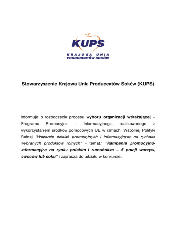 Stowarzyszenie Krajowa Unia Producentów Soków (KUPS) Informuje o rozpoczęciu procesu wyboru organizacji wdrażającej – Programu Promocyjno – Informacyjnego, realizowanego z wykorzystaniem środków pomocowych UE w ramach Wspólnej Polityki Rolnej "Wsparcie działań promocyjnych i informacyjnych na rynkach wybranych produktów rolnych" - temat: ”Kampania promocyjnoinformacyjna na rynku polskim i rumuńskim – 5 porcji warzyw, owoców lub soku” i zaprasza do udziału w konkursie. 1 Spis treści Część I Zleceniodawca………………………………………………………..… …s.3 Część II Oferta konkursowa…………………………………………………………s.9 Część III Procedura konkursowa…………………………………………………..s.17 Część IV Klauzula poufności………………………………………………………. s.33 Część V Formularz Oferty ………………………………………………………. s.36 2 CZĘŚĆ I ZLECENIODAWCA STOWARZYSZENIE KRAJOWA UNIA PRODUCENTÓW SOKÓW Stowarzyszenie Krajowa Unia Producentów Soków (KUPS) swoimi korzeniami sięga Stowarzyszenia Naukowo – Technicznego Inżynierów i Techników Przemysłu Rolno – Spożywczego (SITSpoż), gdzie zaistniało jako jednostka branżowa w 1993 roku pod nazwą Krajowa Unia Producentów Soków i Napojów Bezalkoholowych (KUPSiNB). Organizacja branżowa wypracowała przez cały okres istnienia, zrównoważoną współpracę producentów soków i nektarów owocowych i warzywnych z instytucjami naukowymi, laboratoriami badawczymi, dostawcami półproduktów, maszyn i opakowań oraz producentami soków zagęszczonych. Wstąpienie producentów zagęszczonych soków w struktury Stowarzyszenia zainicjowało proces uzyskania osobowości prawnej i rejestrację w kwietniu 2004 roku jako samodzielnej organizacji branżowej. W czasie wielu lat swojej działalności Stowarzyszenie było inicjatorem działań i inicjatyw na rzecz branży. Do niewątpliwych osiągnięć należą m.in.: • Realizacja projektu „Marchewka” - kampania promocyjno – informacyjna soków i nektarów marchwiowych w Bułgarii i Rumunii w 2006, w ramach mechanizmu „Wsparcie działań promocyjnych i informacyjnych na rynkach wybranych produktów rolnych”; • Realizacja pierwszej polskiej edycji programu „5 x dziennie warzywa i owoce” - kampania promocyjno – informacyjna na rynku warzyw, owoców i soków w Polsce rozpoczęta w 2008 roku w ramach mechanizmu „Wsparcie działań promocyjnych i informacyjnych na rynkach wybranych produktów rolnych”; • Realizacja ogólnopolskiego programu edukacyjnego dla szkół podstawowych „5 porcji warzyw, owoców lub soku”; • Realizacja projektu Quali-Juice (nr 012461) – w ramach 6 programu ramowego UE; 3 • wystąpienia do władz centralnych w sprawie podatku VAT, czego wynikiem jest obniżenie podatku VAT z 22 % do 7 % na soki, nektary i napoje owocowe i warzywne; • modyfikacja ochrony celnej na soki owocowe zagęszczone z owoców południowych w 2001, 2002, 2003 roku; • uzyskanie prawnej możliwości produkcji w Polsce nektarów klarownych, a przez to zrównanie polskich producentów z unijnymi; • podpisanie Umowy z AIJN (Europejskie Stowarzyszenie Soków Owocowych) umożliwiającej tłumaczenie na język polski „Kodeksu Praktyki AIJN”, który jest uznanym dokumentem technicznym oceny soków i nektarów w krajach Unii Europejskiej. Dokument ten stał się podstawą do oceny autentyczności soków i nektarów oferowanych na naszym rynku; • zainicjowanie i utworzenie Dobrowolnego Systemu Kontroli (DSK) soków i nektarów w Polsce, którego celem jest zapewnienie warunków uczciwej konkurencji (przestrzeganie ustawy o uczciwej konkurencji, badania rynkowe). Włączenie Dobrowolnego Systemu Kontroli (DSK) soków i nektarów w struktury EQCS (Europejski System Kontroli Jakości soków i nektarów); • utworzenie Sekcji Zagęszczonych Soków Owocowych (SK). Stowarzyszenie KUPS jest członkiem krajowych i międzynarodowych organizacji zrzeszających przedstawicieli branży sokowniczej i napojowej. Współpracuje z organizacjami zajmującymi się problematyką jakościową soków w krajach UE. Na uwagę zasługuje członkostwo w następujących organizacjach: • European Fruit Juice Association (AIJN) / Europejskie Stowarzyszenie Soków Owocowych; • Schutzgemeinschaft der Fruchtsaft – Industrie E.V.(SGF) / Wspólnota Ochronna Przemysłu Sokowniczego; • European Quality Control System (EQCS) / Europejski System Kontroli Jakości; • Rada Gospodarki Żywnościowej przy Ministrze Rolnictwa i Rozwoju Wsi (RGŻ). 4 W zakres działalności Stowarzyszenia wchodzi również organizowanie krajowych i międzynarodowych sympozjów oraz konferencji poświęconych szeroko rozumianej problematyce technologii i techniki produkcji, sprzedaży i marketingu soków, nektarów i napojów z owoców i warzyw w kraju i zagranicą. Spotkania te stanowią forum wymiany doświadczeń z zakresu sokownictwa - dyskutowane są problemy związane z jakością, prezentowane są nowinki technologiczne, aspekty żywnościowe soków i napojów owocowych i warzywnych, zmiany w przepisach prawnych i wiele innych tematów. Ostatnie krajowe i międzynarodowe sympozja były organizowane w maju 2009 w Zakopanym i w czerwcu 2009 w Krakowie. Referowano i dyskutowano na nich nad sytuacją przetwórstwa owocowo – warzywnego i jego pozycją na rynku światowym w dobie spowolnienia gospodarczego. Starano się określić szanse rozwoju i możliwości branży. Bardzo wysoki poziom organizacyjny i merytoryczny tych spotkań od wielu lat ugruntował niekwestionowaną pozycję Stowarzyszenia jako jednego z liderów w branży spożywczej. W ramach organizowanych spotkań branżowych Stowarzyszenie redaguje materiały zawierające prezentowane wystąpienia. W czasie kilkunastoletniej działalności przygotowano kilkadziesiąt biuletynów, któ