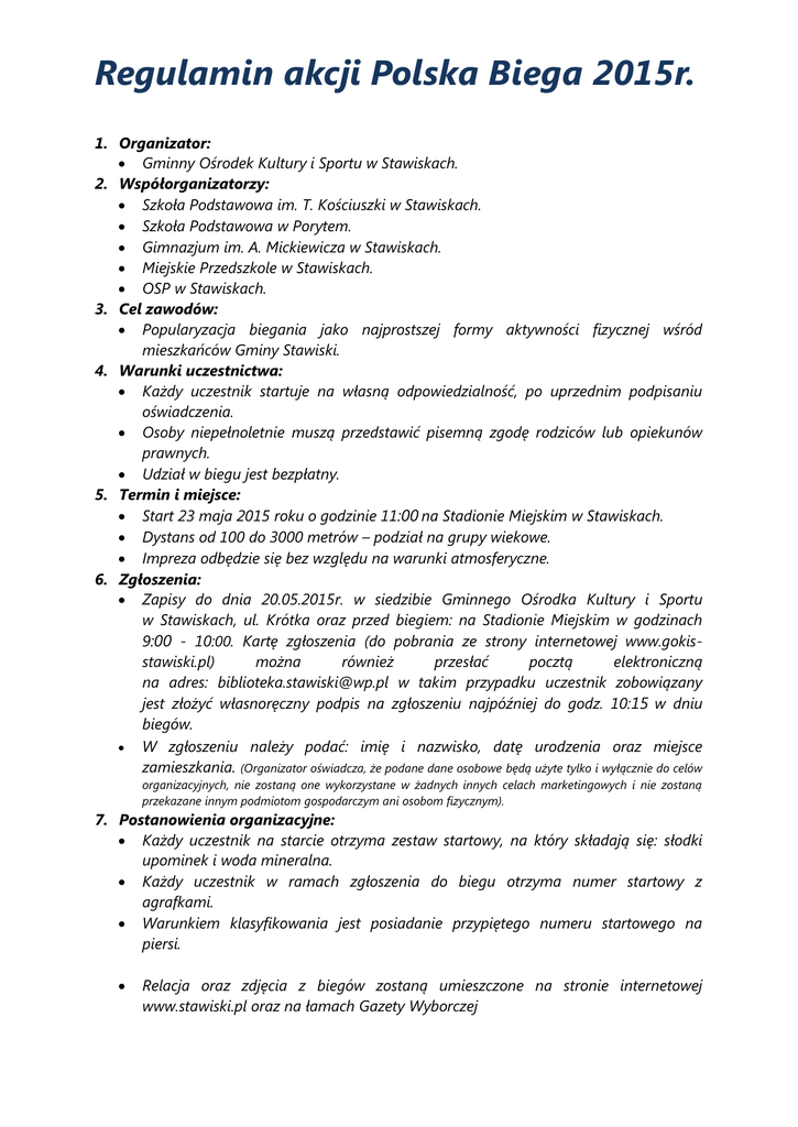Regulamin akcji Polska Biega 2015r. 1. Organizator: Gminny Ośrodek Kultury i Sportu w Stawiskach. 2. Współorganizatorzy: Szkoła Podstawowa im. T. Kościuszki w Stawiskach. Szkoła Podstawowa w Porytem. Gimnazjum im. A. Mickiewicza w Stawiskach. Miejskie Przedszkole w Stawiskach. OSP w Stawiskach. 3. Cel zawodów: Popularyzacja biegania jako najprostszej formy aktywności fizycznej wśród mieszkańców Gminy Stawiski. 4. Warunki uczestnictwa: Każdy uczestnik startuje na własną odpowiedzialność, po uprzednim podpisaniu oświadczenia. Osoby niepełnoletnie muszą przedstawić pisemną zgodę rodziców lub opiekunów prawnych. Udział w biegu jest bezpłatny. 5. Termin i miejsce: Start 23 maja 2015 roku o godzinie 11:00 na Stadionie Miejskim w Stawiskach. Dystans od 100 do 3000 metrów – podział na grupy wiekowe. Impreza odbędzie się bez względu na warunki atmosferyczne. 6. Zgłoszenia: Zapisy do dnia 20.05.2015r. w siedzibie Gminnego Ośrodka Kultury i Sportu w Stawiskach, ul. Krótka oraz przed biegiem: na Stadionie Miejskim w godzinach 9:00 - 10:00. Kartę zgłoszenia (do pobrania ze strony internetowej www.gokisstawiski.pl) można również przesłać pocztą elektroniczną na adres: [email protected] w takim przypadku uczestnik zobowiązany jest złożyć własnoręczny podpis na zgłoszeniu najpóźniej do godz. 10:15 w dniu biegów. W zgłoszeniu należy podać: imię i nazwisko, datę urodzenia oraz miejsce zamieszkania. (Organizator oświadcza, że podane dane osobowe będą użyte tylko i wyłącznie do celów organizacyjnych, nie zostaną one wykorzystane w żadnych innych celach marketingowych i nie zostaną przekazane innym podmiotom gospodarczym ani osobom fizycznym). 7. Postanowienia organizacyjne: Każdy uczestnik na starcie otrzyma zestaw startowy, na który składają się: słodki upominek i woda mineralna. Każdy uczestnik w ramach zgłoszenia do biegu otrzyma numer startowy z agrafkami. Warunkiem klasyfikowania jest posiadanie przypiętego numeru startowego na piersi. Relacja oraz zdjęcia z biegów zostaną umieszczone na stronie internetowej www.stawiski.pl oraz na łamach Gazety Wyborczej Uczestnicy przyjeżdżają na własny koszt i we własnym zakresie. Każdy uczestnik ubezpieczony jest we własnym zakresie. Organizator nie ponosi odpowiedzialności za powstałe uszczerbki zdrowotne przed, w czasie i po zakończenia biegu. Organizator zabezpiecza pomoc medyczną. Organizator nie prowadzi depozytu. 8. Postanowienia końcowe: We wszystkich sprawach nie objętych regulaminem decydują organizatorzy. Organizator zastrzega sobie prawo ostatecznej interpretacji niniejszego regulaminu. Dyrektor GOKiS Katarzyna Konopka