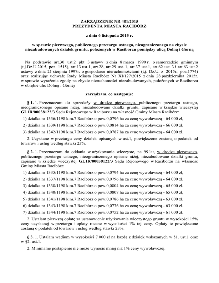 ZARZĄDZENIE NR 481/2015 PREZYDENTA MIASTA RACIBÓRZ z dnia 6 listopada 2015 r. w sprawie pierwszego, publicznego przetargu ustnego, nieograniczonego na zbycie niezabudowanych działek gruntu, położonych w Raciborzu pomiędzy ulicą Dolną i Górną Na podstawie art.30 ust.2 pkt 3 ustawy z dnia 8 marca 1990 r. o samorządzie gminnym (t.j.Dz.U.2015, poz. 1515), art.13 ust.1, art.28, art.29 ust. 1, art.37 ust.1, art.62 ust. 3 i art.63 ust.2 ustawy z dnia 21 sierpnia 1997r. o gospodarce nieruchomościami (t.j. Dz.U. z 2015r., poz.1774) oraz realizując uchwałę Rady Miasta Racibórz Nr XI/127/2015 z dnia 28 października 2015r. w sprawie wyrażenia zgody na zbycie nieruchomości niezabudowanych, położonych w Raciborzu w obrębie ulic Dolnej i Górnej zarządzam, co następuje: § 1. 1. Przeznaczam do sprzedaży w drodze pierwszego, publicznego przetargu ustnego, nieograniczonego opisane niżej, niezabudowane działki gruntu, zapisane w księdze wieczystej GL1R/00038122/3 Sądu Rejonowego w Raciborzu na własność Gminy Miasta Racibórz: 1) działka nr 1336/1198 k.m.7 Racibórz o pow.0,0796 ha za cenę wywoławczą - 64 000 zł, 2) działka nr 1339/1198 k.m.7 Racibórz o pow.0,0814 ha za cenę wywoławczą - 66 000 zł, 3) działka nr 1342/1198 k.m.7 Racibórz o pow.0,0787 ha za cenę wywoławczą - 64 000 zł. 2. Uzyskane w przetargu ceny działek opisanych w ust.1, powiększone zostaną o podatek od towarów i usług według stawki 23%. § 2. 1. Przeznaczam do oddania w użytkowanie wieczyste, na 99 lat, w drodze pierwszego, publicznego przetargu ustnego, nieograniczonego opisane niżej, niezabudowane działki gruntu, zapisane w księdze wieczystej GL1R/00038122/3 Sądu Rejonowego w Raciborzu na własność Gminy Miasta Racibórz: 1) działka nr 1335/1198 k.m.7 Racibórz o pow.0,0794 ha za cenę wywoławczą - 64 000 zł, 2) działka nr 1337/1198 k.m.7 Racibórz o pow.0,0796 ha za cenę wywoławczą - 64 000 zł, 3) działka nr 1338/1198 k.m.7 Racibórz o pow.0,0804 ha za cenę wywoławczą - 65 000 zł. 4) działka nr 1340/1198 k.m.7 Racibórz o pow.0,0807 ha za cenę wywoławczą - 65 000 zł, 5) działka nr 1341/1198 k.m.7 Racibórz o pow.0,0786 ha za cenę wywoławczą - 63 000 zł, 6) działka nr 1343/1198 k.m.7 Racibórz o pow.0,0776 ha za cenę wywoławczą - 63 000 zł. 7) działka nr 1344/1198 k.m.7 Racibórz o pow.0,0752 ha za cenę wywoławczą - 61 000 zł. 2. Ustalam pierwszą opłatę za ustanowienie użytkowania wieczystego gruntu w wysokości 15% ceny uzyskanej w przetargu i opłaty roczne w wysokości 1% tej ceny. Opłaty te powiększone zostaną o podatek od towarów i usług według stawki 23%. § 3. 1. Ustalam wadium w wysokości 7 000 zł na każdą z działek wskazanych w §1. ust.1 oraz w §2. ust.1. 2. Minimalne postąpienie nie może wynosić mniej niż 1% ceny wywoławczej. § 4. Celem sprzedaży oraz oddania w użytkowanie wieczyste działek objętych niniejszym zarządzeniem, jest realizacja zabudowy mieszkaniowej jednorodzinnej, z uwzględnieniem następujących uwarunkowań: 1) nabywca działki zobowiąże się do jej zabudowy w ramach ustaleń wynikających ściśle z miejscowego planu zagospodarowania przestrzennego miasta Racibórz w jednostce strukturalnej Ocice, zatwierdzonym Uchwałą nr XXXV/523/2005 z dnia 28 września 2005r. (Dz.Urz.Woj.Śl.z 22 listopada 2005r. Nr 136, poz.3433) w terminie do 5-ciu (pięciu) lat od daty podpisania notarialnej umowy sprzedaży lub oddania w użytkowanie wieczyste, przy czym rozpoczęcie zabudowy nastąpi w terminie 2 lat od daty podpisania tejże umowy a zakończenie w terminie kolejnych 3 lat; 2) w przypadku wtórnego zbycia nieruchomości, określone w pkt.1) terminy nie ulegają wydłużeniu; 3) za rozpoczęcie zabudowy, o której mowa w pkt. 1), uważa się wybudowanie fundamentów a za zakończenie zabudowy, wybudowanie budynku w stanie surowym, zamkniętym; 4) w przypadku wystąpienia przeszkód w wypełnieniu warunków określonych w pkt.1), powstałych z przyczyn niezależnych i niezawinionych przez nabywcę, w szczególności przeszkód spowodowanych siłą wyższą (powódź, pożar, wichury, długotrwałe powyżej 10-dni mrozy poniżej -10ºC, wojna), wstrzymaniem prowadzonych robót przez jakikolwiek uprawniony organ lub inną uprawnioną instytucję, termin określony w pkt.1) uważa się za zachowany w przypadku jego przesunięcia o okres występowania przeszkód i ich następstw; 5) przesunięcie zobowiązań wynikających z pkt.1) z przyczyn określonych w pkt. 4), skutkować będzie ustaleniem dodatkowego terminu zabudowy, pod warunkiem zawiadomienia Gminy w formie pisemnej, w terminie 30-dni od ustania przeszkód; 6) niedotrzymanie terminów zabudowy, o których mowa w pkt.1), skutkować będzie naliczeniem: a) kar umownych w przypadku działek, o których mowa w §1. ust.1, wynoszących 10% wartości tych działek, określonej na dzień sprzedaży. Obowiązek ponoszenia kar powstaje z dniem 1 stycznia roku następującego po bezskutecznym upływie terminów zabudowy, wskazanych w umowie. Za każdy, następny rok zwłoki, kara ta ulegnie zwiększeniu o dalsze 10% tej wartości; b) dodatkowej opłaty rocznej w przypadku działek, o których mowa w §2. ust.1, w wysokości 10% wartości tych działek określonej na dzień ustalenia opłaty rocznej. Obowiązek ponoszenia dodatkowej opłaty rocznej, powstaje z dniem 1 stycznia roku następującego po bezskutecznym upływie terminów zabudowy, wskazanych w umowie. Za każdy, następny rok zwłoki, opłata ulegnie zwiększeniu o dalsze 10% tej wartości. § 5. 1. Gmina Racibórz zobowiązuje się do wykonania uzbrojenia w sieci infrastruktury technicznej, z zastrzeżeniem następujących terminów: 1) d o 31 grudnia2018 r.: sieci wodociągowej i energetycznej, sieci kanalizacji sanitarnej a także tymczasowej drogi dojazdowej do placu budowy; 2) d o 31 grudnia 2020 r.: s ieci kanalizacji deszczowej, oświetlenia ulicznego oraz drogi o nawierzchni utw