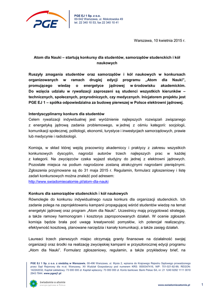 PGE EJ 1 Sp. z o.o. 00-542 Warszawa, ul. Mokotowska 49 tel. 22 340 10 53, fax 22 340 10 41 Warszawa, 10 kwietnia 2015 r. Atom dla Nauki – startują konkursy dla studentów, samorządów studenckich i kół naukowych Ruszyły zmagania studentów oraz samorządów i kół naukowych w konkursach organizowanych w ramach drugiej edycji programu „Atom dla Nauki”, promującego wiedzę o energetyce jądrowej w środowisku akademickim. Do wzięcia udziału w rywalizacji zaproszeni są studenci wszystkich kierunków – technicznych, społecznych, przyrodniczych, czy medycznych. Inicjatorem projektu jest PGE EJ 1 – spółka odpowiedzialna za budowę pierwszej w Polsce elektrowni jądrowej. Interdyscyplinarny konkurs dla studentów Celem rywalizacji indywidualnej jest wyróżnienie najlepszych rozwiązań związanego z energetyką jądrową zadania problemowego, w jednej z ośmiu kategorii: socjologii, komunikacji społecznej, politologii, ekonomii, turystyce i inwestycjach samorządowych, prawie lub medycynie i radiobiologii. Komisja, w skład której wejdą pracownicy akademiccy i praktycy z zakresu wszystkich konkursowych dyscyplin, nagrodzi autorów trzech najlepszych prac w każdej z kategorii. Na zwycięzców czeka wyjazd studyjny do jednej z elektrowni jądrowych. Pozostałe miejsca na podium nagrodzone zostaną atrakcyjnymi nagrodami pieniężnymi. Zgłoszenia przyjmowane są do 31 maja 2015 r. Regulamin, formularz zgłoszeniowy i listę zadań konkursowych można znaleźć pod adresem: http://www.swiadomieoatomie.pl/atom-dla-nauki Konkurs dla samorządów studenckich i kół naukowych Równolegle do konkursu indywidualnego rusza konkurs dla organizacji studenckich. Ich zadanie polega na zaprojektowaniu kampanii propagującej wśród studentów wiedzę na temat energetyki jądrowej oraz program „Atom dla Nauki”. Uczestnicy mają przygotować strategię, a także ramowy harmonogram i kosztorys zaproponowanych działań. W ocenie zgłoszeń komisja będzie brała pod uwagę kreatywność pomysłów, ich potencjał realizacyjny, efektywność kosztową, planowane narzędzia i kanały komunikacji, a także zasięg działań. Laureaci trzech pierwszych miejsc otrzymają granty finansowe na działalność swojej organizacji oraz środki na realizację zwycięskiej kampanii w przyszłorocznej edycji programu „Atom dla Nauki”. Formularz zgłoszeniowy, regulamin, a także przykładowy brief, na PGE EJ 1 Sp. z o.o. z siedzibą w Warszawie, 00-496 Warszawa, ul. Mysia 2, wpisana do Krajowego Rejestru Sądowego prowadzonego przez Sąd Rejonowy dla m.st. Warszawy, XII Wydział Gospodarczy pod numerem KRS: 0000347416, NIP: 701-021-82-99, REGON: 142242032, Kapitał zakładowy: 73 000 000 zł. Kapitał wpłacony: 73 000 000 zł. Konto bankowe: Bank Pekao SA, nr: 21 1240 6292 1111 0010 2943 7844. www.pgeej1.pl 1 podstawie którego należy opracować strategię kampanii, znajdują się na stronie http://www.swiadomieoatomie.pl/atom-dla-nauki. Uczestnicy mogą przesyłać swoje pomysły do 31 maja 2015 roku. O programie „Atom dla Nauki” Konkursy stanowią część programu „Atom dla Nauki”, zainaugurowanego w ubiegłym roku akademickim przez PGE EJ 1. Celem projektu jest zachęcenie środowisk akademickich do pogłębiania wiedzy na temat energetyki jądrowej oraz przygotowanie przyszłych kadr tworzonego obecnie w Polsce sektora jądrowego. Poza modułem konkursowym, na wybranych uczelniach w całym kraju odbędzie się cykl wydarzeń pod nazwą „Dzień z Atomem dla Nauki”, podczas których odbędą się m.in. wykłady specjalne i pokazy filmowe. Ponadto na kampusach pojawią się interaktywne stoiska dydaktyczne, gdzie wszyscy zainteresowani będą mogli zdobyć informacje o założeniach i elementach programu „Atom dla Nauki”, a także działaniach prowadzonych przez Spółkę PGE EJ 1. Dodatkowym elementem programu „Atom dla Nauki” jest współpraca PGE EJ 1 z uczelniami technicznymi: Politechniką Warszawską, Politechniką Wrocławską i Akademią Górniczo-Hutniczą i Politechniką Łódzką w zakresie działań edukacyjno-informacyjnych. Partnerami projektu są Narodowe Centrum Badań Jądrowych, Polskie Towarzystwo Nukleoniczne oraz Instytut Fizyki Jądrowej PAN. Patronat nad inicjatywą objęło Ministerstwo Gospodarki. Dodatkowych informacji udziela: Tomasz Gołębiewski Główny Specjalista Biuro Komunikacji i Relacji Zewnętrznych PGE EJ 1 sp. z o.o. Tel. +48 665 880 995 e-mail: [email protected] PGE EJ 1 Sp. z o.o. z siedzibą w Warszawie, 00-542 Warszawa, ul. Mokotowska 49, wpisana do Krajowego Rejestru Sądowego prowadzonego przez Sąd Rejonowy dla m.st. Warszawy, XII Wydział Gospodarczy pod numerem KRS: 0000347416, NIP: 701-021-82-99, REGON: 142242032, Kapitał zakładowy: 73 000 000 zł. Kapitał wpłacony: 73 000 000 zł. Konto bankowe: Bank Pekao SA, nr: 21 1240 6292 1111 0010 2943 7844. www.pgeej1.pl 2