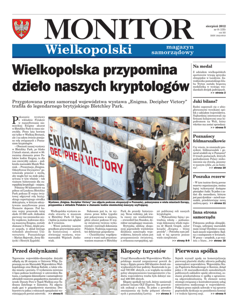 sierpień 2012 nr 8 (135) rok XII ISSN 1642-0918 Wielkopolska przypomina dzieło naszych kryptologów Na medal Przygotowana przez samorząd województwa wystawa „Enigma. Decipher Victory” trafiła do legendarnego brytyjskiego Bletchley Park. Jaki bilans? P Radni zapoznali się z ubiegłorocznymi wynikami spółek z udziałem województwa. Najbardziej interesowali się firmami kolejowymi oraz hipodromem na Woli, który wkrótce ma zostać sprzedany. >> strona 5 Poznańscy feldmarszałkowie Czy wiecie, że niemiecki prezydent, feldmarszałek i generał urodzili się w Poznaniu? O trzech postaciach, których pochodzeniem Polacy niekoniecznie się chwalą, piszemy w naszym cyklu „co za historia”. >> strona 10 Poszuka rezerw FOT. ARCHIWUM UMWW okazanie wystawy o wkładzie Polaków w rozszyfrowanie niemieckiej Enigmy akurat w Bletchley Park to rzecz niezwykła. Przez lata bowiem nie tylko w Wielkiej Brytanii, ale i na całym świecie pomijano rolę związanych z Poznaniem kryptologów. – Obecność naszej wystawy w Bletchley Park, po blisko 2 latach starań, akurat w 80. rocznicę złamania przez Polaków kodów Enigmy, to dla nas niezwykły sukces – podkreśla marszałek Marek Woźniak. – Prezentacja „Enigma. Odszyfrować Zwycięstwo” powstawała przecież z myślą, aby mogła być na stałe pokazywana w tym właśnie – tak ważnym historycznie dla europejskiej kryptologii – miejscu. Położony 90 kilometrów na północ od Londynu Bletchley Park podczas II wojny światowej odgrywał rolę brytyjskiego supertajnego ośrodka dekryptażu, w którym odczytywano zaszyfrowane przez Niemców depesze. Pod koniec wojny pracowało tutaj około 10 000 osób. Jednakże pierwszy raz niemieckie szyfry wojskowe, kodowane słynną maszyną Enigma, zostały złamane w Polsce, dzięki pracy zespołu, w skład którego wchodzili absolwenci Uniwersytetu Poznańskiego – Marian Rejewski, Jerzy Różycki i Henryk Zygalski. Z udziałem wielkopolskich sportowców trwają igrzyska olimpijskie w Londynie. Zawodniczka poznańskiego klubu Tryton została brązową medalistką w wyścigu wioślarskich dwójek podwójnych. >> strona 2 Wystawa „Enigma. Decipher Victory” (na zdjęciu podczas ekspozycji w Poznaniu), pokazywana w wielu miastach Europy, przypomina o wkładzie Polaków w złamanie kodów niemieckiej maszyny szyfrującej. Wielkopolska wystawa została otwarta w muzeum w Bletchley Park 15 lipca i będzie ją można tam oglądać do 9 września. – Winni jesteśmy naszym przodkom przywrócenie prawdy historycznej – mówił, otwierając wystawę, wicemarszałek Wojciech Jankowiak. Sukcesem jest to, że wystawa przez kilka tygodni jest pokazywana w miejscu, gdzie alianci podczas II wojny światowej twórczo wykorzystali i rozwinęli dokonania Polaków. Nadzieją napawają też deklaracje gospodarzy. – Chcielibyśmy współpracować z wami nad przystosowaniem muzeum w Bletchley Park do prawdy historycznej. Teraz widzimy, jak wielu rzeczy nie wiedzieliśmy – stwierdził Ian Standen, dyrektor zarządzający muzeum. Brytyjską odsłonę ekspozycji poprzedziły wieloletnie działania samorządu województwa, których celem jest przypomnienie światowej, a zwłaszcza europejskiej, opi- nii publicznej roli naszych kryptologów. – Wykonaliśmy fajną i potrzebną robotę – podsumowuje dokonania władz regionu dr Marek Grajek, autor książki „Enigma – bliżej prawdy”. – Potrzeba nam jednak w tej sprawie jeszcze wiele cierpliwości. >> strony 8-9 – W tym teatrze tkwią pewne rezerwy organizacyjne, można lepiej wykorzystać dostępne pieniądze i ludzi. To jedno z zadań dla menedżera, którym jest pani dyrektor – mówił marszałek, przedstawiając nową szefową opery. >> strona 11 Inna strona samorządu Pokręcona profesja olimpijki. Uwaga, uzbrojony marszałek może (ś)ciąć! Dyrektor o szczękach innych województw. Radna z szampanem w kwiatach. W pracy – urzędnik, a po wyjściu z biura…>> strona 16 Kłopoty turystów Pierwsza spółka Tegoroczne wojewódzko-diecezjalne dożynki odbędą się 26 sierpnia w Ostrowie Wlkp. Zapraszają na nie Marszałek Województwa Wielkopolskiego oraz Biskup Kaliski, a także władze miasta i powiatu. O wydarzeniu mówiono 4 lipca podczas konferencji w ostrowskim Ratuszu, a następnie dziennikarze i samorządowcy odwiedzili wzorcowe gospodarstwa starostów dożynek: Danuty Perz w Topoli Wielkiej oraz Tadeusza Zatylnego w Zamościu. Na zdjęciu: stado gęsi w gospodarstwie starościny. Drobiarstwo to jedna z rolniczych specjalności wyróżniających powiat ostrowski. >> strona 6 Urząd Marszałkowski Województwa Wielkopolskiego musiał zorganizować powrót do kraju z Egiptu prawie 500 klientów dwóch niewypłacalnych biur podróży. Kosztowało to ponad 700 000 złotych, a ze względu na niskie polisy ubezpieczeniowe touroperatorów z budżetu województwa trzeba było dołożyć niemal 400 000 złotych. Kłopoty spotkały też tych, którzy zamierzali polecieć liniami OLT Express. Ten przewoźnik zniknął z rynku. To jeden z powodów zmniejszenia się liczby połączeń oferowanych z poznańskiej Ławicy. >> strona 3 Sejmik wyraził zgodę na komercjalizację pierwszej placówki służby zdrowia podległej samorządowi województwa. Wojewódzka Stacja Pogotowia Ratunkowego w Koninie, dotąd jeden z 25 marszałkowskich samodzielnych publicznych zakładów opieki zdrowotnej, zostanie przekształcona w spółkę z ograniczoną odpowiedzialnością. To element nowej strategii związanej z kontraktowaniem usług ratownictwa medycznego w województwie. Podjęcie przez sejmik uchwały w tej sprawie poprzedziła dyskusja na posiedzeniu komisji i w trakcie lipcowej sesji. >> strona 4 FOT. R. JAŁOSZYŃSKI Przed dożynkami 2 Monitor Wielkopolski | sierpień 2012 www.monitorwielkopolski.pl aktualności na wstêpie Ponownie wybrany w KR Gniezno znów koronuje króla Jak ruszyć Enigmę? Filmem! FOT. J. ANDRZEJEWSKI Artur Boiñski Jak 