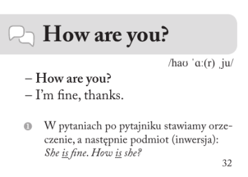 How are you? – How are you? – I’m fine, thanks. /haʊ ˈɑː(r) ˌju/ XX W pytaniach po pytajniku stawiamy orzeczenie, a następnie podmiot (inwersja): She is fine. How is she? 32 Jak się masz? www.jezykiobce.pl – Jak się masz? – Dobrze, dziękuję. XX (przykł.) Ona miewa się dobrze. Jak ona się miewa? 32 What time…? /wət ˈtaɪm/ What time does the film start? XX What time do you start? 44 O której…? www.jezykiobce.pl O której zaczyna się film? XX O której zaczynasz / zaczynacie? 44 to mean /mi:n/ What does it mean? XX meaning 146 znaczyć www.jezykiobce.pl Co to znaczy? XX znaczenie 146