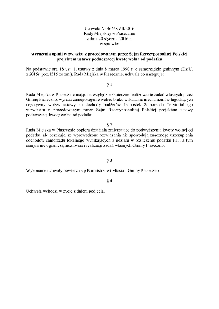 Uchwała Nr 466/XVII/2016 Rady Miejskiej w Piasecznie z dnia 20 stycznia 2016 r. w sprawie: wyrażenia opinii w związku z procedowanym przez Sejm Rzeczypospolitej Polskiej projektem ustawy podnoszącej kwotę wolną od podatku Na podstawie art. 18 ust. 1, ustawy z dnia 8 marca 1990 r. o samorządzie gminnym (Dz.U. z 2015r. poz.1515 ze zm.), Rada Miejska w Piasecznie, uchwala co następuje: §1 Rada Miejska w Piasecznie mając na względzie skuteczne realizowanie zadań własnych przez Gminę Piaseczno, wyraża zaniepokojenie wobec braku wskazania mechanizmów łagodzących negatywny wpływ ustawy na dochody budżetów Jednostek Samorządu Terytorialnego w związku z procedowanym przez Sejm Rzeczypospolitej Polskiej projektem ustawy podnoszącej kwotę wolną od podatku. §2 Rada Miejska w Piasecznie popiera działania zmierzające do podwyższenia kwoty wolnej od podatku, ale oczekuje, że wprowadzone rozwiązania nie spowodują znacznego uszczuplenia dochodów samorządu lokalnego wynikających z udziału w rozliczeniu podatku PIT, a tym samym nie ograniczą możliwości realizacji zadań własnych Gminy Piaseczno. §3 Wykonanie uchwały powierza się Burmistrzowi Miasta i Gminy Piaseczno. §4 Uchwała wchodzi w życie z dniem podjęcia. UZASADNIENIE Prezydent Rzeczypospolitej Polskiej Andrzej Duda złożył w Sejmie projekt zmiany ustawy o podatku dochodowym od osób fizycznych poprzez podwyższenie kwoty wolnej od podatku z 3 091 zł do ponad 8 tys. zł. Rada Miejska w Piasecznie popiera ideę przyświecającą Prezydentowi RP, zwłaszcza, że wyrok Trybunału Konstytucyjnego z 28 października 2015 r. wskazał, iż obecnie ustalona dla podatnika kwota wolna od podatku jest ponad dwukrotnie niższa od minimum egzystencji, co jest niezgodne z ustawą zasadniczą. Dlatego jej podniesienie jest niezbędne i nowy Sejm musi wprowadzić zmiany najpóźniej od 2017 roku. Pozytywnym skutkiem nowelizacji Ustawy będzie większa kwota pozostająca w kieszeni obywateli. Negatywnym - znaczne zmniejszenie dochodów budżetu Państwa z tytułu wpływów z podatku PIT, co oznacza także automatyczne zmniejszenie wpływów do budżetów Jednostek Samorządu Terytorialnego, dla których udział w PIT stanowi ponad 50% dochodów. Chociaż w uzasadnieniu Projektu Ustawy nie ma odniesień do finansów, jednak szacunkowe wyliczenia na bazie przytoczonych danych mówią, że w wyniku przyjęcia nowej regulacji zmniejszenie dochodów budżetu centralnego wyniesie ponad 20 mld zł, a JST - od 6,86 do 10 mld zł (wg danych dla roku 2013). Szczególnie dotknie to Gminy, dla których udział w podatku PIT stanowi podstawę budżetu. W przypadku Gminy Piaseczno dochody z PIT w roku 2015 wynosiły 142,5 mln zł i stanowiły 43% budżetu, a bardzo ostrożnie szacowane skutki wprowadzenia Ustawy to strata od 6 do 8 mln zł. Oznacza to, że od 2017 roku Gminy będą miały mniej środków na realizację swoich podstawowych zadań takich jak prowadzenie szkół, nowe inwestycje oświatowe, drogowe, odwodnieniowe, mieszkaniowe oraz utrzymanie bieżące. Oznacza także zmniejszenie ich elastyczności finansowej, jak również ograniczenie lub opóźnienie już realizowanych inwestycji, co może zredukować zdolność do absorpcji dotacji unijnych dostępnych w ramach perspektywy unijnej na lata 2014-20. Zakładany w wyniku zwiększenia kwoty wolnej od podatku wzrost konsumpcji przyniesie co prawda zwrot w postaci podatku VAT, jednak JST nie są jego udziałowcem. Warto przypomnieć, że kilka lat temu w wyniku zmian w systemie podatku PIT tj. wprowadzenia dwustopniowej w miejsce trzystopniowej skali podatkowej oraz wprowadzenia ulgi prorodzinnej - także bez rekompensaty dla samorządów - ich dochody w skali roku spadły o 7-8 mld zł. W tym samym okresie zadłużenie wszystkich JST wzrosło z 30 mld zł do obecnych 72 mld zł. Jednocześnie obciążenia Samorządów poprzez nakładanie na nie kolejnych zadań i obowiązków wciąż rosły i rosną, a w ślad za tymi obciążeniami nie idą dodatkowe środki, albo są to środki zbyt małe (vide subwencja oświatowa, do której Gmina Piaseczno dokłada ponad drugie tyle). Jako przedstawiciele samorządu terytorialnego zwracamy również uwagę na fakt niezgodności prezydenckiego projektu z art. 50 ust. 2 ustawy o finansach publicznych, który stanowi, że „projekt ustawy skutkującej zmianą poziomu dochodów lub wydatków jednostek samorządu terytorialnego wymaga określenia wysokości skutków tych zmian, wskazania źródeł ich sfinansowania oraz zaopiniowania przez Komisję Wspólną Rządu i Samorządu Terytorialnego”. Tymczasem przedstawiony przez Prezydenta RP projekt nie zawiera zgodnych z obowiązującymi standardami zapisów, tj. oceny skutków planowanej regulacji, w tym zwłaszcza nie wskazuje źródeł finansowania proponowanych zmian dla jednostek samorządu terytorialnego. Oczekujemy, że przed uchwaleniem tak głęboko dotykającej samorządowych finansów zmiany, nastąpi rzetelne oszacowanie jej skutków dla gmin, powiatów i województw i zostaną wprowadzone stosowne zmiany w zasilaniu budżetów JST, np. wzrost udziału samorządów we wpływach z PIT. Możliwe są także inne formy rekompensaty, jak np. zmniejszenie części obciążeń finansów JST czy ograniczenie zakresu ich zadań.