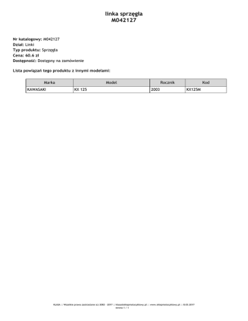 linka sprzęgła M042127 Nr katalogowy: M042127 Dział: Linki Typ produktu: Sprzęgła Cena: 60.6 zł Dostępność: Dostępny na zamówienie Lista powiązań tego produktu z innymi modelami: Marka KAWASAKI Model KX 125 Rocznik 2003 Kod KX125M KLASA :: Wszelkie prawa zastrzeżone (c) 2002 - 2017 :: [email protected] :: www.sklepmotocyklowy.pl :: 8.03.2017 strona 1 / 1