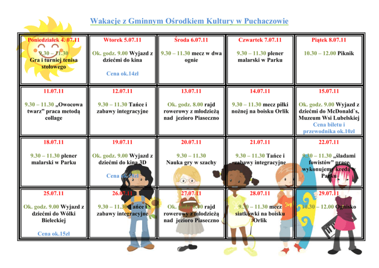 Wakacje z Gminnym Ośrodkiem Kultury w Puchaczowie Poniedziałek 4. 07.11 Wtorek 5.07.11 Środa 6.07.11 Czwartek 7.07.11 Piątek 8.07.11 9.30 – 11.30 Gra i turniej tenisa stołowego Ok. godz. 9.00 Wyjazd z dziećmi do kina 9.30 – 11.30 mecz w dwa ognie 9.30 – 11.30 plener malarski w Parku 10.30 – 12.00 Piknik Cena ok.14zł 11.07.11 12.07.11 13.07.11 14.07.11 15.07.11 9.30 – 11.30 „Owocowa twarz” praca metodą collage 9.30 – 11.30 Tańce i zabawy integracyjne Ok. godz. 8.00 rajd rowerowy z młodzieżą nad jezioro Piaseczno 9.30 – 11.30 mecz piłki nożnej na boisku Orlik Ok. godz. 9.00 Wyjazd z dziećmi do McDonald`s, Muzeum Wsi Lubelskiej Cena biletu i przewodnika ok.10zł 18.07.11 19.07.11 20.07.11 21.07.11 22.07.11 9.30 – 11.30 plener malarski w Parku Ok. godz. 9.00 Wyjazd z dziećmi do kina 3D 9.30 – 11.30 Nauka gry w szachy 9.30 – 11.30 Tańce i zabawy integracyjne 9.30 – 11.30 „śladami fowistów” prace wykonujemy kredą w Parku Cena ok.18zł 25.07.11 26.07.11 27.07.11 28.07.11 29.07.11 Ok. godz. 9.00 Wyjazd z dziećmi do Wólki Bieleckiej 9.30 – 11.30 Tańce i zabawy integracyjne Ok. godz. 8.00 rajd rowerowy z młodzieżą nad jezioro Piaseczno 9.30 – 11.30 mecz siatkówki na boisku Orlik 10.30 – 12.00 Ognisko Cena ok.15zł