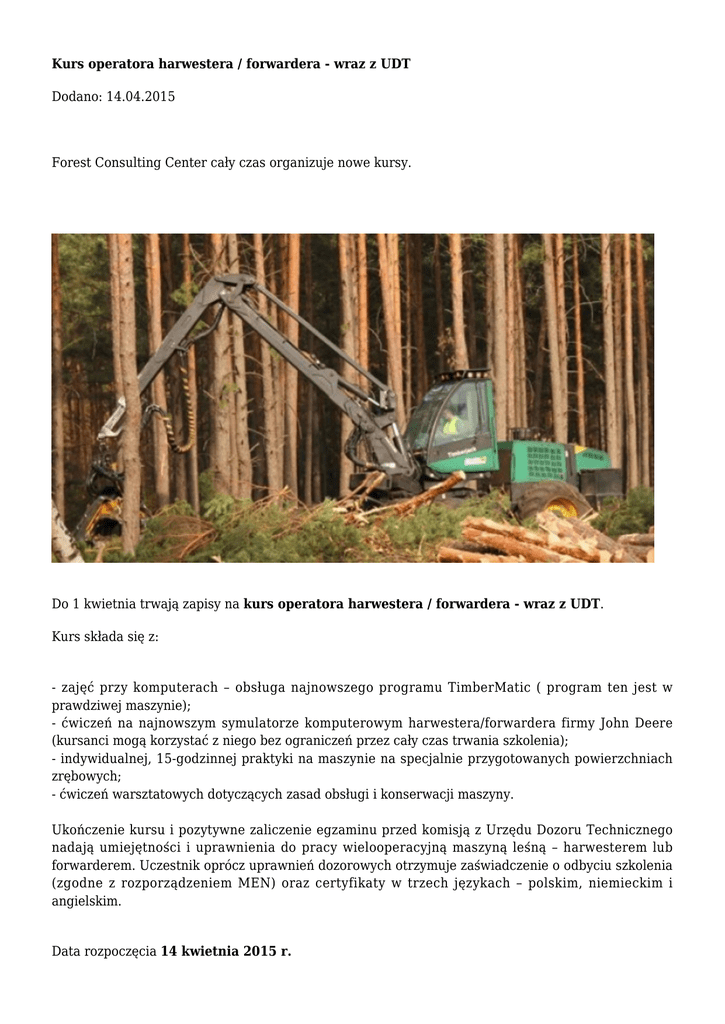 Kurs operatora harwestera / forwardera - wraz z UDT Dodano: 14.04.2015 Forest Consulting Center cały czas organizuje nowe kursy. Do 1 kwietnia trwają zapisy na kurs operatora harwestera / forwardera - wraz z UDT. Kurs składa się z: - zajęć przy komputerach – obsługa najnowszego programu TimberMatic ( program ten jest w prawdziwej maszynie); - ćwiczeń na najnowszym symulatorze komputerowym harwestera/forwardera firmy John Deere (kursanci mogą korzystać z niego bez ograniczeń przez cały czas trwania szkolenia); - indywidualnej, 15-godzinnej praktyki na maszynie na specjalnie przygotowanych powierzchniach zrębowych; - ćwiczeń warsztatowych dotyczących zasad obsługi i konserwacji maszyny. Ukończenie kursu i pozytywne zaliczenie egzaminu przed komisją z Urzędu Dozoru Technicznego nadają umiejętności i uprawnienia do pracy wielooperacyjną maszyną leśną – harwesterem lub forwarderem. Uczestnik oprócz uprawnień dozorowych otrzymuje zaświadczenie o odbyciu szkolenia (zgodne z rozporządzeniem MEN) oraz certyfikaty w trzech językach – polskim, niemieckim i angielskim. Data rozpoczęcia 14 kwietnia 2015 r. Data zakończenia 24 kwietnia 2015 r. Miejsce teren Nadleśnictwa Oborniki, k. Poznania Cena Kurs operatora harwestera: 9225 zł / os. Kurs operatora forwardera: 7380 zł / os. W cenie: profesjonalnie przeprowadzone szkolenie, wyżywienie, zakwaterowanie, materiały szkoleniowe (skrypt, notatnik, długopis, teczka), kask, kamizelka, rękawice, dojazdy na powierzchnię, przerwy kawowe, egzamin UDT, ubezpieczenie od NNW. Dodatkowe informacje: Na kurs możemy przyjąć min. 6 osób, max. 12 osób (w tym 6 os. harwester i 6 os. forwarder). Wymagane prawo jazdy kategorii B. Brak wymagań co do badań lekarskich. UWAGA! Istnieje możliwość uzyskania dofinansowania kursu ze środków, którymi dysponują Powiatowe Urzędy Pracy (dot. osób bezrobotnych). Szczegóły pod nr 609 803 221 Agata Kozubaj lub na: [email protected] Źródło/ zdjęcie: FCC Tekst: KG Komentarze (0) Nie dodano jeszcze żadnego komentarza.