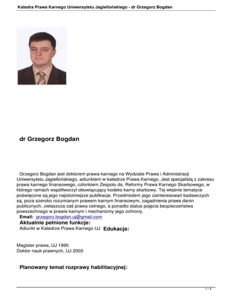 Katedra Prawa Karnego Uniwersytetu Jagiellońskiego - dr Grzegorz Bogdan dr Grzegorz Bogdan Grzegorz Bogdan jest doktorem prawa karnego na Wydziale Prawa i Administracji Uniwersytetu Jagiellońskiego, adiunktem w katedrze Prawa Karnego. Jest specjalistą z zakresu prawa karnego finansowego, członkiem Zespołu ds. Reformy Prawa Karnego Skarbowego, w którego ramach współtworzył obowiązujący kodeks karny skarbowy. Tej właśnie tematyce poświęcone są jego najistotniejsze publikacje. Przedmiotem jego zainteresowań badawczych są, poza szeroko rozumianym prawem karnym finansowym, zagadnienia prawa danin publicznych, zwłaszcza zaś prawa celnego, a ponadto status pojęcia bezpieczeństwa powszechnego w prawie karnym i mechanizmy jego ochrony. Email: [email protected] Aktualnie pełnione funkcje: Adiunkt w Katedrze Prawa Karnego UJ Edukacja: Magister prawa, UJ 1995 Doktor nauk prawnych, UJ 2003 Planowany temat rozprawy habilitacyjnej: 1/4 Katedra Prawa Karnego Uniwersytetu Jagiellońskiego - dr Grzegorz Bogdan Bezprawność w prawie karnym skarbowym Nauczanie: - Prawo karne materialne - Prawo karne skarbowe Znajomość języków: niemiecki, angielski Zainteresowania naukowe: - Prawo karne finansowe Prawo karne skarbowe Prawo celne Egzekucja danin publicznych Tzw. bezpieczeństwo powszechne jako przedmiot ochrony prawa karnego PUBLIKACJE NAUKOWE: I. Książki 1. Bezpieczeństwo ruchu drogowego. Przestępstwa i wykroczenia komunikacyjne. Podręcznik i skrypt dla wykładowcy. Wyd. Politechniki Krakowskiej - Kraków 2003/2004 – publikacja elektroniczna. 2. Przestępstwa i wykroczenia celne. Przepisy wprowadzające Kodeks karny skarbowy. Komentarz. Warszawa, 2000 II. Prace zbiorowe i redakcyjne 1. Kodeks karny. Część szczególna. Komentarz. T. 2: art. 117-277; T. 3: art. 278-363. Red. Andrzej Zoll. Aut.: G. Bogdan, K. Buchała, Z. Ćwiąkalski, M. Dąbrowska-Kardas, P. Kardas, J. Majewski, M. Rodzynkiewicz, M. Szewczyk, W. Wróbel, A. Zoll. Kraków 1999 "Zakamycze" ss. 1120 + 978. 2. Kodeks karny skarbowy z komentarzem. Aut.: Grzegorz Bogdan, Adam Nita, Zofia 2/4 Katedra Prawa Karnego Uniwersytetu Jagiellońskiego - dr Grzegorz Bogdan Radzikowska, Andrzej R. Światłowski. Gdańsk 2000 Wydawnictwo "Info-Trade" ss. 632. 3. Wzory pism w postępowaniu karnym skarbowym z komentarzem. Aut. Grzegorz Bogdan, Maciej Czajka, Andrzej R. Światłowski. Gdańsk 2001 InfoTrade ss. 287, bibliogr. 4. Kodeks karny. Część ogólna. T. 1. Komentarz do art. 1-116. Red. Andrzej Zoll. Aut.: G. Bogdan, Z. Ćwiąkalski, P. Kardas, J. Majewski, J. Raglewski, M. Szewczyk, W. Wróbel, A. Zoll. Wyd. 2. Kraków 2004 "Zakamycze" ss. 1515. 5. Kodeks karny. Część szczególna. Komentarz. T. 2: art. 117-277, T. 3: art. 278-363. Red. Andrzej Zoll. Aut.: A. Barczak-Oplutil, G. Bogdan, Z. Ćwiąkalski, M. Dąbrowska-Kardas, P. Kardas, J. Majewski, J. Raglewski, M. Rodzynkiewicz, M. Szewczyk, W. Wróbel, A. Zoll. Wyd. 2. Kraków 2006. "Zakamycze" ss. 1438 + 1412. 6. Kodeks karny skarbowy. Komentarz. Aut.: Grzegorz Bogdan, Adam Nita, Janusz Raglewski, Andrzej R. Światłowski. Gdańsk 2007 "Arche" ss. 913. 7. Materiały do nauki prawa karnego materialnego. Kazusy i pytania testowe. Aut.: A. Barczak-Oplustil, M. Bielski, G. Bogdan, W. Górowski, P. Kardas, J. Majewski, J. Raglewski, W. Wróbel. Wwa 2007 Wolters Kluwer ss. 297, indeks rzeczowy. 8. Kodeks karny. Część ogólna. Komentarz. T. 1. Komentarz do art. 1-116 k.k. Red. Andrzej Zoll. Aut.: G. Bogdan, Z. Ćwiąkalski, P. Kardas, J. Majewski, J. Raglewski, M. Szewczyk, W. Wróbel, A. Zoll. Wyd. 3. Wwa 2007 Wolters Kluwer ss. 1290. 9. Pr. zbior. ZEUS (Zintegrowany System Bezpieczeństwa Transportu). Ocena aktualnego stanu obciążenia wymiaru sprawiedliwości prowadzeniem postępowań przygotowawczych i procesów sądowych związanych z przestępstwami przeciwko bezpieczeństwu w komunikacji. Instytut Ekspertyz Sądowych im. prof. dr. J. Sehna. Kraków 2008. 10. Kodeks karny. Część szczególna. Komentarz. T. 2: art. 117-277, T. 3: art. 278-363. Red. Andrzej Zoll. Aut: A. Barczak – Oplustil, M. Bielski, G. Bogdan, Z. Ćwiąkalski, M. Dąbrowska – Kardas, P. Kardas, J. Majewski, J. Raglewski, M. Szewczyk, W. Wróbel, A. Zoll.. Wyd. 3, Kraków 2008 “Wolter Kluwers” ss. 1430 + 1270. 11. A. Barczak – Oplustil, M. Bielski, G. Bogdan, W. Górowski, P. Kardas, J. Majewski, J. Raglewski, W. Wróbel. Materiały do nauki prawa karnego materialnego. Kazusy i pytania testowe. Warszawa 2009. 12. G. Bogdan, A. Zoll ”Verstoße gegen den „nemo tenetur“-Grundsatz im polnischen Straf- und Besteuerungsverfahren. [w:] G. Dannecker (red). Projekt „nemo tenetur in Europa. Heidelberg 2010. 13. Zasady odpowiedzialności za przestępstwa skarbowe i wykroczenia skarbowe – próba oceny i kierunki zmian. [w:] Z. Siwik (red.) Kodeks karny skarbowy po 10 latach obowiązywania – ocena i perspektywy zmian. Wrocław 2010. 14. Ein Fakturabetrug im polnischen Strafrechtssystem und in Praxis. [w:] Probleme des modernen Wirtschaftstrafrecht. Wien 2011. 3/4 Katedra Prawa Karnego Uniwersytetu Jagiellońskiego - dr Grzegorz Bogdan 15. Prawo wykroczeń w perspektywie zmian. Kraków 2011 (redaktor i autor podsumowania). 16. G. Bogdan, Z. Ćwiąkalski, M. Dąbrowska – Kardas, P. Kardas, J. Majewski, J. Raglewski, M. Szewczyk, W. Wróbel, A. Zoll. A. Zoll (red.) Kodeks karny. Część ogólna. Komentarz. Wyd. IV Warszawa 2012. III. Artykuły 1. Jedność i wielość zachowań i ocen prawnych w nowelizacji kodeksu karnego skarbowego. Czasopismo Prawa Karnego 2006 nr 1 s. 5-19. 2. Przepływ informacji podatkowych i jego ochrona metodami prawa karnego. Czasopismo Prawa Karnego 2000 nr 1 s. 229-237. 3. Rola kontratypów w prawie karnym skarbowym. Czasopismo Prawa Karnego 1998 nr 1/2 s. 65-73. 4. Relacja pojęć przestępstwa i przestępstwa skarbowego w polskim prawie karnym. Przegląd Sądowy 1997 nr 5 s. 83-93. 5. Przepisy kodeksu karnego skarbowego po 8. czerwca 2010 r. CzPKiNP 2