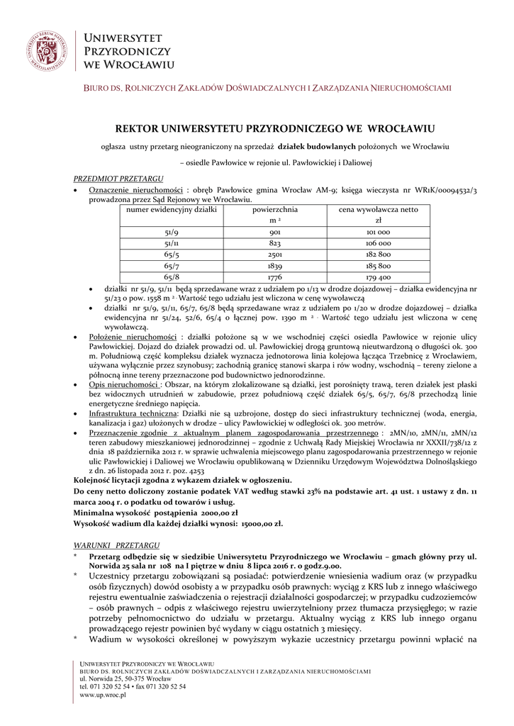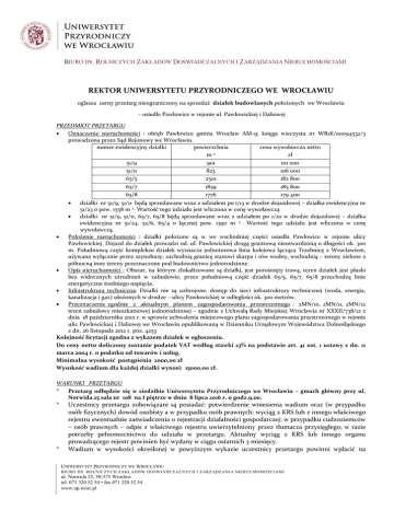 BIURO DS. ROLNICZYCH ZAKŁADÓW DOŚWIADCZALNYCH I ZARZĄDZANIA NIERUCHOMOŚCIAMI REKTOR UNIWERSYTETU PRZYRODNICZEGO WE WROCŁAWIU ogłasza ustny przetarg nieograniczony na sprzedaż działek budowlanych położonych we Wrocławiu – osiedle Pawłowice w rejonie ul. Pawłowickiej i Daliowej PRZEDMIOT PRZETARGU • Oznaczenie nieruchomości : obręb Pawłowice gmina Wrocław AM-9; księga wieczysta nr WR1K/00094532/3 prowadzona przez Sąd Rejonowy we Wrocławiu. numer ewidencyjny działki powierzchnia cena wywoławcza netto m2 zł 51/9 901 101 000 51/11 823 106 000 65/5 2501 182 800 65/7 1839 185 800 65/8 1776 179 400 działki nr 51/9, 51/11 będą sprzedawane wraz z udziałem po 1/13 w drodze dojazdowej – działka ewidencyjna nr 51/23 o pow. 1558 m 2 . Wartość tego udziału jest wliczona w cenę wywoławczą • działki nr 51/9, 51/11, 65/7, 65/8 będą sprzedawane wraz z udziałem po 1/20 w drodze dojazdowej – działka ewidencyjna nr 51/24, 52/6, 65/4 o łącznej pow. 1390 m 2 . Wartość tego udziału jest wliczona w cenę wywoławczą. • Położenie nieruchomości : działki położone są w we wschodniej części osiedla Pawłowice w rejonie ulicy Pawłowickiej. Dojazd do działek prowadzi od. ul. Pawłowickiej drogą gruntową nieutwardzoną o długości ok. 300 m. Południową część kompleksu działek wyznacza jednotorowa linia kolejowa łącząca Trzebnicę z Wrocławiem, używana wyłącznie przez szynobusy; zachodnią granicę stanowi skarpa i rów wodny, wschodnią – tereny zielone a północną inne tereny przeznaczone pod budownictwo jednorodzinne. • Opis nieruchomości : Obszar, na którym zlokalizowane są działki, jest porośnięty trawą, teren działek jest płaski bez widocznych utrudnień w zabudowie, przez południową część działek 65/5, 65/7, 65/8 przechodzą linie energetyczne średniego napięcia. • Infrastruktura techniczna: Działki nie są uzbrojone, dostęp do sieci infrastruktury technicznej (woda, energia, kanalizacja i gaz) ułożonych w drodze – ulicy Pawłowickiej w odległości ok. 300 metrów. • Przeznaczenie zgodnie z aktualnym planem zagospodarowania przestrzennego : 2MN/10, 2MN/11, 2MN/12 teren zabudowy mieszkaniowej jednorodzinnej – zgodnie z Uchwałą Rady Miejskiej Wrocławia nr XXXII/738/12 z dnia 18 października 2012 r. w sprawie uchwalenia miejscowego planu zagospodarowania przestrzennego w rejonie ulic Pawłowickiej i Daliowej we Wrocławiu opublikowaną w Dzienniku Urzędowym Województwa Dolnośląskiego z dn. 26 listopada 2012 r. poz. 4253 Kolejność licytacji zgodna z wykazem działek w ogłoszeniu. Do ceny netto doliczony zostanie podatek VAT według stawki 23% na podstawie art. 41 ust. 1 ustawy z dn. 11 marca 2004 r. o podatku od towarów i usług. Minimalna wysokość postąpienia 2000,00 zł Wysokość wadium dla każdej działki wynosi: 15000,00 zł. • WARUNKI PRZETARGU * Przetarg odbędzie się w siedzibie Uniwersytetu Przyrodniczego we Wrocławiu – gmach główny przy ul. Norwida 25 sala nr 108 na I piętrze w dniu 8 lipca 2016 r. o godz.9.00. * * Uczestnicy przetargu zobowiązani są posiadać: potwierdzenie wniesienia wadium oraz (w przypadku osób fizycznych) dowód osobisty a w przypadku osób prawnych: wyciąg z KRS lub z innego właściwego rejestru ewentualnie zaświadczenia o rejestracji działalności gospodarczej; w przypadku cudzoziemców – osób prawnych – odpis z właściwego rejestru uwierzytelniony przez tłumacza przysięgłego; w razie potrzeby pełnomocnictwo do udziału w przetargu. Aktualny wyciąg z KRS lub innego organu prowadzącego rejestr powinien być wydany w ciągu ostatnich 3 miesięcy. Wadium w wysokości określonej w powyższym wykazie uczestnicy przetargu powinni wpłacić na UNIWERSYTET PRZYRODNICZY WE WROCŁAWIU BIURO DS. ROLNICZYCH ZAKŁADÓW DOŚWIADCZALNYCH I ZARZĄDZANIA NIERUCHOMOŚCIAMI ul. Norwida 25, 50-375 Wrocław tel. 071 320 52 54 • fax 071 320 52 54 www.up.wroc.pl BIURO DS. ROLNICZYCH ZAKŁADÓW DOŚWIADCZALNYCH I ZARZĄDZANIA NIERUCHOMOŚCIAMI * * * * * * * * * * konto Uczelni : PKO BP S.A. Wrocław 62 1020 5242 0000 2102 0029 2045. Dowodem wniesienia wadium jest potwierdzenie z banku lub dokument elektroniczny sporządzony na podstawie art. 7 ustawy Prawo Bankowe (Dz.U. z 2012 r. poz. 1376 z późn. zm.) Przetarg uważa się za zakończony wynikiem negatywnym jeżeli żaden z uczestników przetargu nie zaoferował ceny wyższej od wywoławczej o co najmniej jedno postąpienie. Wadium wpłacone przez oferentów , których oferty nie zostały przyjęte , zostanie zwrócone po przetargu. Wadium wpłacone przez uczestnika przetargu , który przetarg wygrał zalicza się na poczet ceny nabycia nieruchomości. Wadium przepada na rzecz Uczelni, jeżeli oferent, którego oferta zostanie przyjęta, uchyli się od zawarcia umowy. Umowa warunkowa w formie notarialnej zostanie zawarta w terminie najpóźniej do 30 dni od daty przetargu. Wymóg zawarcia umowy warunkowej wynika z przepisu prawa : art. 109 ustawy z dn. 21 sierpnia 1997 r. o gospodarce nieruchomościami ( tekst jedn. Dz.U. z 2004r. nr 261 poz. 2603 ) , na podstawie którego Gminie przysługuje prawo pierwokupu. Umowa przeniesienia własności w formie notarialnej zawarta zostanie w terminie najpóźniej do 30 dni od otrzymania oświadczenia Gminy o rezygnacji z prawa pierwokupu. Oferent , który przetarg wygra obowiązany jest do zapłaty ceny sprzedaży netto powiększonej o podatek VAT w wysokości 23% w terminie najpóźniej do dnia zawarcia umowy przeniesienia własności. Koszty sporządzenia umowy notarialnej , opłaty sądowe oraz podatek VAT ponosi nabywca. Cudzoziemcy ( w rozumieniu ustawy z dnia 24 marca 1920r. o nabywaniu nieruchomości przez cudzoziemców – Dz.U. z 2004r. , nr 167 poz. 1758 z późn. zm. ) w przypadku wygrania przetargu zobowiązani są przed zawarciem umowy notarialnej uzyskać zgodę Ministra Spraw Wewnętrznych na nabycie nieruchomości w przypadkach , gdy z