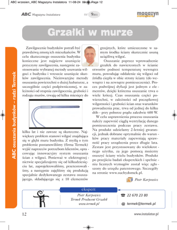 ABC wrzesien_ABC Magazynu Instalatora 11-08-24 09:47 Page 12 ABC Magazynu Instalatora nr 92011 ABC osuszania budynków – radzi Termek Grzałki w murze Zawilgocenie budynków potrafi być prawdziwą zmorą ich mieszkańców. W celu skutecznego osuszenia budynku konieczne jest najpierw usunięcie przyczyny zawilgocenia, następnie zastosowanie wybranej metody usuwania wilgoci z budynku i wreszcie usunięcie skutków zawilgocenia. Nieinwazyjne metody osuszania powierzchni o dużej kubaturze, a szczególnie części podpiwniczonej, w zależności od stopnia zawilgocenia, grubości i rodzaju murów, trwają od kilku miesięcy do grzejnych, które umieszczone w samym środku ściany skutecznie usuną uciążliwą wilgoć. Osuszanie poprzez wprowadzenie grzałek do nawierconych w ścianie otworów podnosi temperaturę wewnątrz muru, powodując oddalenie się wilgoci od źródła ciepła w obie strony ściany (do wewnątrz i na zewnątrz pomieszczenia). Proces podwójnej dyfuzji jest jednym z ele mentów, dzięki któremu osuszanie trwa o wiele krócej. Czas osuszania części powierzchni, w zależności od początkowej wilgotności i grubości ścian oraz warunków prowadzenia prac, trwa od jednej do kilku dób - przy poborze prądu zaledwie 600 W. W celu usprawnienia procesu osuszania należy zapewnić ciągłą wentylację danego pomieszczenia podczas pracy zestawu. Na produkt udzielamy 2-letniej gwarankilku lat i nie zawsze są skuteczne. Najcji, jednak dobrane optymalnie do warun większy problem stanowi wilgoć znajdująca ków pracy materiały zapewniają sprawsię w głębi muru budynku. Z myślą o tym ność pracy urządzenia przez długie lata. problemie postanowiliśmy (firma Termek) Zestaw jest przystosowany do wielokrot wyjść naprzeciw potrzebom klientów, opra nego użytku, za jego pomocą możemy cowując innowacyjny system osuszania osuszyć ściany wielu budynków. Produkt ścian z wilgoci. Ponieważ w elektrogrzej po przejściu badań eksperckich i spełnie nictwie specjalizujemy się od kilkudziesięniu licznych wymogów został więc zgło ciu lat, zaprojektowaliśmy, przetestowali szony do urzędu patentowego. Szczegóły śmy, a następnie zajęliśmy się produkcją na stronie www.suchydomek.pl. specjalnie dedykowanego zestawu osuszającego, składającego się z 10 elementów PiotrKarpowicz ekspert PiotrKarpowicz TermekProducentGrzałek www.termek.pl 12 ☎ 22 670 23 80 @ [email protected] www.instalator.pl