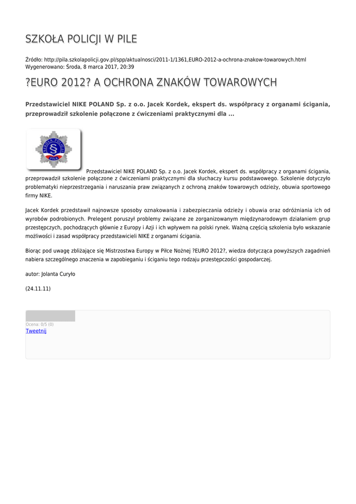 SZKOŁA POLICJI W PILE Źródło: http://pila.szkolapolicji.gov.pl/spp/aktualnosci/2011-1/1361,EURO-2012-a-ochrona-znakow-towarowych.html Wygenerowano: Środa, 8 marca 2017, 20:39 ?EURO 2012? A OCHRONA ZNAKÓW TOWAROWYCH Przedstawiciel NIKE POLAND Sp. z o.o. Jacek Kordek, ekspert ds. współpracy z organami ścigania, przeprowadził szkolenie połączone z ćwiczeniami praktycznymi dla ... Przedstawiciel NIKE POLAND Sp. z o.o. Jacek Kordek, ekspert ds. współpracy z organami ścigania, przeprowadził szkolenie połączone z ćwiczeniami praktycznymi dla słuchaczy kursu podstawowego. Szkolenie dotyczyło problematyki nieprzestrzegania i naruszania praw związanych z ochroną znaków towarowych odzieży, obuwia sportowego firmy NIKE. Jacek Kordek przedstawił najnowsze sposoby oznakowania i zabezpieczania odzieży i obuwia oraz odróżniania ich od wyrobów podrobionych. Prelegent poruszył problemy związane ze zorganizowanym międzynarodowym działaniem grup przestępczych, pochodzących głównie z Europy i Azji i ich wpływem na polski rynek. Ważną częścią szkolenia było wskazanie możliwości i zasad współpracy przedstawicieli NIKE z organami ścigania. Biorąc pod uwagę zbliżające się Mistrzostwa Europy w Piłce Nożnej ?EURO 2012?, wiedza dotycząca powyższych zagadnień nabiera szczególnego znaczenia w zapobieganiu i ściganiu tego rodzaju przestępczości gospodarczej. autor: Jolanta Curyło (24.11.11) Ocena: 0/5 (0) Tweetnij
