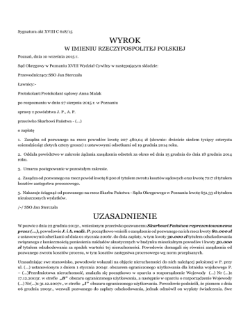 Sygnatura akt XVIII C 618/15 WYROK W IMIENIU RZECZYPOSPOLITEJ POLSKIEJ Poznań, dnia 10 września 2015 r. Sąd Okręgowy w Poznaniu XVIII Wydział Cywilny w następującym składzie: Przewodniczący:SSO Jan Sterczała Ławnicy:Protokolant:Protokolant sądowy Anna Malak po rozpoznaniu w dniu 27 sierpnia 2015 r. w Poznaniu sprawy z powództwa J. P., A. P. przeciwko Skarbowi Państwa - (...) o zapłatę 1. Zasądza od pozwanego na rzecz powodów kwotę 207 480,04 zł (słownie: dwieście siedem tysięcy czterysta osiemdziesiąt złotych cztery grosze) z ustawowymi odsetkami od 19 grudnia 2014 roku. 2. Oddala powództwo w zakresie żądania zasądzenia odsetek za okres od dnia 15 grudnia do dnia 18 grudnia 2014 roku. 3. Umarza postępowanie w pozostałym zakresie. 4. Zasądza od pozwanego na rzecz powód kwotę 8 500 zł tytułem zwrotu kosztów sądowych oraz kwotę 7217 zł tytułem kosztów zastępstwa procesowego. 5. Nakazuje ściągnąć od pozwanego na rzecz Skarbu Państwa - Sądu Okręgowego w Poznaniu kwotę 651,33 zł tytułem nieuiszczonych wydatków. /-/ SSO Jan Sterczała UZASADNIENIE W pozwie z dnia 22 grudnia 2013r., wniesionym przeciwko pozwanemu Skarbowi Państwa reprezentowanemu przez (...), powodowie J. i A. małż. P. początkowo wnieśli o zasądzenie od pozwanego na ich rzecz kwoty 80.000 zł z ustawowymi odsetkami od dnia 01 stycznia 2006r. do dnia zapłaty, w tym kwoty 30.000 zł tytułem odszkodowania związanego z koniecznością poniesienia nakładów akustycznych w budynku mieszkalnym powodów i kwoty 50.000 zł tytułem odszkodowania za spadek wartości tej nieruchomości. Powodowie domagali się również zasądzenia od pozwanego zwrotu kosztów procesu, w tym kosztów zastępstwa procesowego wg norm przepisanych. Uzasadniając swe stanowisko, powodowie wskazali na objęcie nieruchomości do nich należącej położonej w P. przy ul. (...) ustanowionym z dniem 1 stycznia 2004r. obszarem ograniczonego użytkowania dla lotniska wojskowego P. – (...)Przedmiotowa nieruchomość, znalazła się początkowo w oparciu o rozporządzenie Wojewody (...) Nr (...)z 17.12.2003r. w strefie „B” obszaru ograniczonego użytkowania, a następnie w oparciu o rozporządzenie Wojewody (...) Nr(...)z 31.12.2007r., w strefie „I” obszaru ograniczonego użytkowania. Powodowie podnieśli, że pismem z dnia 06 grudnia 2005r., wezwali pozwanego do zapłaty odszkodowania, jednak odmówił on wypłaty świadczenia. Swe roszczenia, powodowie wywiedli z przepisów ustawy z dnia 27 kwietnia 2001r. Prawo ochrony środowiska (t.jedn. opubl. Dz.U. z 2006 r., Nr 129, poz. 902 ze zm.), w szczególności art. 129 ust. 2 w zw. z art. 136 ust. 3 ustawy. Powodowie wskazali, że doznana przez nich szkoda obejmuje również zmniejszenie się wartości nieruchomości w świetle art. 435 kc w zw. z art. 322 u.p.o.ś. Powodowie określili podmiot zobowiązany do naprawienia doznanej przez nich szkody i wymienili ograniczenia zaistniałe w związku z ustanowieniem obszaru ograniczonego użytkowania, czyniąc podstawą prawną swoich roszczeń art. 435 k.c. w zw. z art. 322-325 w zw. z art. 129 ust. 2 ustawy Prawo ochrony środowiska - jeśli chodzi o naprawienie szkody w postaci spadku wartości nieruchomości oraz art. 129 ust. 2 w zw. z art. 136 ust. 3 tej ustawy - jeśli chodzi o koszty rewitalizacji akustycznej budynku znajdującego się na niej. Przepisy te strona powodowa poddała analizie z uwzględnieniem treści art. 140 k.c. i art. 144 k.c. oraz zaznaczyła, iż z uwagi na jednolitość orzecznictwa Sądu Najwyższego w kwestii wykładni art. 129 ust. 2 u.p.o.ś. wyłącznie z ostrożności powołuje przepisy art. 435 k.c. w zw. z art. 322-325 ustawy Prawo ochrony środowiska. Powodowie wskazali, że poziom hałasu w pomieszczeniach budynku mieszkalnego, jak również izolacyjność ścian zewnętrznych, muszą być zgodne z Polskimi Normami, bowiem odsyła do nich wprost Rozporządzenie Ministra Infrastruktury z dnia 12 kwietnia 2002r., w sprawie warunków technicznych, jakim powinny odpowiadać budynki i ich usytuowanie. W odpowiedzi na pozew z dnia 21 lutego 2014r., pozwany Skarb Państwa reprezentowany przez (...)wniósł o oddalenie powództwa w całości i o zasądzenie od powoda zwrotu kosztów procesu, w tym kosztów zastępstwa procesowego wg norm przepisanych. Pozwany zakwestionował roszczenia powoda zarówno co do zasady jak i co do wysokości. Wskazał, że powodowie nie wykazali, by ich nieruchomość –na podstawie rozporządzenia Wojewody (...) nr (...)z 31.12.2007r., znalazła się w strefie I. W ocenie pozwanego powodowie nie wykazali również, aby w okresie 2 lat od dnia wejścia w życie rozporządzenia Nr (...), tj. od dnia 01 stycznia 2004r., zgłosił żądania przewidziane w art. 129 ust. 2 ustawy Prawo ochrony środowiska, co sprawia, że jego roszczenia wygasły. Termin z art. 129 ust. 4 ustawy jest zaś terminem zawitym, upływ którego wiąże się z ostatecznym wygaśnięciem roszczeń. W ocenie strony pozwanej, termin zgłoszenia żądania upłynął dla powodów mimo tego, że w dniu 29 grudnia 2005r. złożyli do Sądu Okręgowego w Poznaniu pozew o zobowiązanie pozwanego do wykupienia przedmiotowej nieruchomości, ewentualnie wydania nieruchomości zamiennej lub zapłaty odszkodowania, bowiem Sąd w dniu 14 września 2009r., umorzył je na podstawie art. 182 § 1 kpc, po wcześniejszym zawieszeniu na zgodny wniosek stron. Strona pozwana podniosła również, że nawet gdyby uznać, że powyższe postępowanie sądowe przerwało bieg terminu przedawnienia, to po uprawomocnieniu się postanowienia o umorzeniu, zaczął on biec na nowo, co z kolei powoduje, że najpóźniejszym terminem, do jakiego powodowie winni byli zgłosić swe roszczenia jest wrzesień 2011r., skoro więc nie zachowali terminu prekluzyjnego, ich roszczenie wygasło. W ocenie pozwanego brak jest również podstaw do przyjęcia rozwiązania, zgodnie z którym po zgłoszeniu roszczenia p