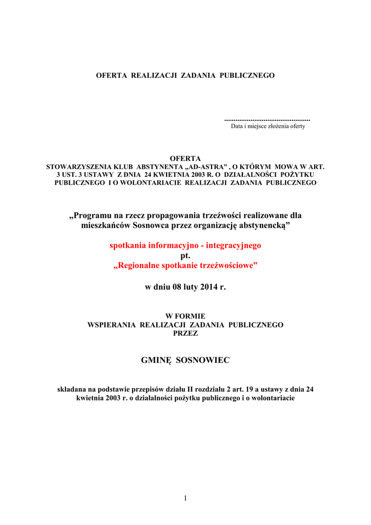 OFERTA REALIZACJI ZADANIA PUBLICZNEGO .............................................. Data i miejsce złożenia oferty OFERTA STOWARZYSZENIA KLUB ABSTYNENTA „AD-ASTRA” , O KTÓRYM MOWA W ART. 3 UST. 3 USTAWY Z DNIA 24 KWIETNIA 2003 R. O DZIAŁALNOŚCI POŻYTKU PUBLICZNEGO I O WOLONTARIACIE REALIZACJI ZADANIA PUBLICZNEGO „Programu na rzecz propagowania trzeźwości realizowane dla mieszkańców Sosnowca przez organizację abstynencką” spotkania informacyjno - integracyjnego pt. „Regionalne spotkanie trzeźwościowe” w dniu 08 luty 2014 r. W FORMIE WSPIERANIA REALIZACJI ZADANIA PUBLICZNEGO PRZEZ GMINĘ SOSNOWIEC składana na podstawie przepisów działu II rozdziału 2 art. 19 a ustawy z dnia 24 kwietnia 2003 r. o działalności pożytku publicznego i o wolontariacie 1 I . Dane oferenta: 1. Nazwa : Stowarzyszenie Klub Abstynenta „Ad-Astra” 2. Forma prawna: Stowarzyszenie 3. Nr. w Krajowym Rejestrze Sądowym: KRS 0000101280 4. Data wpisu, rejestracji lub utworzenia: 5. Nr. NIP 6442775132 13 grudnia 1988 r. Nr. Regon 273335625 6. Adres: miejscowość : dzielnica lub inna jednostka pomocnicza ; gmina : Sosnowiec powiat: województwo: Śląskie kod pocztowy: 41-200 poczta: 7. Tel: 32 266 96 35 , kom. 507 195 965 e-mail: adastra_sosnowiec @ op.pl 8. Numer rachunku bankowego: Nazwa banku: faks: Sosnowiec ul. 3 Maja 11 Centrum Sosnowiec Sosnowiec - http:// www. ad-astra.rzsa.pl 77 1090 2008 0000 0001 1558 6624 Bank Zachodni WBK Oddział Sosnowiec 9. Nazwiska i imiona osób upoważnionych do reprezentowania oferenta: a) b) Zbigniew Świtała Janina Chochół 10. Nazwa, adres i telefon kontaktowy jednostki organizacyjnej bezpośrednio wykonującej zadanie, o którym mowa w ofercie: Stowarzyszenie Klub Abstynenta „Ad-Astra” 41-200 Sosnowiec ul. 3 Maja 11 Tel. 32 266 96 35 tel. kom. 507 195 965 11. Osoba upoważniona do składania wyjaśnień dotyczących oferty ( imię i nazwisko oraz nr. telefonu kontaktowego: Zbigniew Świtała tel. 507 195 965 12. Przedmiot działalności pożytku publicznego: a) działalność nieodpłatna pożytku publicznego: - realizacja zadań zgodnie ze standardami działań stowarzyszenia abstynenckiego - organizowanie różnych form zajęć psychoterapeutycznych z zakresu oświaty zdrowotnej i poza medycznej pomocy 2 - rozwijanie w członkach stowarzyszenia pożytecznych i satysfakcjonujących zainteresowań oraz zapewnienie niezbędnych warunków do spędzania wolnego czasu bez alkoholu całym rodzinom - organizowanie obozów terapeutycznych, udział w zlotach abstynenckich i wycieczkach integracyjnorodzinnych - angażowanie członków stowarzyszenia do prac społecznych i udział wszystkich w realizacji zadań na rzecz ludzi uzależnionych - organizowanie w stowarzyszeniu i poza nim spotkań z przedstawicielami różnych środowisk celem przedstawienia pracy stowarzyszenia i jego form działania, propagowanie i ugruntowywanie modelu trzeźwego stylu bycia - skłanianie osób uzależnionych do podjęcia leczenia odwykowego jak również do wstępowania w szeregi członków stowarzyszenia - nawiązywanie i ugruntowywanie współpracy z tymi organami administracji państwowej i samorządowej, instytucjami i organizacjami społeczno- politycznymi, które mogą pomóc w realizacji celów stowarzyszenia - działania na rzecz szerokiej społeczności lokalnej poprzez udział w festiwalach abstynenckich, forach abstynenckich i imprezach integracyjnych - promowanie działalności stowarzyszenia poprzez plakaty, ulotki, stronę internetową - poprzez przedstawienie działalności wewnętrznej i pokazanie działalności zewnętrznej zachęcanie osób mających problem choroby alkoholowej do odwiedzania stowarzyszenia - organizowanie spotkań dyskusyjnych, pogadanek i prelekcji z doświadczonymi terepeutami i psychologami dotyczących problemów uzależnienia i sposobów wychodzenia z uzależnienia - pomoc i działalność na rzecz społeczności lokalnej Miasta Sosnowca - organizowanie zajęć integracyjnych dla dzieci i młodzieży z rodzin z problemami uzależnień - prowadzenie grup wsparcia i grup samopomocowych dla osób uzależnionych i współuzależnionych b) działalność odpłatna pożytku publicznego: wpłaty i dopłaty uczestników projektu 13. jeżeli oferent prowadzi działalność gospodarczą: a) numer wpisu do rejestru przedsiębiorców b) przedmiot działalności gospodarczej - nie posiadamy nie prowadzimy II. Informacja o sposobie reprezentacji oferenta wobec organu administracji publicznej wraz z przytoczeniem podstawy prawnej: nie dotyczy III. Szczegółowy zakres rzeczowy zadania publicznego proponowanego do realizacji 1.Krótka charakterystyka zadania publicznego: Spotkanie informacyjno- integracyjne pt. „Regionalne spotkanie trzeźwościowe” jest podsumowaniem działalności stowarzyszeń abstynenckich Sosnowca w obchodach XXV lecia ruchu trzeźwościowego na terenie miasta Sosnowca. Spotkanie jest formą przekazu informacji o działaniach stowarzyszeń abstynenckich Sosnowca na rzecz społeczności lokalnej i rodzin z problemem choroby alkoholowej. Spotkanie to również obchody jubileuszu XXV rocznicy powstania Stowarzyszenia Klub Abstynenta „AdAstra” , które na przestrzeni tych 25 lat swoją działalnością promowało ideę trzeźwości wśród 3 mieszkańców Sosnowca. To okazja do przedstawienia działań we współpracy z samorządem lokalnym skierowanych do społeczności lokalnej Sosnowca. Promowanie stowarzyszeń abstynenckich Sosnowca i ich działalności na tle ruchu abstynenckiego woj. śląskiego i kraju. Realizacja zadania publicznego przez Stowarzyszenie Klub Abstynenta „Ad-Astra” zgodnie ze standardami funkcjonowania w obszarze profilaktyki i rozwiązywania problemów alkoholowych dla mieszkańców Sosnowca skierowanych do rodzin z problemem alkoholowym i osób zainteresowanych trzeźwym stylem życia. Stowarzyszenie Klub Abstynenta „Ad-Astra” posiada swoiste obszary działalności zapisane w statucie. 