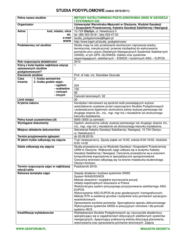 STUDIA PODYPLOMOWE (nabór 2010/2011) Pełna nazwa studiów Organizator Adres kod, miasto, ulica tel. e-mail WWW Podstawowy cel studiów Rok rozpoczęcia działalności Którą z kolei będzie najbliższa edycja opisywanych studiów podyplomowych? Kierownik studiów Czas 1. liczba semestrów trwania 2. liczba godzin zajęć: • ogółem • wykładów • ćwiczeń • innych Limit miejsc Kryteria naboru Pełny koszt uczestnictwa (zł) Wymagane dokumenty Miejsce składania dokumentów Termin przyjmowania zgłoszeń W jakim trybie odbywają się zajęcia Gdzie odbywają się zajęcia Termin rozpoczęcia zajęć w najbliższej edycji/cyklu Ramowa tematyka zajęć Kwalifikacje wykładowców WWW.GEOFORUM.PL METODY SATELITARNEGO POZYCJONOWANIA GNSS W GEODEZJI I SYSTEMACH GIS Uniwersytet Warmińsko-Mazurski w Olsztynie, Wydział Geodezji i Gospodarki Przestrzennej, Katedra Geodezji Satelitarnej i Nawigacji 10-724 Olsztyn, ul. Heweliusza 5 tel. (89) 523-34-81, faks 523-47-23 [email protected] http://www.kgsin.pl/studia_podyplomowe/ Studia mają na celu przekazanie słuchaczom najnowszej wiedzy teoretycznej, merytorycznej i prawnej niezbędnej do wykonywania pomiarów przy użyciu Globalnych Nawigacyjnych Systemów Satelitarnych (GNSS), w tym GPS, GLONASS, Galileo oraz systemów wspomagających: satelitarnych – EGNOS i naziemnych ASG – EUPOS. 2010 1. Prof. dr hab. inż. Stanisław Oszczak 2 224 102 90 Ćwiczeń terenowych: 32 20 Kandydaci rekrutowani są spośród osób posiadających wyższe wykształcenie uzyskane przed rozpoczęciem Studiów Podyplomowych i poświadczone dyplomem ukończenia szkoły wyższej pierwszego lub drugiego stopnia (lic., inż., mgr, mgr inż.) niezależnie od ukończonego kierunku kształcenia. 6000 (3000 za semestr) Dyplom ukończenia szkoły wyższej pierwszego lub drugiego stopnia (lic., inż., mgr, mgr inż.) niezależnie od ukończonego kierunku kształcenia. Sekretariat Katedry Geodezji Satelitarnej i Nawigacji, 10-724 Olsztyn, ul. Heweliusza 5 do 20.09.2010r. Tryb niestacjonarny. Zjazdy piątek od 16:00, sobota 8:00-18:00, niedziela 8:00-14:00 Studia prowadzone są na Wydziale Geodezji i Gospodarki Przestrzennej UWM w Olsztynie. Większość zajęć odbywa się w budynku Katedry Geodezji Satelitarnej i Nawigacji. Ćwiczenia prowadzone są w pracowni komputerowej wyposażonej w specjalistyczne oprogramowanie. Ćwiczenia terenowe odbywają się na terenie miasteczka studenckiego Olsztyn-Kortowo. Październik 2010r. Zasady działania i budowa systemów GNSS System WAAS/EGNOS Metody absolutne i względne wyznaczania pozycji Układy współrzędnych stosowane w Polsce Wielofunkcyjny system precyzyjnego pozycjonowania satelitarnego ASGEUPOS Wykorzystanie ASG-EUPOS do prac geodezyjnych i kartograficznych. Metody RTK w ewidencji gruntów i budynków oraz pomiarach sytuacyjnowysokościowych. Opracowanie wyników pomiarów. Sporządzenie operatu obliczeniowego Wykorzystanie systemów GNSS w precyzyjnym rolnictwie i dla potrzeb systemu IACS Wykładowcami Studiów Podyplomowych są: nauczyciele akademiccy specjalizujący się w zagadnieniach dotyczących satelitarnych systemów nawigacyjnych, dysponujący praktyczną wiedzą dotyczącą planowania, wykonywania oraz opracowania pomiarów terenowych. Zajęcia MAGAZYN GEODETA Warunkiem ukończenia studiów jest 1. wykonanie pracy końcowej 2. zaliczenie egzaminu końcowego 3. inne Łączna liczba osób, które dotychczas ukończyły studia podyplomowe Informacje dodatkowe WWW.GEOFORUM.PL prowadzone są również przez przedstawicieli urzędów i przedsiębiorstw wykorzystujących technologie satelitarne. Warunkiem uzyskania świadectwa ukończenia studiów jest zaliczenie przedmiotów i testów sprawdzających wiedzę w trakcie studiów oraz zdanie egzaminu ustnego połączonego z obroną pracy dyplomowej - MAGAZYN GEODETA