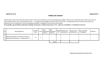 Załącznik Nr 1 AE/ZP-27-10/12 FORMULARZ CENOWY Wartość brutto zamówienia winna być obliczona jako wartość netto powiększona o kwotę obowiązującego podatku. Wartość netto zamówienia należy obliczyć jako iloczyn liczby jednostek miary przez cenę jednostkową netto, a uzyskaną kwotę zaokrąglić do dwóch miejsc po przecinku. Cenę jednostkową brutto należy obliczyć jako cenę jednostkową netto powiększoną o kwotę obowiązującego podatku i zaokrąglić do dwóch miejsc po przecinku. W przypadku, gdy przedmiot zamówienia obejmuje asortyment o zróżnicowanej stawce VAT - należy go wyodrębnić w Formularzu Cenowym L.p 1. Wyszczególnienie Myjnia-dezynfektor do basenów i kaczek o parametrach określonych w Załączniku Nr 6 Jednostka miary szt. Cena Cena Ilość jednostkowa jednostkowa netto w zł brutto w zł Stawka Wartość netto Wartość brutto Nazwa handlowa VAT zamówienia w zł zamówienia w zł -nr katalogowy Producent 3 Razem ....................................................................... Podpis osoby uprawnionej do złożenia oferty