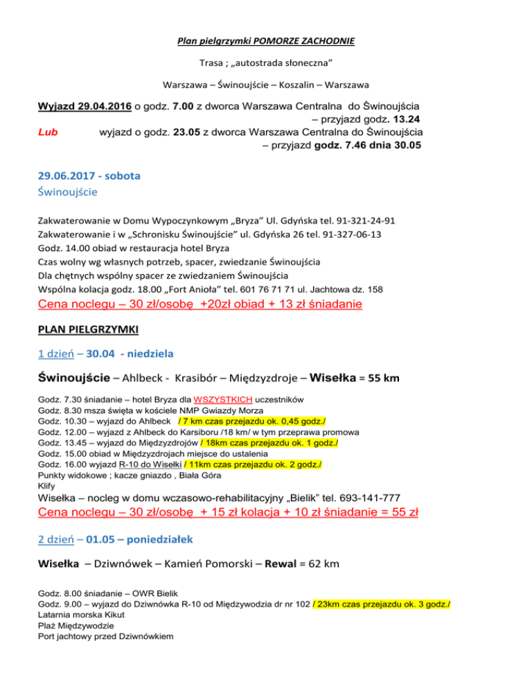 Plan pielgrzymki POMORZE ZACHODNIE Trasa ; „autostrada słoneczna” Warszawa – Świnoujście – Koszalin – Warszawa Wyjazd 29.04.2016 o godz. 7.00 z dworca Warszawa Centralna do Świnoujścia – przyjazd godz. 13.24 Lub wyjazd o godz. 23.05 z dworca Warszawa Centralna do Świnoujścia – przyjazd godz. 7.46 dnia 30.05 29.06.2017 - sobota Świnoujście Zakwaterowanie w Domu Wypoczynkowym „Bryza” Ul. Gdyńska tel. 91-321-24-91 Zakwaterowanie i w „Schronisku Świnoujście” ul. Gdyńska 26 tel. 91-327-06-13 Godz. 14.00 obiad w restauracja hotel Bryza Czas wolny wg własnych potrzeb, spacer, zwiedzanie Świnoujścia Dla chętnych wspólny spacer ze zwiedzaniem Świnoujścia Wspólna kolacja godz. 18.00 „Fort Anioła” tel. 601 76 71 71 ul. Jachtowa dz. 158 Cena noclegu – 30 zł/osobę +20zł obiad + 13 zł śniadanie . J158, 72info -600inf ŚwinoujścieJ600 Świnoujście PLAN PIELGRZYMKI 1 dzień – 30.04 - niedziela Świnoujście – Ahlbeck - Krasibór – Międzyzdroje – Wisełka = 55 km Godz. 7.30 śniadanie – hotel Bryza dla WSZYSTKICH uczestników Godz. 8.30 msza święta w kościele NMP Gwiazdy Morza Godz. 10.30 – wyjazd do Ahlbeck / 7 km czas przejazdu ok. 0,45 godz./ Godz. 12.00 – wyjazd z Ahlbeck do Karsiboru /18 km/ w tym przeprawa promowa Godz. 13.45 – wyjazd do Międzyzdrojów / 18km czas przejazdu ok. 1 godz./ Godz. 15.00 obiad w Międzyzdrojach miejsce do ustalenia Godz. 16.00 wyjazd R-10 do Wisełki / 11km czas przejazdu ok. 2 godz./ Punkty widokowe ; kacze gniazdo , Biała Góra Klify Wisełka – nocleg w domu wczasowo-rehabilitacyjny „Bielik” tel. 693-141-777 Cena noclegu – 30 zł/osobę + 15 zł kolacja + 10 zł śniadanie = 55 zł 2 dzień – 01.05 – poniedziałek Wisełka – Dziwnówek – Kamień Pomorski – Rewal = 62 km Godz. 8.00 śniadanie – OWR Bielik Godz. 9.00 – wyjazd do Dziwnówka R-10 od Międzywodzia dr nr 102 / 23km czas przejazdu ok. 3 godz./ Latarnia morska Kikut Plaż Międzywodzie Port jachtowy przed Dziwnówkiem Godz. 12.00 wyjazd do Kamienia Pomorskiego dr nr 107 do m. Wrzosowo dalej w prawo ( obok zat. Wrzosowej ) przez Żółcino ( droga obok zalewu Kamieńskiego ) / 11 km czas przejazdu ok. 0,50 godz./ Katedra w Kamieniu Pomorskim z organami, rynek, głaz królewski, pręgierz przy ratuszu, /przy dobrej pogodzie objazd wyspy Chrząszczewo 11 rodzin zamieszkuje/ Godz. 14.00 obiad w Kamieniu Pomorskim miejsce do ustalenia Godz. 15.00 wyjazd do Rewala dr nr 107 od m. Radawka i m. Łukęcin R-10 / 28 km czas przejazdu ok. 2 godz./ Pobierowo; Trzęsacz; ruiny kościoła (400m) Park wieloryba w Rewalu Rewal – nocleg w pensjonacie „Skorpion” ul. Bałtycka 6 tel. 660-031-362 Ok. godz. 19.00 zorganizować kolację (smażalnia ryb wspólnie) lub we własnym zakresie Cena noclegu – 35 zł/osobę 3 dzień – 02.05 – wtorek Rewal – Mrzeżyno – Dźwirzyno – Kołobrzeg – Ustronie Morskie = 62km Godz. 8.00 śniadanie – zorganizować katering lub we własnym zakresie Godz. 9.00 – wyjazd do Mrzeżyna ) / 21 km czas przejazdu ok. 1,50 godz./ Sprawdzić możliwość zwiedzenia JW. W Mrzeżynie Godz. 11.00 – wyjazd do Dźwirzyna p/Rogowo/ 9 km czas przejazdu ok. 1,50 godz./ Port morski w Mrzeżynie W Rogowie przerwa w WDW Rogowo na kawę Lotnisko na jeż. Resko Pomorskie w II wojnie Godz. 11.00 – wyjazd do Kołobrzegu / 18 km czas przejazdu ok. 1,30 godz./ Godz. 13.00 – 15.00 Kołobrzeg ; Zwiedzanie Godz. 15.00 – Kołobrzeg obiad miejsce do ustalenia Godz. 16.00 – wyjazd do Ustronia Morskiego / 14 km czas przejazdu ok. 1,00 godz./ Dawne lotnisko armii czerwonej obecnie dzielnica Kołobrzegu Ustronie Morskie – nocleg w domu wczasowym „Janosik” ul. Chrobrego 40 tel. 503-639-716 Ok. godz. 19.00 zorganizować kolację (smażalnia ryb lub OW wspólnie) lub we własnym zakresie Cena noclegu – 40 zł/osobę + 15 zł śniadanie 4 dzień – 03.05 – środa Ustronie Morskie – Gąski – Sarbinowo – Mielno – Łazy – Koszalin = 55 km Godz. 8.00 śniadanie - OW Janosik Godz. 9.00 – wyjazd do Gąsek R-10 / 14 km czas przejazdu ok. 1,00 godz./ Latarnia morska Gąski Godz. 10.00 – wyjazd do Sarbinowo R-10 / 4 km czas przejazdu ok. 0,30 godz./ Godz. 10.30 – wyjazd do Mielna R-10 / 6 km czas przejazdu ok. 0,30 godz./ Droga prowadzi ulicami dr miejskich wokół jeż Jamno aż do Koszalina Godz. 11.30 – wyjazd do Łaz przez Unieście R-10 / 13 km czas przejazdu ok. 1,00 godz./ Postój na słynne gofry w Unieściu (ok godz. 12.00 obiad w Unieściu lub Łazach ) Godz. 13.00 – wyjazd ul. Morską – ul. Koszalińską – ul. Władysława IV do Koszalina na górę Chełmską (14-15) / 18 km czas przejazdu ok. 1,00 godz./ Zwiedzanie Koszalina ; Góra Chełmska , tereny dożynkowe , prace – rzeźby Hasiora , Katedra Koszalińska – msza św. o godz. 18.00 kończy pielgrzymkę 1. Powrót z Koszalina w dniu 03.05.2017 o godz. 21.40 pociąg bezpośredni do warszawy przyjazd godz. 4.20 dn. 04.05.2017 lub godz. 16.24 z przesiadką w Gdyni (18.20-18.27)przyjazd do warszawy godz. 21.45 Nocleg w pociągu do Warszawy STATYSTYKA • Ogółem do przejechania 234 km • Noclegi 138 zł