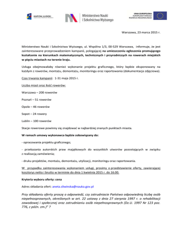 Warszawa, 23 marca 2015 r. Ministerstwo Nauki i Szkolnictwa Wyższego, ul. Wspólna 1/3, 00-529 Warszawa, informuje, że jest zainteresowane przeprowadzeniem kampanii, polegającej na umieszczeniu ogłoszenia promującego kształcenie na kierunkach matematycznych, technicznych i przyrodniczych na rowerach miejskich w pięciu miastach na terenie kraju. Usługa obejmowałaby również wykonanie projektu graficznego, który będzie eksponowany na każdym z rowerów, montażu, demontażu, monitoringu oraz raportowania (dokumentacja zdjęciowa). Czas trwania kampanii: 1-31 maja 2015 r. Liczba miast oraz ilość rowerów: Warszawa – 200 rowerów Poznań – 51 rowerów Opole – 46 rowerów Sopot – 24 rowery Lublin – 100 rowerów Stacje rowerowe powinny się znajdować w najbardziej znanych punktach miasta. W ramach umowy wykonawca będzie zobowiązany do: - opracowania projektu graficznego; - przekazania autorskich praw majątkowych do wszystkich utworów pozostających w związku z realizacją zamówienia; - druku projektów, montażu, demontażu, utylizacji, monitoringu oraz raportowania. W przypadku zainteresowania wykonaniem usługi, prosimy o przedstawienie oferty, zawierającej kosztorys netto i brutto w terminie do dnia 1 kwietnia 2015 r. do 16.00. Kryteria wyboru oferty: cena Adres składania ofert: [email protected] Przy składaniu oferty proszę o odpowiedź, czy zatrudniacie Państwo odpowiednią liczbę osób niepełnosprawnych, określonych w art. 22 ustawy z dnia 27 sierpnia 1997 r. o rehabilitacji zawodowej i społecznej oraz zatrudnianiu osób niepełnosprawnych (Dz.U. 1997 Nr 123 poz. 776, z późn. zm.)” ? Proszę o odpowiedz TAK– NIE. Rodzaj odpowiedzi nie jest brany pod uwagę przy ocenie ofert. Zamawiający zastrzega sobie prawo do odstąpienia od zamówienia bez podania przyczyny. Postępowanie prowadzone na podstawie art. 4 pkt 8 ustawy Prawo zamówień publicznych