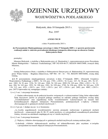 DZIENNIK URZĘDOWY WOJEWÓDZTWA PODLASKIEGO Białystok, dnia 10 listopada 2015 r. Elektronicznie podpisany przez: Teresa Bożena Koczta Poz. 3597 Data: 2015-11-10 13:43:12 ANEKS NR 20 z dnia 19 października 2015 r. do Porozumienia Międzygminnego zawartego w dniu 27 listopada 2009 r. w sprawie powierzenia realizacji zadań w zakresie prowadzenia lokalnego transportu zbiorowego na obszarze Gminy Dobrzyniewo Duże pomiędzy: Miastem Białystok, z siedzibą w Białymstoku przy ul. Słonimskiej 1, reprezentowanym przez Prezydenta Miasta Białegostoku - Tadeusza Truskolaskiego, NIP 542-030-46-37, REGON 000515000, zwanym dalej Miastem, a Gminą Dobrzyniewo Duże, z siedzibą w Dobrzyniewie Dużym przy ul. Białostockiej 25, reprezentowaną przez Wójta Gminy – Bogdana Zdanowicza, NIP 966 - 05 - 16 – 743, REGON 000536806, zwaną dalej Gminą, § 1. W porozumieniu międzygminnym zawartym w dniu 27 listopada 2009 r. (Dziennik Urzędowy Województwa Podlaskiego z 2009 r. Nr 232, poz. 2785, z 2010 r. Nr 8, poz. 167, Nr 38, poz. 691, Nr 67, poz. 1065, Nr 81, poz. 1236, Nr 142, poz. 1848, Nr 162, poz. 2020 i Nr 243, poz. 2964, z 2011 r. Nr 12, poz. 204, Nr 165, poz. 1952, Nr 188, poz. 2281, Nr 229, poz. 2720, Nr 238, poz. 2858, Nr 265, poz. 3159 i Nr 315, poz. 4191, z 2012 r. poz. 1312, z 2013 r. poz. 427, z 2014 r. poz. 2682, poz. 4003, z 2015 r. poz. 2657) wprowadza się, następujące zmiany: 1) w § 3 ust. 1 otrzymuje brzmienie: „1. Gmina zobowiązuje się do pokrycia kosztów związanych z wykonywaniem Usług, które odpowiadać będą iloczynowi stawki za przejazd jednego autobusu na odcinku jednego kilometra zwanej dalej „wozokilometrem” oraz uzgodnionej liczby wozokilometrów wykonywanych na trasach linii komunikacyjnych objętych niniejszym Porozumieniem, pomniejszonych o wpływy z biletów obowiązujących w gminnych strefach taryfowych.”; 2) w § 3 po ust. 1 dodaje się ust. 1a w brzmieniu: „1a. Liczba uzgodnionych wozokilometrów zawiera przejazdy realizowane w gminnych strefach taryfowych – oznaczonych jako II, III, IV strefa taryfowa, a w przypadkach uzasadnionych potrzebami Gminy, również na odcinkach znajdujących się w I strefie taryfowej.”; 3) w § 3 ust. 2 otrzymuje brzmienie: „2. Wpływy z biletów obowiązujących w gminnych strefach taryfowych zostaną ustalone jako: 1) dochody z biletów elektronicznych możliwe od zidentyfikowania jako uzyskane w związku z przejazdami na trasach objętych niniejszym Porozumieniem; Dziennik Urzędowy Województwa Podlaskiego –2– Poz. 3597 2) dochody ze sprzedaży biletów imiennych zakupionych przez pasażerów zamieszkałych na terenie Gminy oraz innych biletów obowiązujących wyłącznie na terenie Gminy; 3) dochody ze sprzedaży biletów imiennych zakupionych przez pasażerów zamieszkałych w Białymstoku i poza obszarem objętym analogicznymi Porozumieniami w proporcji określonej jako iloraz sumy wpływów z biletów imiennych zakupionych przez pasażerów zamieszkałych na terenie Gminy i sumy wpływów z biletów imiennych obowiązujących w II strefie taryfowej zakupionych przez pasażerów ze wszystkich Gmin objętych analogicznymi Porozumieniami; 4) dochody ze sprzedaży innych biletów z zastosowaniem proporcji określonej w punkcie 3; 5) przy ustalaniu dochodu ze sprzedaży biletów elektronicznych przyjmuje się koszty dystrybucji w wysokości 4,00% ceny brutto biletu; 6) przy ustalaniu dochodu ze sprzedaży biletów papierowych uwzględnia się koszty dystrybucji odzwierciedlone w rzeczywistej cenie sprzedaży.”; 4) załącznik do Porozumienia Międzygminnego zawartego w dniu 27 listopada 2009 r. otrzymuje nowe brzmienie określone w załączniku do niniejszego Aneksu. § 2. Pozostałe warunki porozumienia międzygminnego pozostają bez zmian. § 3. Aneks sporządzony został w dwóch jednobrzmiących egzemplarzach, po jednym dla każdej ze stron. § 4. Postanowienia niniejszego Aneksu wchodzą w życie z dniem podpisania z mocą obowiązującą od dnia 5 października 2015 r. i podlegają ogłoszeniu w Dzienniku Urzędowym Województwa Podlaskiego. Prezydent Miasta Tadeusz Truskolaski Wójt Bogdan Zdanowicz Dziennik Urzędowy Województwa Podlaskiego –3– Poz. 3597 Załącznik do aneksu nr 20 Prezydenta Miasta Białegostoku z dnia 19 października 2015 r. „Przebieg tras linii komunikacyjnych objętych Porozumieniem w sprawie powierzenia Miastu Białystok wykonywania zadania Gminy Dobrzyniewo Duże w zakresie lokalnego transportu zbiorowego Liczba wozokilometrów realizowanych w ramach Usług Długość odcinka [km] Nr linii 1 7 Kierunek Białystok Gmina Gmina Białystok Suma (2+3) 2 3 4 2,190 2,383 4,573 Liczba kursów Liczba wozokilometrów [km] rozkład rozkłady Rodzaj autobusu R S Św. 15,480 30,980 106 12,160 13,070 25,230 S Św. 5 6 7 8 9 10 11 jednoczłonowy 25 21 11 114,325 96,033 50,303 dwuczłonowy 0 0 0 razem 15,500 R jednoczłonowy 19 11 10 0,000 0,000 0,000 114,325 96,033 50,303 588,620 340,780 309,800 dwuczłonowy 0 0 0 0,000 0,000 0,000 jednoczłonowy 2 0 0 50,460 0,000 0,000 dwuczłonowy 0 0 0 0,000 0,000 0,000 razem 639,080 340,780 309,800 jednoczłonowy 753,405 436,813 360,103 dwuczłonowy 0,000 0,000 0,000 SUMA 753,405 436,813 360,103 Rozkład: R - dzień roboczy, S - sobota, Św. - niedziela i święta 1. Linia nr 7 a) kierunek Miasto - Gmina przystanek graniczny I i II strefy taryfowej: nr inw. 719 Fasty/Giełda, - długość trasy linii w II strefie taryfowej od przystanku nr inw. 719 Fasty/Giełda do przystanku nr inw. 724 Fasty/pętla: 2,19 km, b) kierunek Gmina - Miasto przystanek graniczny II i I strefy taryfowej: nr inw. 720 Fasty/Giełda, - długość trasy linii w II strefie taryfowej od pętli nawrotowej na przystanku nr inw. 721 Fasty/Mleczarnia do przystanku nr inw. 720 fasty/Giełda: 2,383 km. 2. Linia nr 106 a) kierunek Miasto - Gmina przystanek graniczny I i II strefy taryfowej: nr inw. 364 Kaszmirowa, - długość trasy linii w II, III i IV strefie taryfow