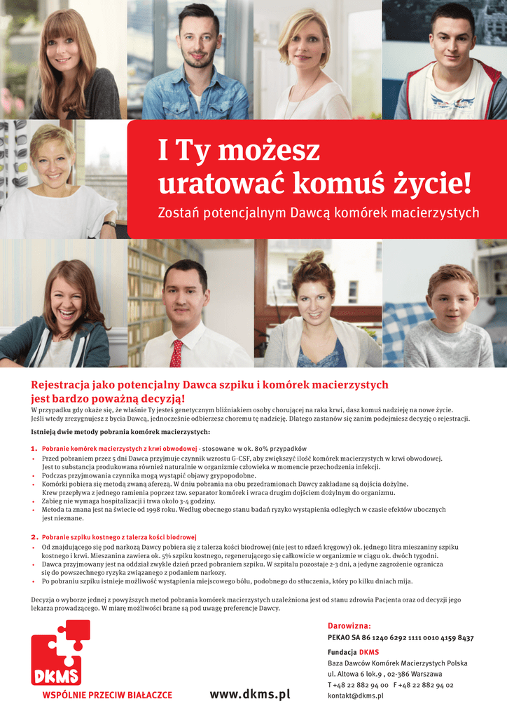 I Ty możesz uratować komuś życie! Zostań potencjalnym Dawcą komórek macierzystych Rejestracja jako potencjalny Dawca szpiku i komórek macierzystych jest bardzo poważną decyzją! W przypadku gdy okaże się, że właśnie Ty jesteś genetycznym bliźniakiem osoby chorującej na raka krwi, dasz komuś nadzieję na nowe życie. Jeśli wtedy zrezygnujesz z bycia Dawcą, jednocześnie odbierzesz choremu tę nadzieję. Dlatego zastanów się zanim podejmiesz decyzję o rejestracji. Istnieją dwie metody pobrania komórek macierzystych: 1. ź ź ź ź ź Pobranie komórek macierzystych z krwi obwodowej - stosowane w ok. 80% przypadków Przed pobraniem przez 5 dni Dawca przyjmuje czynnik wzrostu G-CSF, aby zwiększyć ilość komórek macierzystych w krwi obwodowej. Jest to substancja produkowana również naturalnie w organizmie człowieka w momencie przechodzenia infekcji. Podczas przyjmowania czynnika mogą wystąpić objawy grypopodobne. Komórki pobiera się metodą zwaną aferezą. W dniu pobrania na obu przedramionach Dawcy zakładane są dojścia dożylne. Krew przepływa z jednego ramienia poprzez tzw. separator komórek i wraca drugim dojściem dożylnym do organizmu. Zabieg nie wymaga hospitalizacji i trwa około 3-4 godziny. Metoda ta znana jest na świecie od 1998 roku. Według obecnego stanu badań ryzyko wystąpienia odległych w czasie efektów ubocznych jest nieznane. 2. Pobranie szpiku kostnego z talerza kości biodrowej ź Od znajdującego się pod narkozą Dawcy pobiera się z talerza kości biodrowej (nie jest to rdzeń kręgowy) ok. jednego litra mieszaniny szpiku kostnego i krwi. Mieszanina zawiera ok. 5% szpiku kostnego, regenerującego się całkowicie w organizmie w ciągu ok. dwóch tygodni. ź Dawca przyjmowany jest na oddział zwykle dzień przed pobraniem szpiku. W szpitalu pozostaje 2-3 dni, a jedyne zagrożenie ogranicza się do powszechnego ryzyka związanego z podaniem narkozy. ź Po pobraniu szpiku istnieje możliwość wystąpienia miejscowego bólu, podobnego do stłuczenia, który po kilku dniach mija. Decyzja o wyborze jednej z powyższych metod pobrania komórek macierzystych uzależniona jest od stanu zdrowia Pacjenta oraz od decyzji jego lekarza prowadzącego. W miarę możliwości brane są pod uwagę preferencje Dawcy. Darowizna: PEKAO SA 86 1240 6292 1111 0010 4159 8437 www.dkms.pl Fundacja DKMS Baza Dawców Komórek Macierzystych Polska ul. Altowa 6 lok.9 , 02-386 Warszawa T +48 22 882 94 00 F +48 22 882 94 02 [email protected]