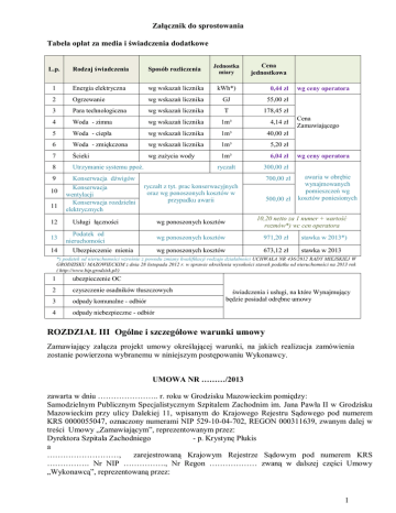 Załącznik do sprostowania Tabela opłat za media i świadczenia dodatkowe Cena jednostkowa L.p. Rodzaj świadczenia Sposób rozliczenia Jednostka miary 1 Energia elektryczna wg wskazań licznika kWh*) 0,44 zł 2 Ogrzewanie wg wskazań licznika GJ 55,00 zł 3 Para technologiczna wg wskazań licznika T 178,45 zł 4 Woda - zimna wg wskazań licznika 1m³ 4,14 zł 5 Woda - ciepła wg wskazań licznika 1m³ 40,00 zł 6 Woda - zmiękczona wg wskazań licznika 1m³ 5,20 zł 7 Ścieki wg zużycia wody 1m³ 6,04 zł 8 Utrzymanie systemu ppoż. 9 10 11 12 13 14 Konserwacja dźwigów Konserwacja wentylacji Konserwacja rozdzielni elektrycznych ryczałt ryczałt z tyt. prac konserwacyjnych oraz wg ponoszonych kosztów w przypadku awarii Ubezpieczenie mienia wg ceny operatora 500,00 zł awaria w obrębie wynajmowanych pomieszczeń wg kosztów poniesionych 10,20 netto za 1 numer + wartość rozmów*) wc cen operatora wg ponoszonych kosztów Podatek od nieruchomości Cena Zamawiającego 300,00 zł 700,00 zł Usługi łączności wg ceny operatora wg ponoszonych kosztów 971,20 zł stawka w 2013*) wg ponoszonych kosztów 673,12 zł stawka w 2013 *) podatek od nieruchomości wzrośnie z powodu zmiany kwalifikacji rodzaju działalności UCHWAŁA NR 436/2012 RADY MIEJSKIEJ W GRODZISKU MAZOWIECKIM z dnia 28 listopada 2012 r. w sprawie określenia wysokości stawek podatku od nieruchomości na 2013 rok ( http://www.bip.grodzisk.pl/) 1 ubezpieczenie OC 2 czyszczenie osadników tłuszczowych 3 odpady komunalne - odbiór 4 odpady niebezpieczne - odbiór świadczenia i usługi, na które Wynajmujący będzie posiadał odrębne umowy ROZDZIAŁ III Ogólne i szczegółowe warunki umowy Zamawiający załącza projekt umowy określającej warunki, na jakich realizacja zamówienia zostanie powierzona wybranemu w niniejszym postępowaniu Wykonawcy. UMOWA NR ………/2013 zawarta w dniu ………………….. r. roku w Grodzisku Mazowieckim pomiędzy: Samodzielnym Publicznym Specjalistycznym Szpitalem Zachodnim im. Jana Pawła II w Grodzisku Mazowieckim przy ulicy Dalekiej 11, wpisanym do Krajowego Rejestru Sądowego pod numerem KRS 0000055047, oznaczony numerami NIP 529-10-04-702, REGON 000311639, zwanym dalej w treści Umowy „Zamawiającym”, reprezentowanym przez: Dyrektora Szpitala Zachodniego - p. Krystynę Płukis a ………………………, zarejestrowaną Krajowym Rejestrze Sądowym pod numerem KRS ……………. Nr NIP ……………., Nr Regon ……………… zwaną w dalszej części Umowy „Wykonawcą”, reprezentowaną przez: 1 Załącznik do sprostowania …………………….. p. …………………………… , Zwanymi łącznie „Stronami”, a oddzielnie „Stroną”. W wyniku przeprowadzonego postępowania o udzielenie zamówienia publicznego w trybie przetargu nieograniczonego, zgodnie ustawą z dnia 29 stycznia 2004 r. Prawo zamówień publicznych (t. j. Dz. U. z 2013 r., poz. 907, z późn. zm.), zwanej w dalszej części Umowy „ustawą”, Strony zawierają Umowę o następującej treści: §1 1. Przedmiotem Umowy jest świadczenie przez Wykonawcę usługi całodziennego wyżywienia pacjentów przebywających na leczeniu w Szpitalu Zachodnim w Grodzisku Mazowieckim w oparciu o istniejącą kuchnię z przejęciem w najem pomieszczeń Zamawiającego wraz z ich wyposażeniem. 2. Wykonawca zobowiązuje się do świadczenia usług, o którym mowa w ust. 1, z należytą starannością, z zastosowaniem nowoczesnych technologii, zgodnie z zasadami określonymi w przepisach dotyczących żywienia zbiorowego, w szczególności żywienia w szpitalach, w przepisach o bezpieczeństwie żywienia i żywności oraz w przepisach sanitarnoepidemiologicznych. 3. Wykonawca oświadcza, iż posiada kwalifikacje, doświadczenie i uprawnienia niezbędne do realizacji przedmiotu Umowy. 4. W celu przygotowywania posiłków dla pacjentów Zamawiającego Wykonawca zobowiązuje się do wynajęcia od Zamawiającego, na podstawie odrębnej Umowy najmu, pomieszczeń, w tym kuchni oraz urządzeń i sprzętu Zamawiającego, szczegółowo określonych w załącznikach do umowy najmu (opisu przedmiotu zamówienia) §2 1. Wykonawca zobowiązany będzie do złożenia dokumentów niezbędnych do uzyskania decyzji PSSE zatwierdzającej obiekt do działalności w zakresie produkcji żywienia w terminie nie dłuższym niż 7 dni po podpisaniu umowy i uzyskania decyzji dopuszczającej w terminie 1-go miesiąca od rozpoczęcia świadczenia usługi żywienia. 2. Wykonawca zobowiązuje się do stosowania systemu HACCP w terminie oraz certyfikowanego przez akredytowany podmiot systemu zarządzania jakością ISO 9001:2009 w terminie 6 miesięcy od dnia zawarcia Umowy, a także do przestrzegania zasad GHP i GMP. 3. Wykonawca zapewni, że urządzenia oraz sprzęt wykorzystywany do wykonania niniejszej Umowy, nie będący własnością Zamawiającego, posiadać będą konieczne certyfikaty i atesty. 4. Wykonawca zapewni dostarczanie posiłków w naczyniach, które zabezpieczą posiłki przed nadmiernym obniżeniem temperatury, przed czynnikami zewnętrznymi. Wszystkie używane przez Wykonawcę naczynia muszą posiadać stosowne atesty i/lub certyfikaty. Jednocześnie Wykonawca zobowiązuje się do przedstawienia, na każde żądanie Zamawiającego atestów i/lub certyfikatów dotyczących naczyń wykorzystywanych do realizacji Umowy. §3 1. Z dniem rozpoczęcia świadczenia usług żywienia pacjentów Wykonawca zobowiązuje się do przejęcia 20 (dwudziestu) pracowników Zamawiającego na podstawie art. 23¹ Kodeksu pracy i zatrudniania ich na podstawie umowy o pracę przez okres nie krótszy niż 12 miesięcy od dnia przejęcia, na warunkach nie gorszych niż określone w umowach o pracę zawartych między nimi a Zamawiającym oraz wynikających z obowiązującego u Zamawiającego Regulaminu Wynagradzania (stanowiącego załącznik nr … do Opisu przedmiotu zamówienia). Wykonawca zobowiązuje się do wypłacenia prz