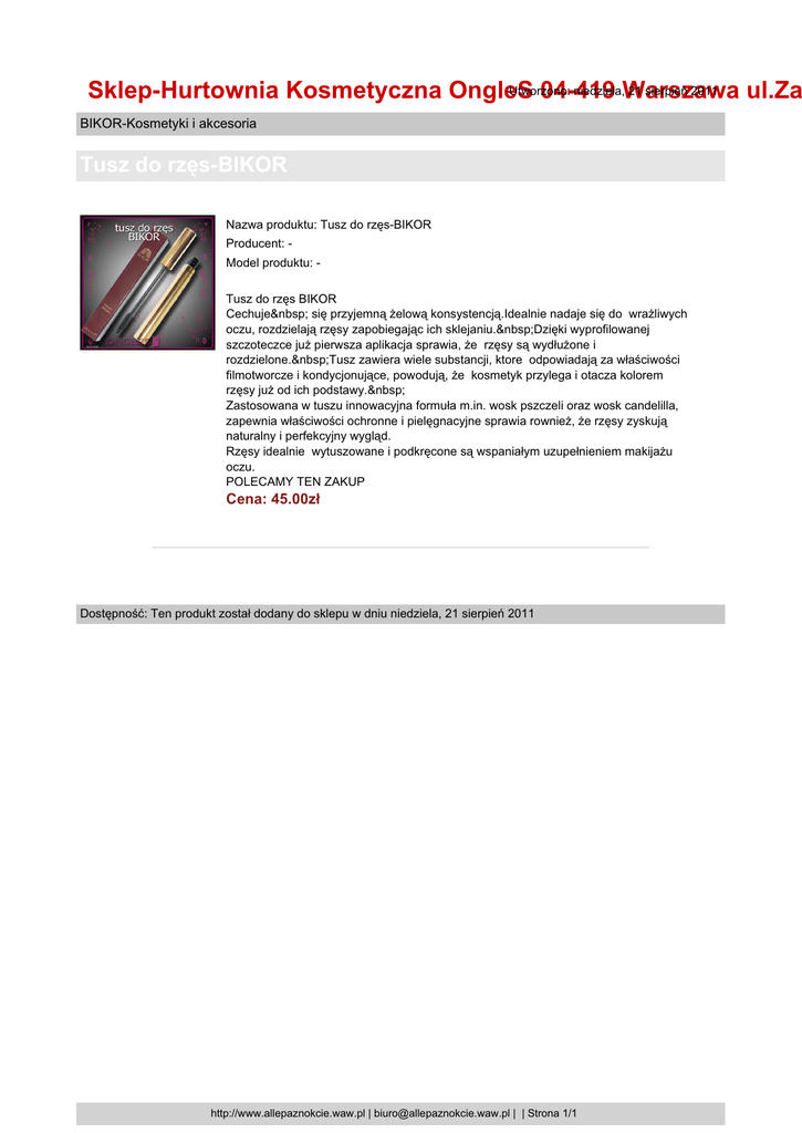 Utworzono: niedziela,Warszawa 21 sierpień 2011 Sklep-Hurtownia Kosmetyczna OngleS 04-419 ul.Za BIKOR-Kosmetyki i akcesoria Tusz do rzęs-BIKOR Nazwa produktu: Tusz do rzęs-BIKOR Producent: Model produktu: Tusz do rzęs BIKOR Cechuje się przyjemną żelową konsystencją.Idealnie nadaje się do wrażliwych oczu, rozdzielają rzęsy zapobiegając ich sklejaniu. Dzięki wyprofilowanej szczoteczce już pierwsza aplikacja sprawia, że rzęsy są wydłużone i rozdzielone. Tusz zawiera wiele substancji, ktore odpowiadają za właściwości filmotworcze i kondycjonujące, powodują, że kosmetyk przylega i otacza kolorem rzęsy już od ich podstawy. Zastosowana w tuszu innowacyjna formuła m.in. wosk pszczeli oraz wosk candelilla, zapewnia właściwości ochronne i pielęgnacyjne sprawia rownież, że rzęsy zyskują naturalny i perfekcyjny wygląd. Rzęsy idealnie wytuszowane i podkręcone są wspaniałym uzupełnieniem makijażu oczu. POLECAMY TEN ZAKUP Cena: 45.00zł Dostępność: Ten produkt został dodany do sklepu w dniu niedziela, 21 sierpień 2011 http://www.allepaznokcie.waw.pl | [email protected] | | Strona 1/1