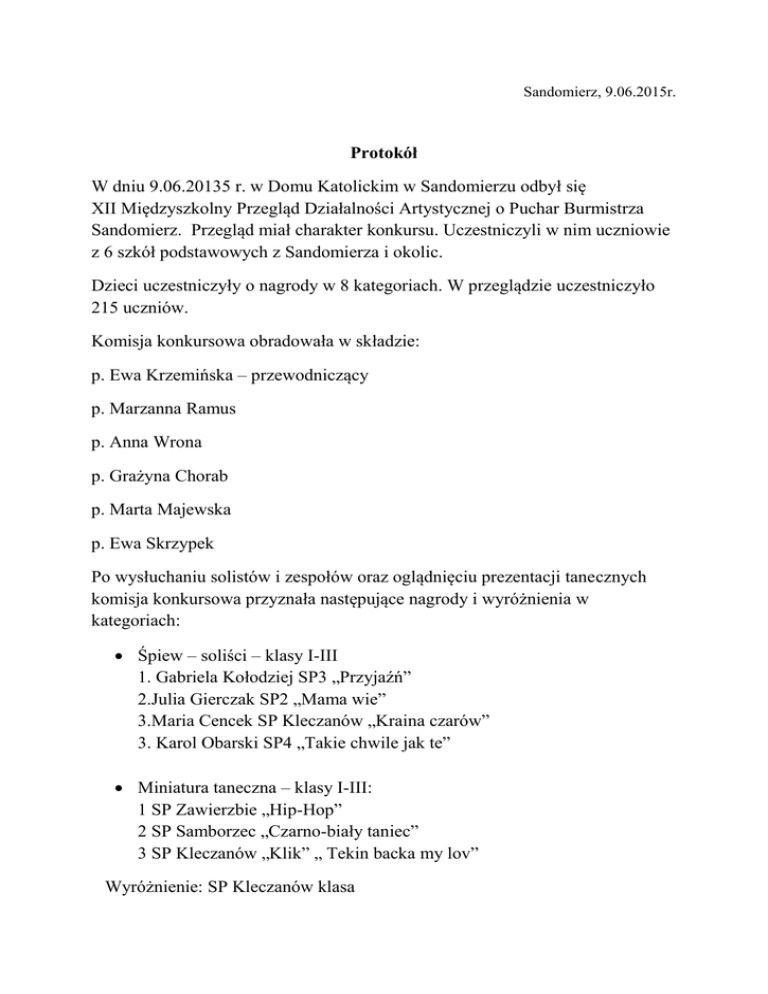 Sandomierz, 9.06.2015r. Protokół W dniu 9.06.20135 r. w Domu Katolickim w Sandomierzu odbył się XII Międzyszkolny Przegląd Działalności Artystycznej o Puchar Burmistrza Sandomierz. Przegląd miał charakter konkursu. Uczestniczyli w nim uczniowie z 6 szkół podstawowych z Sandomierza i okolic. Dzieci uczestniczyły o nagrody w 8 kategoriach. W przeglądzie uczestniczyło 215 uczniów. Komisja konkursowa obradowała w składzie: p. Ewa Krzemińska – przewodniczący p. Marzanna Ramus p. Anna Wrona p. Grażyna Chorab p. Marta Majewska p. Ewa Skrzypek Po wysłuchaniu solistów i zespołów oraz oglądnięciu prezentacji tanecznych komisja konkursowa przyznała następujące nagrody i wyróżnienia w kategoriach: Śpiew – soliści – klasy I-III 1. Gabriela Kołodziej SP3 „Przyjaźń” 2.Julia Gierczak SP2 „Mama wie” 3.Maria Cencek SP Kleczanów „Kraina czarów” 3. Karol Obarski SP4 „Takie chwile jak te” Miniatura taneczna – klasy I-III: 1 SP Zawierzbie „Hip-Hop” 2 SP Samborzec „Czarno-biały taniec” 3 SP Kleczanów „Klik” „ Tekin backa my lov” Wyróżnienie: SP Kleczanów klasa Śpiew – zespoły – klasy I-III: 1. SP Samborzec „ Przed siebie w dal” 2 SP nr 3 „Lekcja śpiewu” 2.SP nr 2 „Lato, lato” 3.SP Kleczanów „Córka Gburka” Śpiew – zespoły – klasy IV-VI: 1. SP nr 3 „Twist again” 2. SP Kleczanów „Lipka zielona” 3. SP nr 4 „Autostop” Śpiew – soliści – klasy IV-VI 1. Oskar Juryś SP 4 „Nie chcę więcej” 2. Wiktoria Krakowiak SP Samborzec „Miłość Ci wszystko wybaczy” 2 Gabriela Jackowska SP4 „Laleczka z saskiej porcelany” 3. Amelia Korona SP Zawierzbie „List do Mamy” Wyróżnienia: Milena Mazur SP Kleczanów, Patrycja Chuchmała SP Kleczanów, Katarzyna Duda SP Kleczanów, Wiktoria Szal SP Samborzec, Gabriela Bednarczyk SP nr 4, Emilia Mokrzycka SP nr 2, Katarzyna Trelska SP nr 2, Urszula Biernicka SP nr 2, Julia Sołtyk SP Zawierzbie, Emilia Biało SP Zawierzbie Tańce ludowe: 1. „Sędomir” SP nr 3 „ Suita tańców śląskich” 2 Klasa VI SP nr 3 „ Polonez” 3. Klasa I B SP Kleczanów „Krakowiaczek” Organizatorzy konkursu serdecznie dziękują wszystkim, którzy pomogli w jego zrealizowaniu: Panu Burmistrzowi Markowi Bronkowskiemu Dyrektorom szkół: SP nr 2 i SP nr 3 p. Elżbiecie Sobolewskiej i p. Grzegorzowi Socha Fundacja Kultury Ziemi Sandomierskiej Przedsiębiorstwu „Roma” Dyrektorowi Domu Katolickiego ks. dr Tomaszowi Lisowi Nauczycielom przygotowującym dzieci Rodzicom DZIĘKUJEMY Sprawozdanie przygotowała: p. Maria Bernaś SP nr 2,