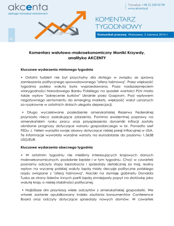 Komunikat prasowy Warszawa, 2 czerwca 2014 r. Komentarz walutowo-makroekonomiczny Moniki Krzywdy, analityka AKCENTY Kluczowe wydarzenia minionego tygodnia • Ostatni tydzień nie był przychylny dla złotego w związku ze sprawą zamieszania politycznego spowodowanego "aferą taśmową". Przez większość tygodnia polska waluta była wyprzedawana. Poza nadszarpnięciem wiarygodności Narodowego Banku Polskiego na spadek wartości PLN miało także wpływ "zakręcenie kurków" Ukrainie przez Gazprom. Pod wpływem negatywnego sentymentu do emerging markets, większość walut uznanych za ryzykowne w ostatnich dniach ulegała deprecjacji. • Długo wyczekiwane posiedzenie amerykańskiej Rezerwy Federalnej przyniosło nieco zaskakujące zdarzenia. Pomimo ewidentnej poprawy na amerykańskim rynku pracy oraz przyspieszenia dynamiki inflacji zostały obniżone prognozy dotyczące wzrostu gospodarczego w br. Ponadto szef FEDu J. Yellen wyraziła swoje obawy dotyczące niskiej presji inflacyjnej w USA. Te informacje wywołały wyraźne wzrosty na eurodolarze do poziomu 1,3638 USD/EUR. Kluczowe wydarzenia obecnego tygodnia • W ostatnim tygodniu nie mieliśmy interesujących krajowych danych makroekonomicznych, podobnie będzie i w tym tygodniu. Choć w czwartek poznamy odczyty stopy bezrobocia i sprzedaży detalicznej za maj, realny wpływ na wycenę polskiej waluty będą miały decyzje polityczne polskiego rządu związane z "aferą taśmową". Naciski na dymisję gabinetu Donalda Tuska ze strony liderów innych partii będą zmniejszały popyt na złotówkę jako walutę kraju o niskiej stabilności politycznej. • Najbliższe dni przyniosą wiele odczytów z amerykańskiej gospodarki. We wtorek zostanie opublikowany indeks zaufania konsumentów Conference Board oraz odczyty dotyczące sprzedaży nowych domów. W czwartek poznamy liczbę tygodniowych zasiłków dla bezrobotnych, która wg rynkowej mediany ma nieznacznie wzrosnąć w stosunku do ostatniego tygodnia. EURUSD • Zgodnie z oczekiwaniami podczas czwartkowego posiedzenia Rezerwy Federalnej doszło do ograniczenia QE3 o kolejne 10 mld USD. Wg dort-chartu w 2015 r. czekają nas najprawdopodobniej cztery podwyżki stóp procentowych Szefowa amerykańskiego banku centralnego Janet Yellen zaskoczyła jednak rynek swoją ostrożnością co do dalszego wzrostu inflacji. Informacją zniechęcającą inwestorów była także projekcja dynamiki HDP w 2014 r., która została wyraźnie zaniżona pod wpływem słabych wyników w I kwartale. Automatyczną reakcją na informacje po posiedzeniu były wzrosty na eurodolarze, który wszedł na tygodniowe maksima 1,363 USD/ EUR. EURPLN i USDPLN • Przez ostatnie dni wartość EURPLN oraz USDPLN okazała się silnie skorelowana z zawirowaniami wewnętrznymi. Za sprawą "afery taśmowej" i jej konotacji takich jak możliwość przyspieszonych wyborów (o których wypowiadał się sam prezydent RP) doszło do wyprzedaży polskiej waluty. Od czwartku mieliśmy do czynienia z silnym kanałem wzrostowym na EURPLN i USDPLN. W piątek eurozłoty był kwotowany powyżej 4,1681 PLN/EUR, a USDPLN w okolicach 3,07 PLN/USD. Stabilność polityczna jest jednym z czynników wspierających walutę krajową. Warto zaznaczyć, że wcześniejsze wybory będą oznaczać dalszą presję na osłabienie polskiego złotego. Zapowiadana przez Wprost publikacja kolejnych materiałów kompromitujących polski rząd zwiększa obawy co do dymisji gabinetu Donalda Tuska. CEE • Ostatni tydzień na parze CZKPLN zdecydowanie należał do korony. Problemy wewnętrzne w Polsce wywindowały dotąd osłabiającą się parę ponad poziom 0,1521 PLN/CZK. • Z powodu wzrostów na eurodolarze podczas środowej sesji euro umocnił się na crossie EURCZK powyżej granicy 27,45 CZK/EUR.