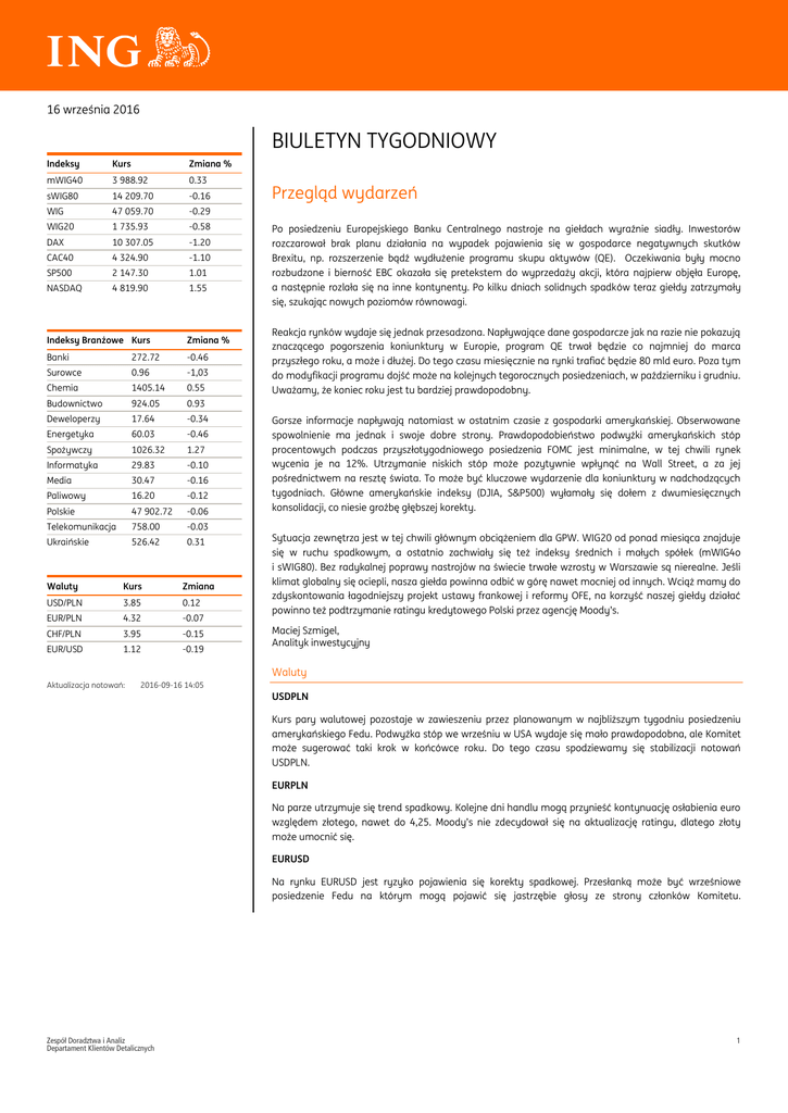 16 września 2016 BIULETYN TYGODNIOWY Indeksy Kurs Zmiana % mWIG40 3 988.92 0.33 sWIG80 14 209.70 -0.16 WIG 47 059.70 -0.29 WIG20 1 735.93 -0.58 DAX 10 307.05 -1.20 CAC40 4 324.90 -1.10 SP500 2 147.30 1.01 NASDAQ 4 819.90 1.55 Indeksy Branżowe Kurs Zmiana % Banki 272.72 -0.46 Surowce 0.96 -1,03 Chemia 1405.14 0.55 Budownictwo 924.05 0.93 Deweloperzy 17.64 -0.34 Energetyka 60.03 -0.46 Spożywczy 1026.32 1.27 Informatyka 29.83 -0.10 Media 30.47 -0.16 Paliwowy 16.20 -0.12 Polskie 47 902.72 -0.06 Telekomunikacja 758.00 -0.03 Ukraińskie 526.42 0.31 Waluty Kurs Zmiana USD/PLN 3.85 0.12 EUR/PLN 4.32 -0.07 CHF/PLN 3.95 -0.15 EUR/USD 1.12 -0.19 Przegląd wydarzeń Po posiedzeniu Europejskiego Banku Centralnego nastroje na giełdach wyraźnie siadły. Inwestorów rozczarował brak planu działania na wypadek pojawienia się w gospodarce negatywnych skutków Brexitu, np. rozszerzenie bądź wydłużenie programu skupu aktywów (QE). Oczekiwania były mocno rozbudzone i bierność EBC okazała się pretekstem do wyprzedaży akcji, która najpierw objęła Europę, a następnie rozlała się na inne kontynenty. Po kilku dniach solidnych spadków teraz giełdy zatrzymały się, szukając nowych poziomów równowagi. Reakcja rynków wydaje się jednak przesadzona. Napływające dane gospodarcze jak na razie nie pokazują znaczącego pogorszenia koniunktury w Europie, program QE trwał będzie co najmniej do marca przyszłego roku, a może i dłużej. Do tego czasu miesięcznie na rynki trafiać będzie 80 mld euro. Poza tym do modyfikacji programu dojść może na kolejnych tegorocznych posiedzeniach, w październiku i grudniu. Uważamy, że koniec roku jest tu bardziej prawdopodobny. Gorsze informacje napływają natomiast w ostatnim czasie z gospodarki amerykańskiej. Obserwowane spowolnienie ma jednak i swoje dobre strony. Prawdopodobieństwo podwyżki amerykańskich stóp procentowych podczas przyszłotygodniowego posiedzenia FOMC jest minimalne, w tej chwili rynek wycenia je na 12%. Utrzymanie niskich stóp może pozytywnie wpłynąć na Wall Street, a za jej pośrednictwem na resztę świata. To może być kluczowe wydarzenie dla koniunktury w nadchodzących tygodniach. Główne amerykańskie indeksy (DJIA, S&P500) wyłamały się dołem z dwumiesięcznych konsolidacji, co niesie groźbę głębszej korekty. Sytuacja zewnętrza jest w tej chwili głównym obciążeniem dla GPW. WIG20 od ponad miesiąca znajduje się w ruchu spadkowym, a ostatnio zachwiały się też indeksy średnich i małych spółek (mWIG4o i sWIG80). Bez radykalnej poprawy nastrojów na świecie trwałe wzrosty w Warszawie są nierealne. Jeśli klimat globalny się ociepli, nasza giełda powinna odbić w górę nawet mocniej od innych. Wciąż mamy do zdyskontowania łagodniejszy projekt ustawy frankowej i reformy OFE, na korzyść naszej giełdy działać powinno też podtrzymanie ratingu kredytowego Polski przez agencję Moody’s. Maciej Szmigel, Analityk inwestycyjny Waluty Aktualizacja notowań: 2016-09-16 14:05 USDPLN Kurs pary walutowej pozostaje w zawieszeniu przez planowanym w najbliższym tygodniu posiedzeniu amerykańskiego Fedu. Podwyżka stóp we wrześniu w USA wydaje się mało prawdopodobna, ale Komitet może sugerować taki krok w końcówce roku. Do tego czasu spodziewamy się stabilizacji notowań USDPLN. EURPLN Na parze utrzymuje się trend spadkowy. Kolejne dni handlu mogą przynieść kontynuację osłabienia euro względem złotego, nawet do 4,25. Moody’s nie zdecydował się na aktualizację ratingu, dlatego złoty może umocnić się. EURUSD Na rynku EURUSD jest ryzyko pojawienia się korekty spadkowej. Przesłanką może być wrześniowe posiedzenie Fedu na którym mogą pojawić się jastrzębie głosy ze strony członków Komitetu. Zespół Doradztwa i Analiz Departament Klientów Detalicznych 1 15 października 2014 Towary Ropa naftowa Rynek ropy naftowej ma za sobą spadkowy tydzień. Kurs Brent obniżył się z poziomu 48,0 USD za baryłkę do 46,0 USD za baryłkę. Jako powód niższych notowań tego surowca podaje się nadpodaż na rynku ropy oraz informacje, iż Libia i Nigeria zamierzają w najbliższym czasie zwiększyć eksport swojej ropy. Wśród uczestników rynku panuje przekonanie, co do dalszego spadku notowań ropy. Obecnie jednak kurs Brent znajduje się powyżej ważnej strefy wsparcia 45,0-46,0 USD za tonę i dopiero jej przełamanie otworzy drogę do większej przeceny. Miedź Poprawia się sytuacja na rynku miedzi. Kurs tego metalu wzrósł w tym tygodniu ponad poziom 4.700 USD za tonę i dotarł do ważnej strefy technicznego oporu w rejonie 4.800 USD za tonę. Większy optymizm na rynku to efekt korzystniejszych danych makro, które napłynęły z Chin (produkcja przemysłowa, sprzedaż detaliczna). Państwo Środka odpowiada za ponad połowę globalnego popytu na ten surowiec. Metale szlachetne Pogorszył się natomiast sentyment rynkowy wobec metali szlachetnych. W tym tygodniu notowania złota konsekwentnie traciły na wartości obniżając się z poziomu 1.350 USD za uncję do 1.320 USD za uncję. Od czerwca kurs złota znajduje się w tendencji bocznej (1.300-1.370 USD za uncję), po wcześniejszej dynamicznej aprecjacji. Podobne tendencje zachodzą na notowaniach srebra. W krótkim terminie obserwujemy osłabienie notowań do poziomu 19,0 USD za uncję, W szerszej perspektywie kurs srebra konsoliduje w przedziale 18,5-21,0 USD za uncję. Analiza głównych wykresów GPW WIG20 Pogorszenie światowej koniunktury odcisnęło wyraźne piętno na notowaniach flagowego indeksu naszej giełdy. Kilkudniowe wzrostowe odreagowanie załamało się i WIG20 opadł na minima liczącego sobie już ponad miesiąc ruchu spadkowego. Przecenę zatrzymały wsparcia w okolicy 1725-1730pkt. (m.in. 61,8% zniesienia całości wakacyjnych wzrostów.) i z tego miejsca kurs odbił w górę. Sytuacja techniczna wygląda w tej chwili negatywnie. Na wykresie widać rozległa formację RGR (zazna