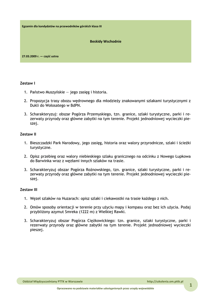 Egzamin dla kandydatów na przewodników górskich klasa III Beskidy Wschodnie 27.03.2009 r. — część ustna Zestaw I 1. Państwo Muszyńskie — jego zasięg i historia. 2. Propozycja trasy obozu wędrownego dla młodzieży znakowanymi szlakami turystycznymi z Dukli do Wołosatego w BdPN. 3. Scharakteryzuj: obszar Pogórza Przemyskiego, tzn. granice, szlaki turystyczne, parki i rezerwaty przyrody oraz główne zabytki na tym terenie. Projekt jednodniowej wycieczki pieszej. Zestaw II 1. Bieszczadzki Park Narodowy, jego zasięg, historia oraz walory przyrodnicze, szlaki i ścieżki turystyczne. 2. Opisz przebieg oraz walory niebieskiego szlaku granicznego na odcinku z Nowego Łupkowa do Barwinka wraz z węzłami innych szlaków na trasie. 3. Scharakteryzuj obszar Pogórza Rożnowskiego, tzn. granice, szlaki turystyczne, parki i rezerwaty przyrody oraz główne zabytki na tym terenie. Projekt jednodniowej wycieczki pieszej. Zestaw III 1. Węzeł szlaków na Huzarach: opisz szlaki i ciekawostki na trasie każdego z nich. 2. Omów sposoby orientacji w terenie przy użyciu mapy i kompasu oraz bez ich użycia. Podaj przybliżony azymut Smreka (1222 m) z Wielkiej Rawki. 3. Scharakteryzuj obszar Pogórza Ciężkowickiego: tzn. granice, szlaki turystyczne, parki i rezerwaty przyrody oraz główne zabytki na tym terenie. Projekt jednodniowej wycieczki pieszej. Oddział Międzyuczelniany PTTK w Warszawie http://szkolenia.om.pttk.pl Opracowano na podstawie materiałów udostępnionych przez urzędy wojewódzkie 1 27.03.2009 Egzamin dla kandydatów na przewodników górskich klasa III — Beskidy Wschodnie Zestaw IV 1. Scharakteryzuj pojęcia architektoniczne: soboty, izbica, zaskrzynienia, kryłosy, transept, mur pruski, konstrukcja zrębowa, konstrukcja słupowo-jętkowa, konstrukcja przysłupowa oraz podaj przykłady na terenie uprawnień. 2. Magurski Park Narodowy, jego zasięg, historia oraz walory krajoznawcze i przyrodnicze, szlaki i ścieżki turystyczne. 3. Scharakteryzuj obszar Gór Cergowskich znajdujących się w obszarze Polski: topografia, hydrografia, szlaki turystyczne, główne zabytki na tym terenie. Projekt jednodniowej wycieczki pieszej. Zestaw V 1. Opisz położenie miejscowości (wraz z otoczeniem górskim): Komańcza, Krempna, Bielanka, Berest, oraz wymień i opisz przebieg szlaków turystycznych w okolicach tych miejscowości. 2. Opisz zachowanie przewodnika w przypadku nagłej niedyspozycji jednego z uczestników oraz w przypadku urazu doznanego w trakcie trwania wycieczki. 3. Scharakteryzuj obszar Pasma Jaworzyny Krynickiej: topografia, hydrografia, parki i rezerwaty przyrody, szlaki turystyczne, główne zabytki na tym terenie. Zestaw VI 1. Wymień i scharakteryzuj zabytki Biecza, Starego Sącza i Przemyśla. 2. Omów zmiany granic państwowych Polski z państwami sąsiednimi na terenie uprawnień począwszy od czasów Średniowiecza do czasów współczesnych. 3. Opisz położenie miejscowości (wraz z otoczeniem górskim): Komańcza, Baligród, Polana: topografia, hydrografia, zabytki na tym terenie. Projekt jednodniowej wycieczki pieszej z jednej z tych miejscowości. Zestaw VII 1. Wskaż 15 miejscowości na terenie uprawnień, w których znajdują się kirkuty. Omów najciekawsze z cmentarzy żydowskich. 2. Podstawowe wyposażenie apteczki przewodnika. 3. Scharakteryzuj obszar Beskidu Niskiego w rejonie Uścia Gorlickiego: topografia, hydrografia, szlaki turystyczne, główne zabytki i inne ciekawostki na tym terenie. Projekt jednodniowej wycieczki pieszej w tym terenie. 2 http://szkolenia.om.pttk.pl Oddział Międzyuczelniany PTTK w Warszawie Opracowano na podstawie materiałów udostępnionych przez urzędy wojewódzkie Egzamin dla kandydatów na przewodników górskich klasa III — Beskidy Wschodnie 27.03.2009 Zestaw VIII 1. Cerkwie Beskidu Niskiego — okres ich powstania, zróżnicowanie architektoniczne. 2. Propozycja trasy obozu wędrownego dla młodzieży międzynarodowym szlakiem dobrego wojaka Szwejka w Bieszczadach i w Górach Słonnych. 3. Scharakteryzuj obszar Beskidu Niskiego w rejonie Wisłoka Wielkiego: topografia, hydrografia, szlaki turystyczne, zabytki i inne ciekawostki na tym terenie. Projekt jednodniowej wycieczki pieszej w tym terenie. Zestaw IX 1. Wskaż 5 miejscowości na terenie uprawnień, w których znajdują się murowane kościoły w stylu neogotyckim projektu Jana Sas Zubrzyckiego. 2. Opisz zasięg i historię osadnictwa wołoskiego oraz grupy etnograficzne na terenie uprawnień. 3. Scharakteryzuj obszar Gór Sanocko–Turczańskich w rejonie Uherzec Mineralnych: topografia, hydrografia, szlaki turystyczne i zabytki w tym rejonie. Zestaw X 1. Kim był i skąd pochodził Epifan Drowniak. 2. Rezerwaty przyrody na terenie Bieszczadów oraz Gór Sanocko-Turczańskich. 3. Scharakteryzuj obszar Pogórza Dynowskiego: topografia, hydrografia, szlaki turystyczne, główne zabytki na tym terenie. Projekt jednodniowej wycieczki autokarowej po tym terenie. Zestaw XI 1. Republika Iwonicka: geneza i przebieg powstania republiki, przywódcy, zakończenie istnienia. 2. Rezerwaty cisowe na terenie uprawnień. 3. Węzeł szlaków na Chryszczatej: opisz przebieg szlaków i ciekawe miejsca na trasie. Zestaw XII 1. Podaj nazwy miejscowości założonych podczas tzw. kolonizacji józefińskiej na terenie uprawnień. Wymień znane Ci pozostałości po kolonistach. 2. Podaj przebieg szlaków turystycznych zaczynających się w Grybowie. 3. Scharakteryzuj obszar słowackich Beskidów od Krzemieńca do przełomu Popradu w Leluchowie: topografia i hydrografia (ogólnie), główne zabytki na tym terenie. Oddział Międzyuczelniany PTTK w Warszawie http://szkolenia.om.pttk.pl.pl Opracowano na podstawie materiałów udostępnionych przez urzędy wojewódzkie 3 27.03.2009 Egzamin dla kandydatów na przewodników górskich klasa III — Beskidy Wschodnie Zestaw XIII 1. Zielonoświątkowcy w Beskidzie Niskim. 2. Podaj przebieg szlaków turystycznych wychodzących z Go