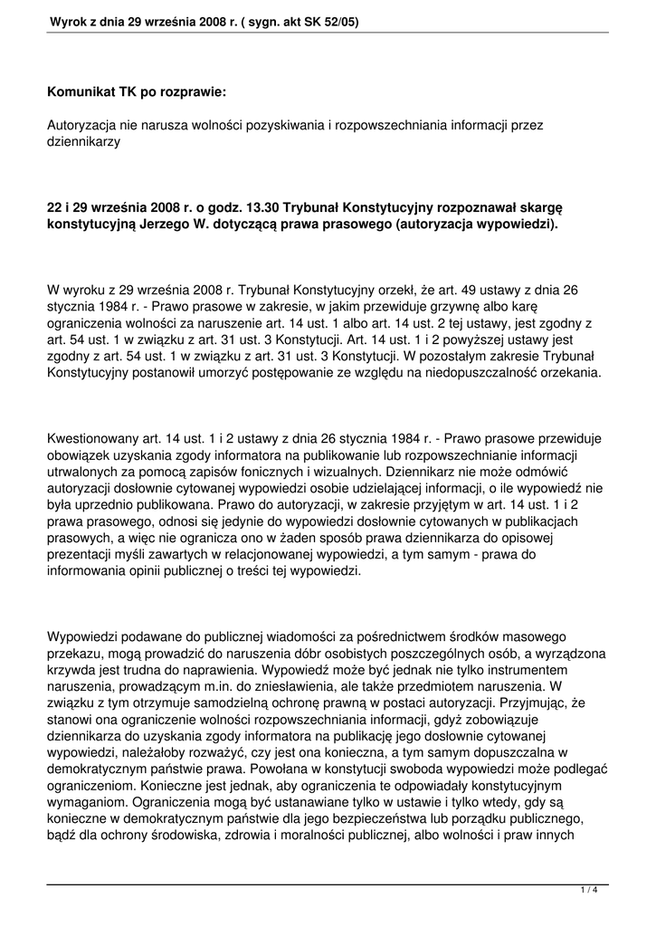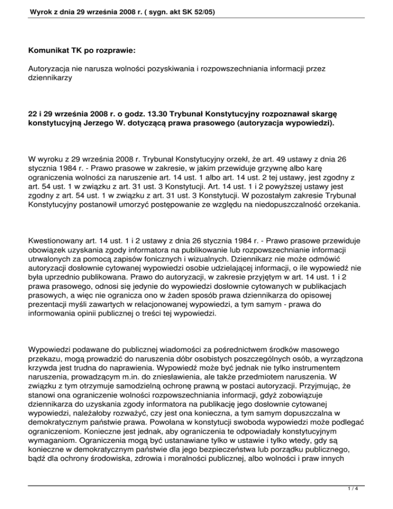 Wyrok z dnia 29 września 2008 r. ( sygn. akt SK 52/05) Komunikat TK po rozprawie: Autoryzacja nie narusza wolności pozyskiwania i rozpowszechniania informacji przez dziennikarzy 22 i 29 września 2008 r. o godz. 13.30 Trybunał Konstytucyjny rozpoznawał skargę konstytucyjną Jerzego W. dotyczącą prawa prasowego (autoryzacja wypowiedzi). W wyroku z 29 września 2008 r. Trybunał Konstytucyjny orzekł, że art. 49 ustawy z dnia 26 stycznia 1984 r. - Prawo prasowe w zakresie, w jakim przewiduje grzywnę albo karę ograniczenia wolności za naruszenie art. 14 ust. 1 albo art. 14 ust. 2 tej ustawy, jest zgodny z art. 54 ust. 1 w związku z art. 31 ust. 3 Konstytucji. Art. 14 ust. 1 i 2 powyższej ustawy jest zgodny z art. 54 ust. 1 w związku z art. 31 ust. 3 Konstytucji. W pozostałym zakresie Trybunał Konstytucyjny postanowił umorzyć postępowanie ze względu na niedopuszczalność orzekania. Kwestionowany art. 14 ust. 1 i 2 ustawy z dnia 26 stycznia 1984 r. - Prawo prasowe przewiduje obowiązek uzyskania zgody informatora na publikowanie lub rozpowszechnianie informacji utrwalonych za pomocą zapisów fonicznych i wizualnych. Dziennikarz nie może odmówić autoryzacji dosłownie cytowanej wypowiedzi osobie udzielającej informacji, o ile wypowiedź nie była uprzednio publikowana. Prawo do autoryzacji, w zakresie przyjętym w art. 14 ust. 1 i 2 prawa prasowego, odnosi się jedynie do wypowiedzi dosłownie cytowanych w publikacjach prasowych, a więc nie ogranicza ono w żaden sposób prawa dziennikarza do opisowej prezentacji myśli zawartych w relacjonowanej wypowiedzi, a tym samym - prawa do informowania opinii publicznej o treści tej wypowiedzi. Wypowiedzi podawane do publicznej wiadomości za pośrednictwem środków masowego przekazu, mogą prowadzić do naruszenia dóbr osobistych poszczególnych osób, a wyrządzona krzywda jest trudna do naprawienia. Wypowiedź może być jednak nie tylko instrumentem naruszenia, prowadzącym m.in. do zniesławienia, ale także przedmiotem naruszenia. W związku z tym otrzymuje samodzielną ochronę prawną w postaci autoryzacji. Przyjmując, że stanowi ona ograniczenie wolności rozpowszechniania informacji, gdyż zobowiązuje dziennikarza do uzyskania zgody informatora na publikację jego dosłownie cytowanej wypowiedzi, należałoby rozważyć, czy jest ona konieczna, a tym samym dopuszczalna w demokratycznym państwie prawa. Powołana w konstytucji swoboda wypowiedzi może podlegać ograniczeniom. Konieczne jest jednak, aby ograniczenia te odpowiadały konstytucyjnym wymaganiom. Ograniczenia mogą być ustanawiane tylko w ustawie i tylko wtedy, gdy są konieczne w demokratycznym państwie dla jego bezpieczeństwa lub porządku publicznego, bądź dla ochrony środowiska, zdrowia i moralności publicznej, albo wolności i praw innych 1/4 Wyrok z dnia 29 września 2008 r. ( sygn. akt SK 52/05) osób. Ograniczenia te nie mogą naruszać istoty wolności i praw. Muszą też czynić zadość zasadzie proporcjonalności. W tej sprawie wolność wypowiedzi została ograniczona, jeśli chodzi o publikację wypowiedzi dosłownie cytowanych, co do których odmówiono dokonania autoryzacji. Nie prowadzi to jednak do naruszenia istoty tej wolności, gdyż dopuszczalne jest przedstawianie poglądów rozmówcy w sposób opisowy. Jednocześnie wprowadzenie autoryzacji należy uznać za konieczne w demokratycznym państwie, ze względu na potrzebę ochrony wolności i praw informatorów, w tym przede wszystkich ich dóbr osobistych. W związku z tym Trybunał Konstytucyjny uznał, że tak ukształtowana autoryzacja nie narusza wolności pozyskiwania i rozpowszechniania informacji przez dziennikarzy w sposób określony w art. 31 ust. 3 Konstytucji. Autoryzacja umożliwia realizację wolności wyrażania poglądów przez informatorów, zapewniając ochronę prawną ich czci oraz dobrego imienia, a tym samym nie tylko jest niesprzeczna z normami konstytucyjnymi, ale stanowi raczej ich gwarancję. Trybunał Konstytucyjny zwrócił jednocześnie uwagę na to, że instytucja autoryzacji wypowiedzi jest uzasadniona nie tylko koniecznością ochrony praw i wolności informatora (a zatem mających wymiar indywidualny), lecz także znajduje oparcie w innych wartościach, mieszczących się w pojęciu interesu publicznego. Skoro bowiem istotę autoryzacji stanowi przypisanie autorstwa wypowiedzi konkretnej osobie, to instytucja ta gwarantuje precyzję i pewność debaty publicznej oraz służy podnoszeniu wiarygodności tej debaty. W interesie odbiorcy jest niewątpliwie publikowanie prawdziwych wypowiedzi, a zatem takich, których dosłowność jest autentyczna. Uwolnienie dziennikarza od obowiązku uzyskania autoryzacji nie gwarantowałoby odbiorcom, że publikowane przez nich wypowiedzi będą stanowiły dosłowne przytoczenie wypowiedzianych słów z zachowaniem ich sensu i kontekstu. W tym świetle Trybunał Konstytucyjny wyraził pogląd, według którego instytucja autoryzacji jest również przejawem realizacji prawa obywateli do rzetelnej, czyli wiarygodnej, prawdziwej, uczciwej, jasnej, niewprowadzającej w błąd, odpowiedzialnej informacji. Badając zgodność skarżonych przepisów z Konstytucją, należy również rozstrzygnąć, czy dopuszczalna jest penalizacja naruszenia obowiązku sformułowanego w art. 14 ust. 1 i 2 prawa prasowego, a więc czy jej wprowadzenie nie wykracza poza swobodę ustawodawcy, ograniczoną normami i zasadami konstytucyjnymi. Wypowiedź informatora jako przedmiot naruszenia otrzymuje bowiem na mocy art. 49 prawa prasowego samodzielną ochronę prawną. Osoba, która nie dopełnia obowiązku autoryzacji, podlega grzywnie albo karze ograniczenia wolności. Przy czym prawo prasowe penalizuje wyłącznie takie zachowanie, które polega na odmowie przedłożenia do autoryzacji wypowiedzi, która ma zostać opublikowana w dosłownym brzmieniu. 2/4 Wyrok z dnia 29 września 2008 r. ( sygn. akt SK 52/05) W wyroku z 30 paźdz