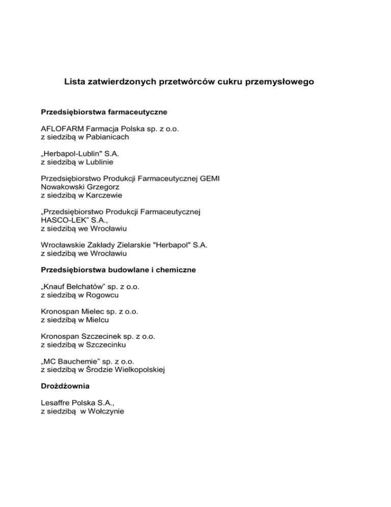 Lista zatwierdzonych przetwórców cukru przemysłowego Przedsiębiorstwa farmaceutyczne AFLOFARM Farmacja Polska sp. z o.o. z siedzibą w Pabianicach „Herbapol-Lublin" S.A. z siedzibą w Lublinie Przedsiębiorstwo Produkcji Farmaceutycznej GEMI Nowakowski Grzegorz z siedzibą w Karczewie „Przedsiębiorstwo Produkcji Farmaceutycznej HASCO-LEK” S.A., z siedzibą we Wrocławiu Wrocławskie Zakłady Zielarskie "Herbapol" S.A. z siedzibą we Wrocławiu Przedsiębiorstwa budowlane i chemiczne „Knauf Bełchatów” sp. z o.o. z siedzibą w Rogowcu Kronospan Mielec sp. z o.o. z siedzibą w Mielcu Kronospan Szczecinek sp. z o.o. z siedzibą w Szczecinku „MC Bauchemie” sp. z o.o. z siedzibą w Środzie Wielkopolskiej Drożdżownia Lesaffre Polska S.A., z siedzibą w Wołczynie Przedsiębiorstwa gorzelnicze „Alprocom" sp. z o.o. z siedzibą w Poznaniu Andrzej Basiński Gorzelnia Rolnicza Iłowo z siedzibą w Iłowie BGW - Wielobranżowe Przedsiębiorstwo Handlowe sp. z o.o. z siedzibą w Poznaniu Emilia Mierzwa Przedsiębiorstwo Wielobranżowe z siedzibą w Białobokach Gorzelnia Lewków sp. z o.o. z siedzibą w Ostrowie Wlkp. Gorzelnia Rolnicza Rostkowski Zbigniew, Rostkowska Alina z siedzibą w Zybułtowie Gorzelnia Rolnicza w Drahimku Grochowski Marcin z siedzibą w Drahimku „Gorzelnia" sp. z o.o., z siedzibą w Leopoldowie Gospodarstwo Rolne „Komorowo" sp. z o.o. z siedzibą w Komorowie Gospodarstwo Rolne RADZICZ Jacek Karmowski z siedzibą w Sadkach Gospodarstwo Rolne Wabcz sp. z o.o. z siedzibą w Wabczu GPO-EKO Piotr Owczarek, Cezary Piechota z siedzibą w Byszewicach Janina Gutowska – Zakład Rolny z siedzibą w Turzy Małej Jarosław Jankowski Wytwórnia Spirytusu Gorzelnia Lubiatów, z siedzibą w Lubiatowie „KK” Przedsiębiorstwo Usługowe GORZELNIA KRĘPA Katarzyna Kowalska z siedzibą w Krępie 2/4 Podlaskie Gorzelnie „Surwin" sp. z o.o. z siedzibą w Międzyrzecu Podlaskim PPHU Grażyna Wiecka z siedzibą w Lipce Produkcja i Sprzedaż Surówki Spirytusowej Produkcja Lastriko Łyszczarz Wacław z siedzibą w Wysokiej Strzyżowskiej Przedsiębiorstwo Handlowo-Produkcyjne Wiesław Wawrzyniak z siedzibą w Niedźwiadach Przedsiębiorstwo Obrotu Paliwami ORTUS, Jan Ostrowski i wspólnicy sp. j. z siedzibą w Suwałkach Przedsiębiorstwo Produkcyjno-Handlowe „Kosz-Lew” sp. z o.o. z siedzibą w Koszelewkach Przedsiębiorstwo Produkcyjno-Handlowe „Polonus” Bolesław Wierzchołek, Irena Wierzchołek, Lucyna Wierzchołek sp. j. z siedzibą w Kępnie Przedsiębiorstwo Produkcyjno Usługowo Handlowe „Lamex" sp. z o.o. z siedzibą w Krakowie Przedsiębiorstwo Produkcyjno-Usługowo-Handlowe „SobPol" Marian Sobolewski, Piotr Sobolewski sp. j., z siedzibą w Konopnicy Przedsiębiorstwo Usługowo-Produkcyjne „KOW-ROL” Tadeusz Kowalski, z siedzibą w Srebrnej Przedsiębiorstwo Wielobranżowe Eksport-Import Ryszard Andrzej Kraciuk z siedzibą w Lublinie Przedsiębiorstwo Wielobranżowe Przetwórstwa Rolnego J. Sławiński E. Tkaczyk s.c. Siedliska Pierwsze z siedzibą w Siedliskach Pierwszych Przedsiębiorstwo „WIKI" Wiesława Balas z siedzibą w Kamieniu TERPIOR Piotr Stec z siedzibą w Zdziechowicach Pierwszych „UNI-MALEW" sp. z o.o. z siedzbą w Małachowie Kępe 3/4 Wielkopolskie Zakłady Farmaceutyczne BIO-WIN S.A. z siedzibą w Murowanej Goślinie Zakład Rolny s.c. Jerzy Stempin i Ignacy Mrozek z siedzibą w Słupi pod Kępnem 4/4