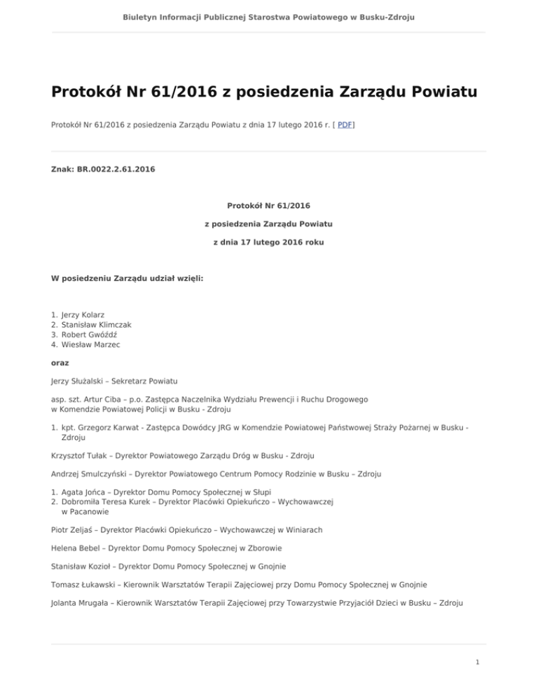 Protokół Nr 61/2016 z posiedzenia Zarządu Powiatu