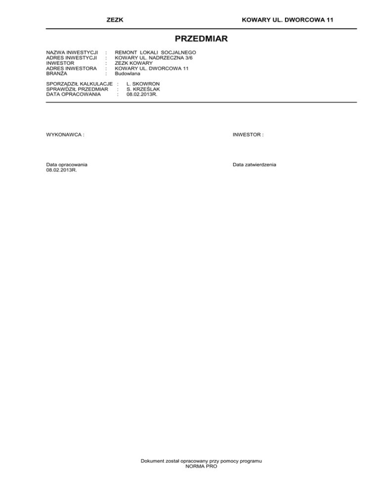 ZEZK KOWARY UL. DWORCOWA 11 PRZEDMIAR NAZWA INWESTYCJI ADRES INWESTYCJI INWESTOR ADRES INWESTORA BRANŻA : : : : : REMONT LOKALI SOCJALNEGO KOWARY UL. NADRZECZNA 3/6 ZEZK KOWARY KOWARY UL. DWORCOWA 11 Budowlana SPORZĄDZIŁ KALKULACJE : SPRAWDZIŁ PRZEDMIAR : DATA OPRACOWANIA : L. SKOWRON S. KRZEŚLAK 08.02.2013R. WYKONAWCA : INWESTOR : Data opracowania 08.02.2013R. Data zatwierdzenia Dokument został opracowany przy pomocy programu NORMA PRO NADRZECZNA 3 L M 6.PRD Lp. Podstawa 1 45111300-1 1 KNR-W 4-01 d.1 0701-05 2 KNR 4-04 (U) d.1 1101-02 3 KNR-W 4-01 d.1 0439-02 4 KNR-W 4-01 d.1 0818-05 5 KNR 4-04 (U) d.1 1101-05 2 45311200-2 6 KNR-W 4-03 d.2 0510-01 OBMIAR Opis i wyliczenia j.m. Roboty rozbiórkowe Odbicie tynków wewnętrznych z zaprawy cementowo-wapiennej na ścianach, m2 filarach, pilastrach o powierzchni odbicia ponad 5 m2 2.97*2*1.0+4.09*2*1.0 m2 Wywóz gruzu z terenu rozbiórki samochodami skrzyniowymi do 5 t na odleg- m3 łość 1 km, przy ręcznym załadunku i wyładunku (warunki utrudnione) 1.56 m3 Rozebranie podłóg drewnianych białych m2 2.97*4.09 m2 Zerwanie posadzki z tworzyw sztucznych m2 12.147 m2 Wywóz gruzu z terenu rozbiórki na odległość 1 km - dopłata za każdy dalszy m3 rozpoczęty 1 km transportu gruzu samochodami skrzyniowymi do 5 t (warunki utrudnione) Krotność = 5 14.12*0.04+1.0 m3 Roboty w zakresie instalacji elektrycznych Wymiana osprzętu modułowego szynowego - wyłącznik nadprądowy 1-biegunowy 3 Poszcz Razem 14.120 RAZEM 14.120 1.560 RAZEM 1.560 12.147 RAZEM 12.147 12.147 RAZEM 12.147 1.565 RAZEM 1.565 3.000 RAZEM 3.000 3.000 RAZEM 3.000 8.000 RAZEM 8.000 1.000 RAZEM 1.000 szt. szt. 7 BCA 53-11-12 Wypust oświetleniowy w budynku mieszkalnym, w pomieszczeniu mieszkal- szt. d.2 nym wykonany przewodem YDY n/t, na podłożu z cegły Zakres robót: 1. Wytrasowanie linii. 2. Wykonanie przejść przez ściany i stropy z założeniem przepustów. 3. Ułożenie i umocowanie przewodów do przygotowanego podłoża 4. Mocowanie puszek i osprzętu wraz z przygotowaniem podłoża. 5. Przygotowanie końcówek przewodów oraz ich podłączenie. 6. Przedzwonienie przewodów. 7. Umocowanie haczyków sufitowych pod oprawy lub przygotowanie podłoża pod mocowanie oprawy. 8. Pomiar obwodu. Przedmiaru (obmiaru) wypustów dokonuje się w sztukach. Ilość wypustów przyjmuje się na podstawie rysunków roboczych lub obmiaru w obiekcie budowlanym. Jako ilość wypustów oświetleniowych na wyłącznik, przełącznik, przycisk "światło" przyjmuje się ilość opraw oświetleniowych, a nie ilość łączników. Odcinki obwodów odchodzących od tablic rozdzielczych, wspólnych są ujęte proporcjonalnie w częściach przypadających na każdy wypust. 3 szt. 8 BCA 53-21-12 Wypust na gniazdo wtykowe 2x2P+Z lub 2P+Z wykonany przewodem YDY d.2 n/t na podłożu cegła w budynku mieszkalnym lub użyteczności publicznej szt. Zakres robót: 1. Wytrasowanie linii. 2. Wykonanie przejść przez ściany i stropy z założeniem niezbędnych przepustów. 3. Ułożenie i umocowanie przewodów na przygotowanym podłożu. 4. Montaż puszek oraz gniazda wtykowego wraz z przygotowaniem podłoża. 5. Przygotowanie końcówek przewodów oraz ich podłączenie. 6. Przedzwonienie przewodów. 7. Pomiar obwodu. Przedmiaru (obmiaru) robót dokonuje się w sztukach wypustów. Ilości wypustów przyjmuje się na podstawie rysunków roboczych lub obmiaru w obiekcie budowlanym. Jako ilość wypustów dla wypustów na gniazdo wtykowe przyjmuje się ilość gniazd wtykowych pojedynczych lub wielokrotnych (stanowiących jeden aparat). Odcinki obwodów odchodzących od tablic rozdzielczych, wspólnych dla kilku wypustów, są ujęte proporcjonalnie w częściach przypadających na każdy wypust. 8 szt. 9 BCA 51-21-12 Tablica licznikowa prefabrykowana do zabezpieczeń modułowych typu "S" d.2 TLR-3F z wyłącznikami 3xS301B 10-20A szt. Zakres robót: 1. Przygotawanie podłoża pod montaż tablicy licznikowej 1-fazowej. 2. Zamocowanie wyłączników. 3. Montaż tablicy. 4. Podłączenie i oznaczenie przewodów. 5. Opisanie tablicy. Przedmiaru (obmiaru) rozdzielnic dokonuje się w kompletach. Ilość kompletów przyjmuje się na podstawie dokumentacji technicznej lub obmiaru w obiekcie budowlanym. 1 szt. 3 45421130-4 Instalowanie drzwi i okien -2- Norma PRO Wersja 4.36 Nr seryjny: 6097 NADRZECZNA 3 L M 6.PRD OBMIAR Lp. Podstawa Opis i wyliczenia j.m. 10 BCA 34-11-25 Montaż okien z PVC z profili pięcio- lub sześciokomorowych z zestawem m2 d.3 szyb o współczynniku przenikania ciepła <1,1 W/(m2*K), białych, z okuciami obwiedniowymi o pow. do 2,0 m2 Zakres robót: 1. Obsadzenie ościeżnic z izolacją termiczną i uszczelnieniem ich w otworach. 2. Montaż podokienników stalowych i wykonanie obróbek blacharskich. Przedmiaru (obmiaru) okien z PVC dokonuje się w metrach kwadratowych (m2) ich powierzchni obliczanej w świetle obsadzanych ościeżnic. 1.17*2.18*3 m2 11 KNR 2-02 d.3 1015-01 12 KNR 2-02 d.3 1015-06 Montaż ościeżnic drewnianych zewnętrznych szt. 1 szt. Montaż skrzydeł drzwiowych, zewnętrznych, klepkowych o pow. ponad 1,0 m2 2.2 m2 4 45450000-6 Roboty budowlane wykończeniowe, pozostałe roboty zduńskie 13 KNR-W 2-02 Kuchnia przenośna stalowa na opał stały prawa d.4 1304-01analogia 1 m2 16 KNR-W 4-02 d.6 0212-06 17 KNR-W 4-02 d.6 0128-01 18 KNR-W 4-02 d.6 0111-01 19 KNR INSTAL d.6 0110-01 szt. Roboty instalacyjne wodno-kanalizacyjne i sanitarne Wymiana zlewozmywaka blaszanego emaliowanego, ze stali nierdzewnej lub szt. z tworzyw sztucznych na szafce 1 szt. Wymiana podejścia z rur z PVC o śr. 50 mm łączonych metodą wciskową msc. Obmiar dodatkowy - łączna długość 1.0 m 1 msc. Wymiana zaworu czerpalnego ( wypływowego ) o śr. 15 mm szt. 1 szt. 7.652 RAZEM 7.652 1.000 RAZEM 1.000 2.200 RAZEM 2.200 1.000 RAZEM 1.000 14.120 RAZEM 14.120 1.000 RAZEM 1.000 1.000 1.000 RAZEM 1.000 1.000 RAZEM 1.000 Wymiana podejścia dopływowego do zaworu czerpalnego, hydrantu lub bate- s