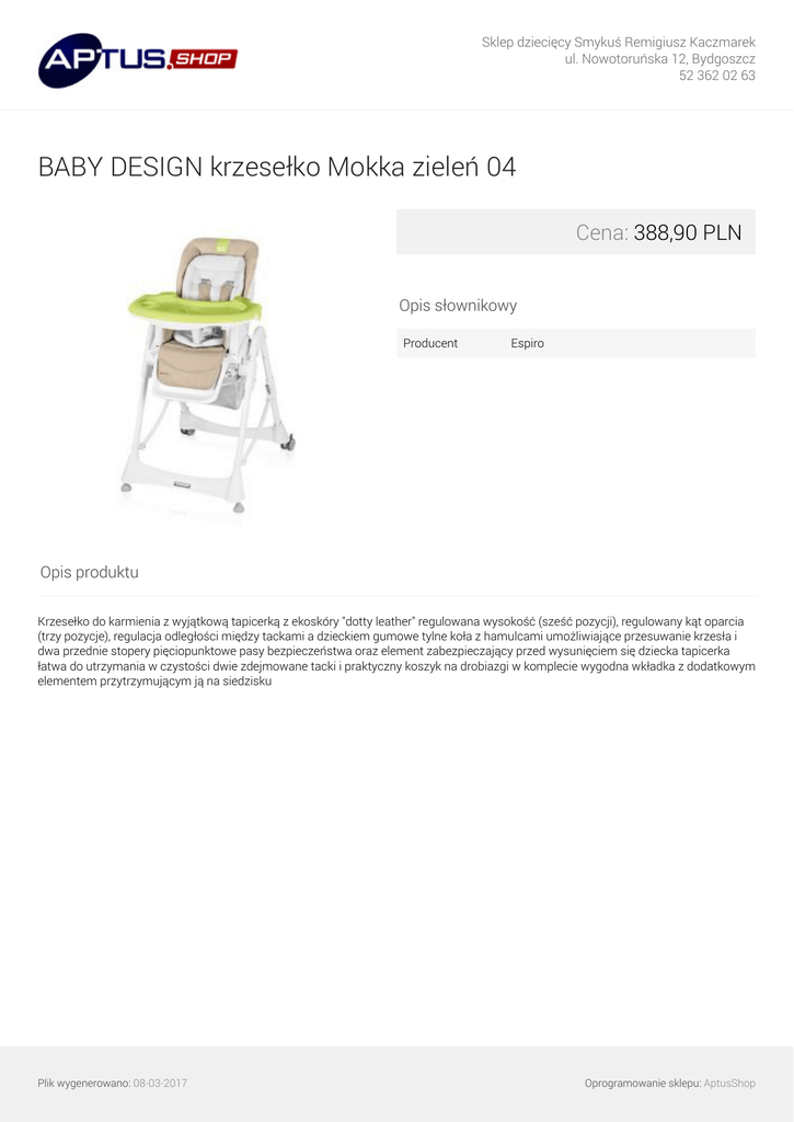 Sklep dziecięcy Smykuś Remigiusz Kaczmarek ul. Nowotoruńska 12, Bydgoszcz 52 362 02 63 BABY DESIGN krzesełko Mokka zieleń 04 Cena: 388,90 PLN Opis słownikowy Producent Espiro Opis produktu Krzesełko do karmienia z wyjątkową tapicerką z ekoskóry "dotty leather" regulowana wysokość (sześć pozycji), regulowany kąt oparcia (trzy pozycje), regulacja odległości między tackami a dzieckiem gumowe tylne koła z hamulcami umożliwiające przesuwanie krzesła i dwa przednie stopery pięciopunktowe pasy bezpieczeństwa oraz element zabezpieczający przed wysunięciem się dziecka tapicerka łatwa do utrzymania w czystości dwie zdejmowane tacki i praktyczny koszyk na drobiazgi w komplecie wygodna wkładka z dodatkowym elementem przytrzymującym ją na siedzisku Plik wygenerowano: 08-03-2017 Powered by TCPDF (www.tcpdf.org) Oprogramowanie sklepu: AptusShop