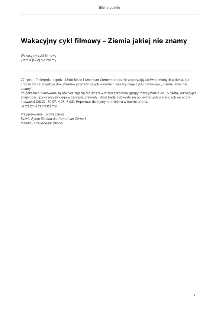 Biblio Lublin Wakacyjny cykl filmowy – Ziemia jakiej nie znamy Wakacyjny cykl filmowy Ziemia jakiej nie znamy 27 lipca – 7 sierpnia, o godz. 12:00 Biblio i American Corner serdecznie zapraszają zarówno młodych widzów, jak i rodziców na projekcje dokumentów przyrodniczych w ramach wakacyjnego cyklu filmowego „Ziemia jakiej nie znamy”. Po pokazach planowane są również zajęcia dla dzieci w wieku szkolnym (grupy maksymalnie do 15 osób), rozwijające znajomość języka angielskiego w zakresie przyrody, które będą odbywały się po wybranych projekcjach we wtorki i czwartki (28.07, 30.07, 4.08, 6.08). Repertuar dostępny na miejscu w formie ulotek. Serdecznie zapraszamy! Przygotowanie i prowadzenie: Sylwia Rytko-Siodłowska (American Corner) Monika Durska-Sasik (Biblio) 1