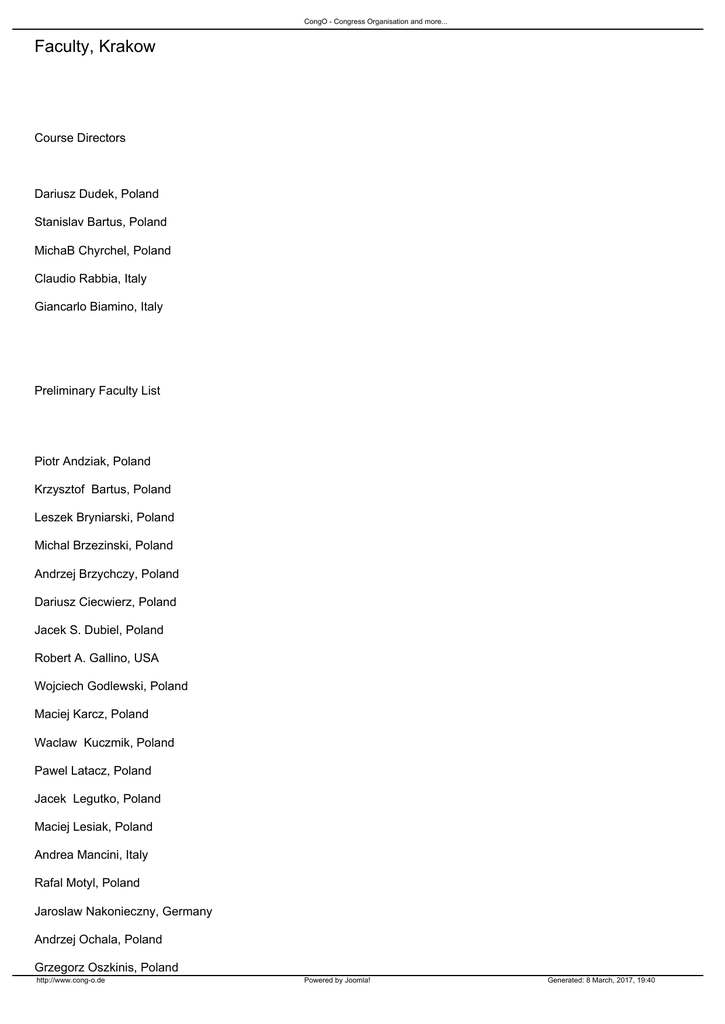 CongO - Congress Organisation and more... Faculty, Krakow Course Directors Dariusz Dudek, Poland Stanislav Bartus, Poland MichaB Chyrchel, Poland Claudio Rabbia, Italy Giancarlo Biamino, Italy Preliminary Faculty List Piotr Andziak, Poland Krzysztof Bartus, Poland Leszek Bryniarski, Poland Michal Brzezinski, Poland Andrzej Brzychczy, Poland Dariusz Ciecwierz, Poland Jacek S. Dubiel, Poland Robert A. Gallino, USA Wojciech Godlewski, Poland Maciej Karcz, Poland Waclaw Kuczmik, Poland Pawel Latacz, Poland Jacek Legutko, Poland Maciej Lesiak, Poland Andrea Mancini, Italy Rafal Motyl, Poland Jaroslaw Nakonieczny, Germany Andrzej Ochala, Poland Grzegorz Oszkinis, Poland http://www.cong-o.de Powered by Joomla! Generated: 8 March, 2017, 19:40 CongO - Congress Organisation and more... Paolo Pantaleo, Italy Piotr Pieniazek, Poland Radoslaw Pietura, Poland Tadeusz PrzewBocki, Poland Piotr Przybylowski, Poland Zoltan Ruzsa, Poland Jerzy Sadowski, Poland Daniele Savio, Italy Wojciech SkibiDski, Poland Agnieszka Slowik, Poland Lukasz Tekieli, Poland Carlo Trani, Italy Mariusz TrystuBa, Poland Tomasz Urbanek, Poland Adam Uryniak, Poland Wojciech Zajdel, Poland Krzysztof Zmudka, Poland Tomasz Zubilewicz, Poland http://www.cong-o.de Powered by Joomla! Generated: 8 March, 2017, 19:40