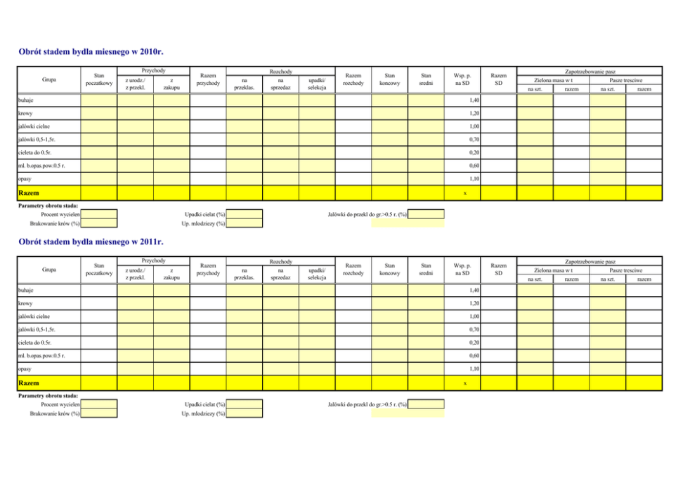 Obrót stadem bydla miesnego w 2010r. Grupa Stan poczatkowy Przychody z urodz./ z przekl. z zakupu Razem przychody Rozchody na przeklas. na sprzedaz upadki/ selekcja Razem rozchody Stan koncowy Stan sredni Wsp. p. na SD Razem SD Zapotrzebowanie pasz Zielona masa w t na szt. buhaje 1,40 krowy 1,20 jalówki cielne 1,00 jalówki 0,5-1,5r. 0,70 cieleta do 0.5r. 0,20 ml. b.opas.pow.0.5 r. 0,60 opasy 1,10 Razem razem Pasze tresciwe na szt. razem x Parametry obrotu stada: Procent wycielen Upadki cielat (%) Brakowanie krów (%) Up. mlodziezy (%) Jalówki do przekl do gr.>0.5 r. (%) Obrót stadem bydla miesnego w 2011r. Grupa Stan poczatkowy Przychody z urodz./ z przekl. z zakupu Razem przychody Rozchody na przeklas. na sprzedaz upadki/ selekcja Razem rozchody Stan koncowy Stan sredni Wsp. p. na SD 1,40 krowy 1,20 jalówki cielne 1,00 jalówki 0,5-1,5r. 0,70 cieleta do 0.5r. 0,20 ml. b.opas.pow.0.5 r. 0,60 opasy 1,10 Razem x Parametry obrotu stada: Procent wycielen Upadki cielat (%) Up. mlodziezy (%) Zapotrzebowanie pasz Zielona masa w t na szt. buhaje Brakowanie krów (%) Razem SD Jalówki do przekl do gr.>0.5 r. (%) razem Pasze tresciwe na szt. razem Obrót stadem bydla miesnego w 2012r. Grupa Stan poczatkowy Przychody z urodz./ z przekl. z zakupu Razem przychody Rozchody na przeklas. na sprzedaz upadki/ selekcja Razem rozchody Stan koncowy Stan sredni Wsp. p. na SD Razem SD Zapotrzebowanie pasz Zielona masa w t na szt. buhaje 1,40 krowy 1,20 jalówki cielne 1,00 jalówki 0,5-1,5r. 0,70 cieleta do 0.5r. 0,20 ml. b.opas.pow.0.5 r. 0,60 opasy 1,10 Razem razem Pasze tresciwe na szt. razem x Parametry obrotu stada: Procent wycielen Upadki cielat (%) Brakowanie krów (%) Up. mlodziezy (%) Jalówki do przekl do gr.>0.5 r. (%) Obrót stadem bydla miesnego w 2013r. Grupa Stan poczatkowy Przychody z urodz./ z przekl. z zakupu Razem przychody Rozchody na przeklas. na sprzedaz upadki/ selekcja Razem rozchody Stan koncowy Stan sredni Wsp. p. na SD 1,40 krowy 1,20 jalówki cielne 1,00 jalówki 0,5-1,5r. 0,70 cieleta do 0.5r. 0,20 ml. b.opas.pow.0.5 r. 0,60 opasy 1,10 Razem x Parametry obrotu stada: Procent wycielen Upadki cielat (%) Up. mlodziezy (%) Zapotrzebowanie pasz Zielona masa w t na szt. buhaje Brakowanie krów (%) Razem SD Jalówki do przekl do gr.>0.5 r. (%) razem Pasze tresciwe na szt. razem Obrót stadem bydla miesnego w 2014r. Grupa Stan poczatkowy Przychody z urodz./ z przekl. z zakupu Razem przychody Rozchody na przeklas. na sprzedaz upadki/ selekcja Razem rozchody Stan koncowy Stan sredni Wsp. p. na SD 1,40 krowy 1,20 jalówki cielne 1,00 jalówki 0,5-1,5r. 0,70 cieleta do 0.5r. 0,20 ml. b.opas.pow.0.5 r. 0,60 opasy 1,10 Razem x Parametry obrotu stada: Procent wycielen Upadki cielat (%) Up. mlodziezy (%) Zapotrzebowanie pasz Zielona masa w t na szt. buhaje Brakowanie krów (%) Razem SD Jalówki do przekl do gr.>0.5 r. (%) razem Pasze tresciwe na szt. razem